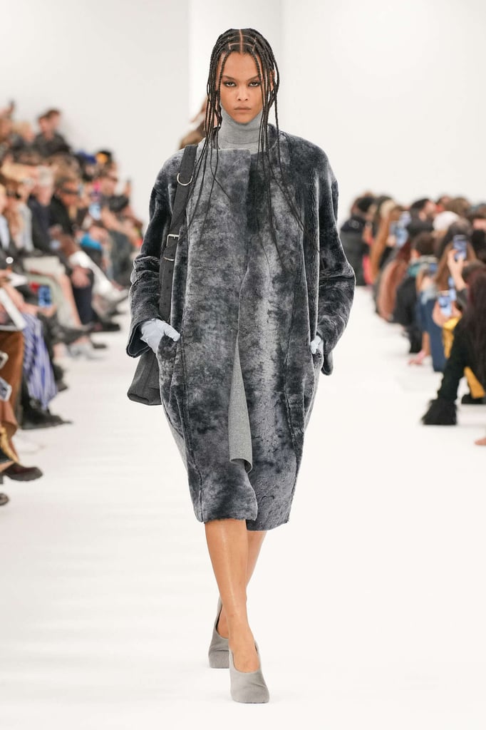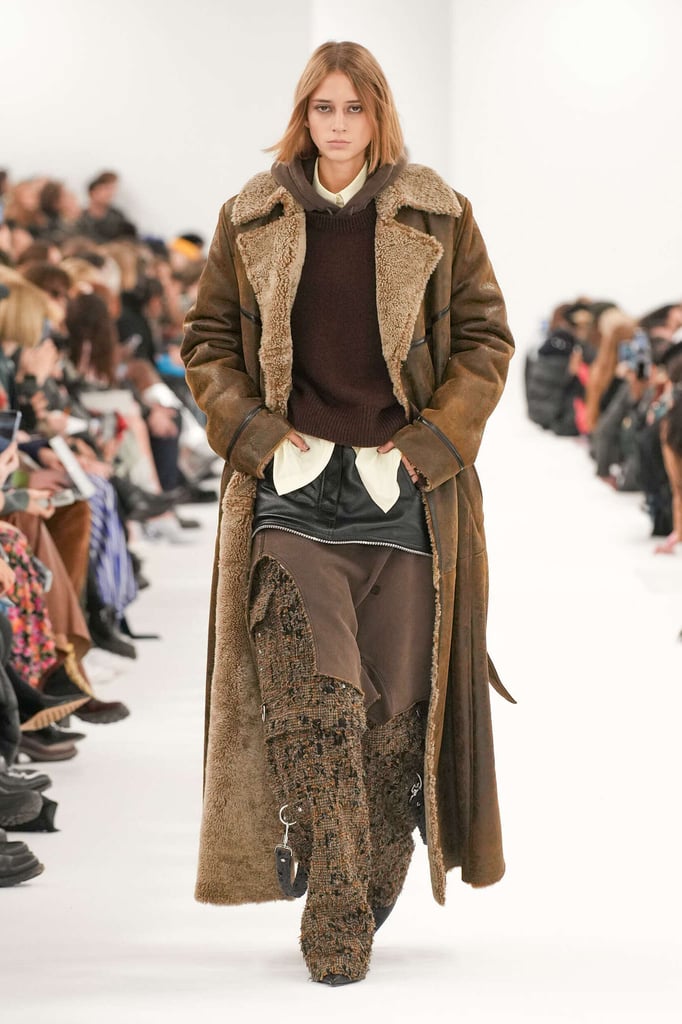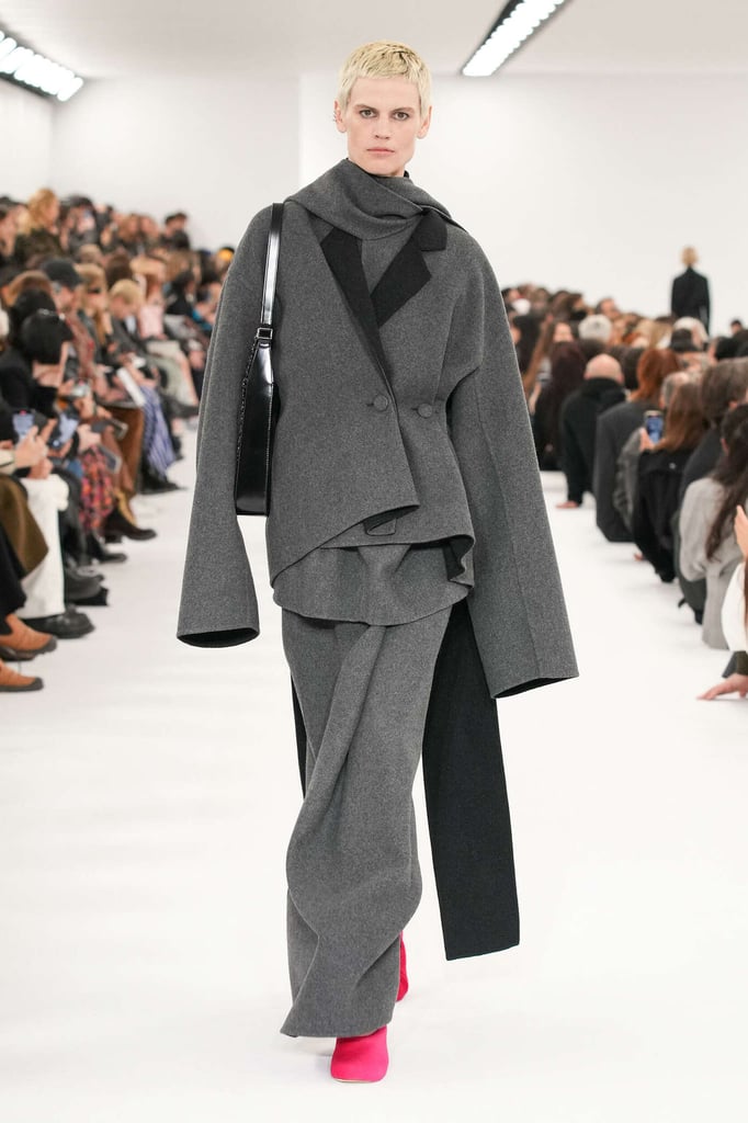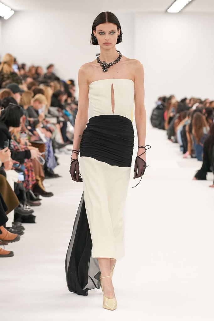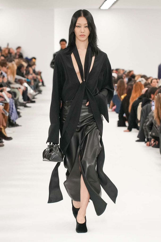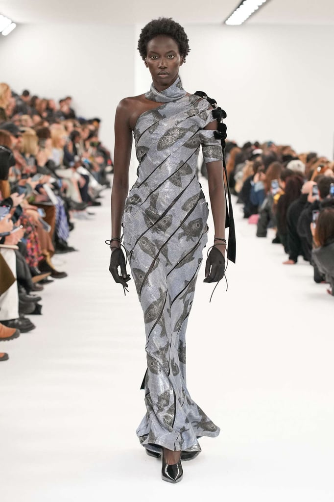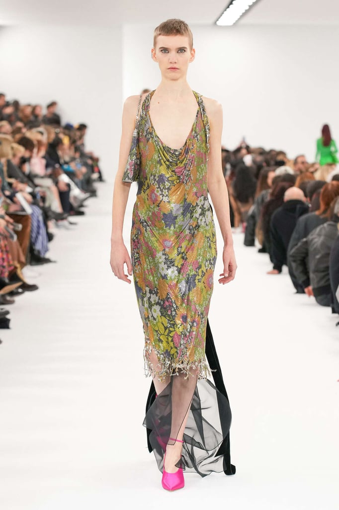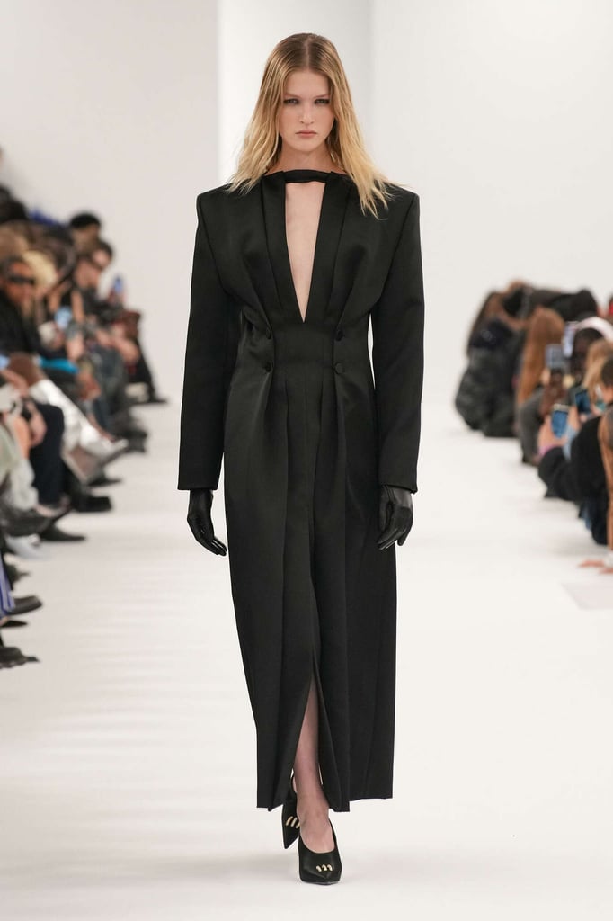 DEFILE GIVENCHY A L’ECOLE MILITAIRE: Le directeur artistique américain Matthew M. Williams a présenté une collection particulièrement élégante qui renoue avec l’identité de la maison française au travers de pièces couture revisitées dans un esprit contemporain. Le défile s’ouvre et se termine avec une série de looks en total noir, privilégiant les robes fourreaux qui embrassent les courbes du corps. Les silhouettes sont allongées par de maxi manteaux aux épaules carrées en drap de laine, velours ou cuir, par des manches qui recouvrent les mains, par des jupes fendues très haut sur la cuisse. Les modèles ras des fesses de vestes-robes carrurées s’étirent grâce à des traînes en tulle, tandis que des rubans flottants descendent délicatement du col de blouses en soie jusqu’aux pieds. Des touches de vert, jaune, crème viennent colorer cette collection à dominante sombre, très sexy avec des robes ultra légères en chiffon transparent rose ou mauve. Des motifs de poissons ou de fleurs, provenant des archives de la maison, ornent certains modèles. Ce vestiaire sophistiqué et glamour est complété par des pièces tailoring retravaillées dans les volumes et des modèles plus streetwear construits à partir de superpositions: blousons, sur-jupes, shorts, pantalons cargo.