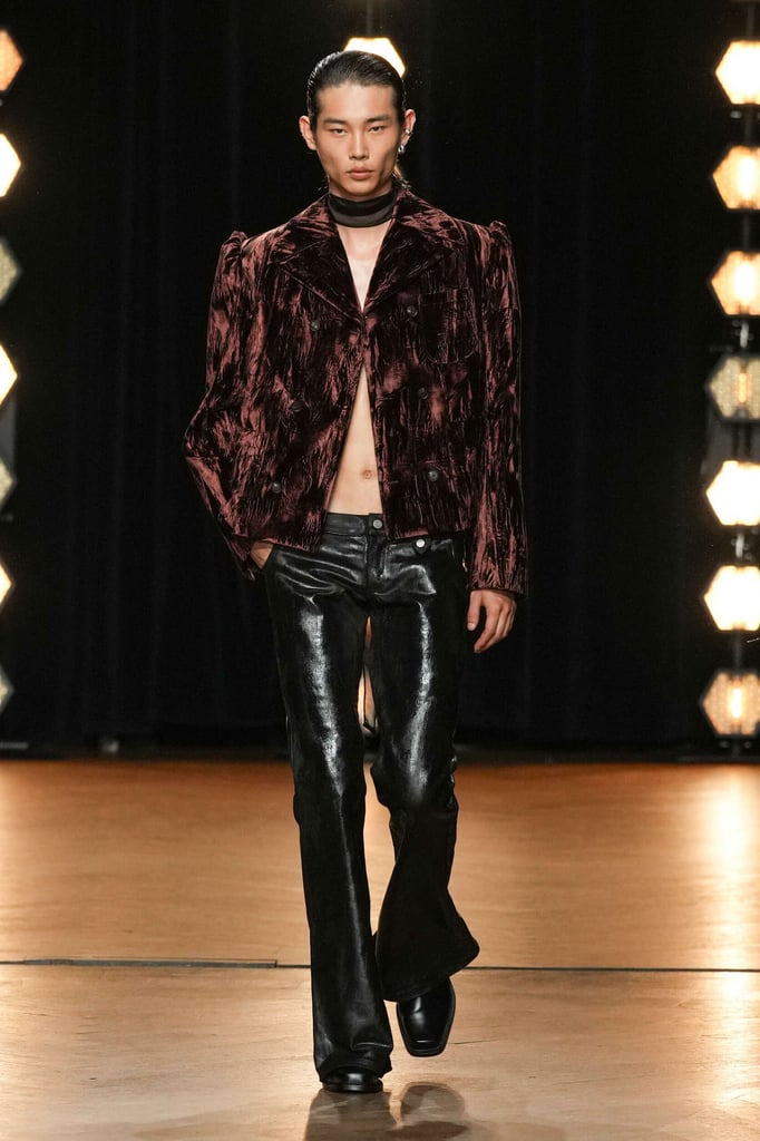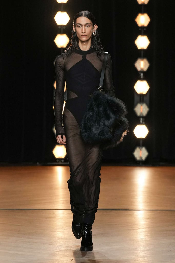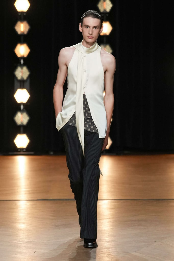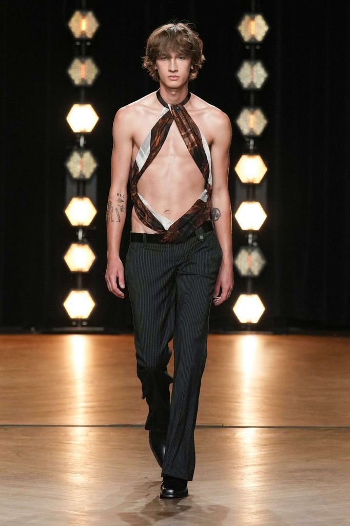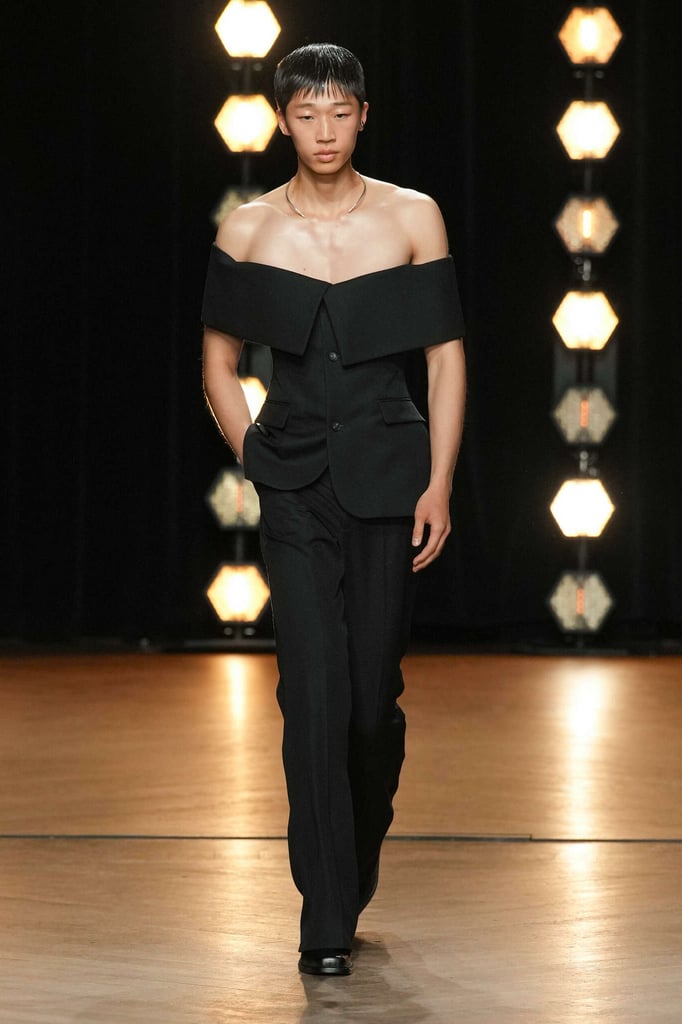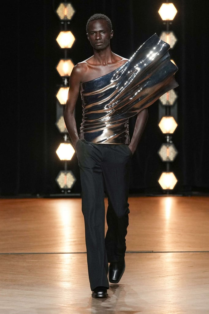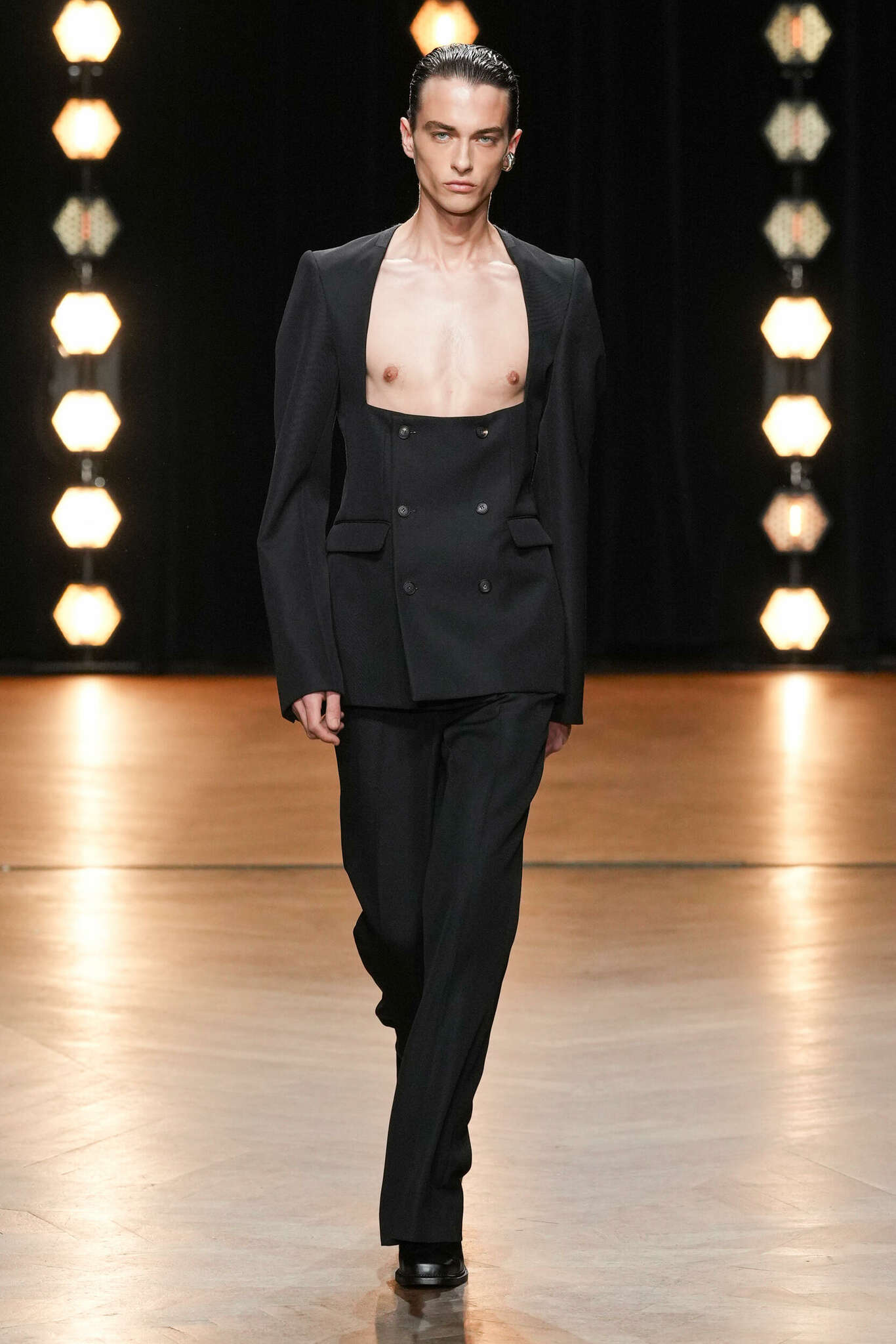 DEFILE EGONLAB A L’ELYSEE-MONTMARTRE: Le duo de créateurs Florentin Glémarec et Kévin Nompeix a présenté sa huitième collection, intitulée « Toute Première Fois », qui reste fidèle à l’univers de la marque. Les costumes sont omniprésents et se voient confrontés à la question des codes de genre traditionnels. Une veste noire de costume à coupe croisée avec un profond décolleté ouvre le défilé. Des foulards portés comme des paréos sont superposés. Certains tops s’inspirent de harnais. Une longue robe noire semi-transparente est d’une grande sensualité. Des mini-jupes plissées sont parfois glissées sur les pantalons et les jeans. Le style glam est assumé, avec des chemises en soie imprimées, des manteaux et des sacs en fourrure XXL, de longues gabardines structurées en cuir ou une combinaison courte et décolletée. La palette de couleurs est dominée par le noir, mais finit par laisser la place à des tons dorés, marron et cuivre. Le jean est également mis en scène avec différents délavages et des coupes taille basse. Une sculpture-corset asymétrique et tridimensionnelle à reflets métallisés vient clôturer le défilé en beauté.