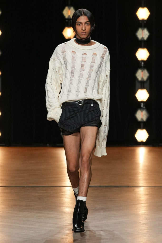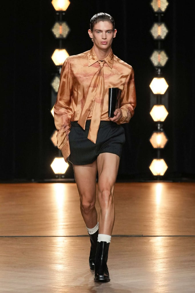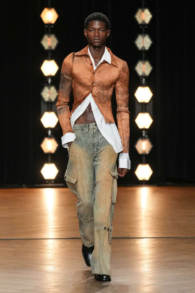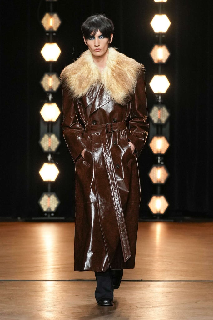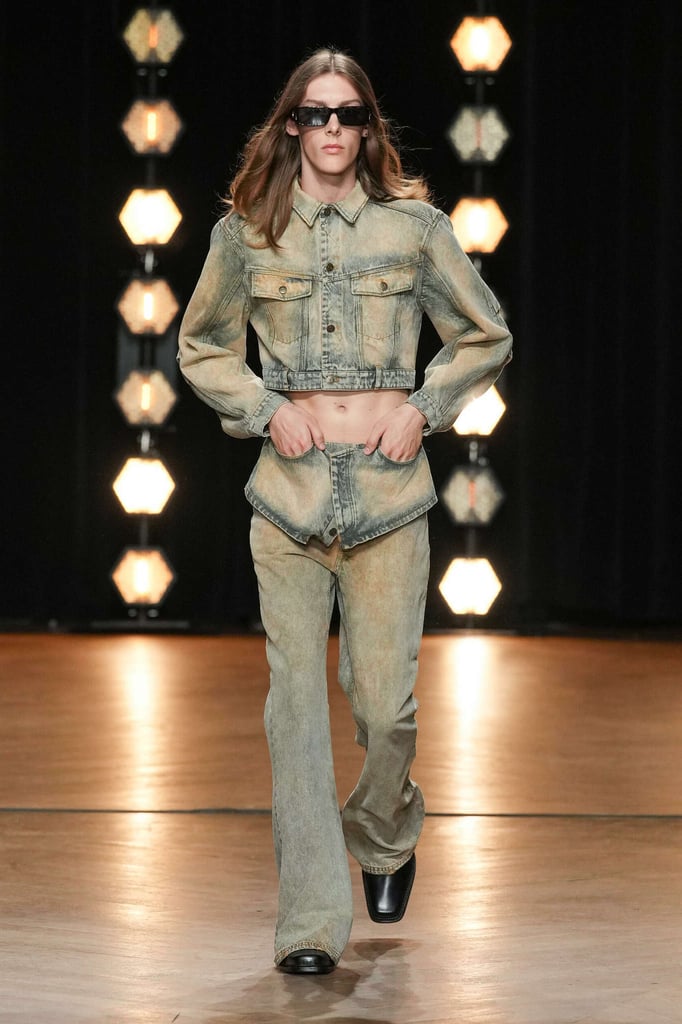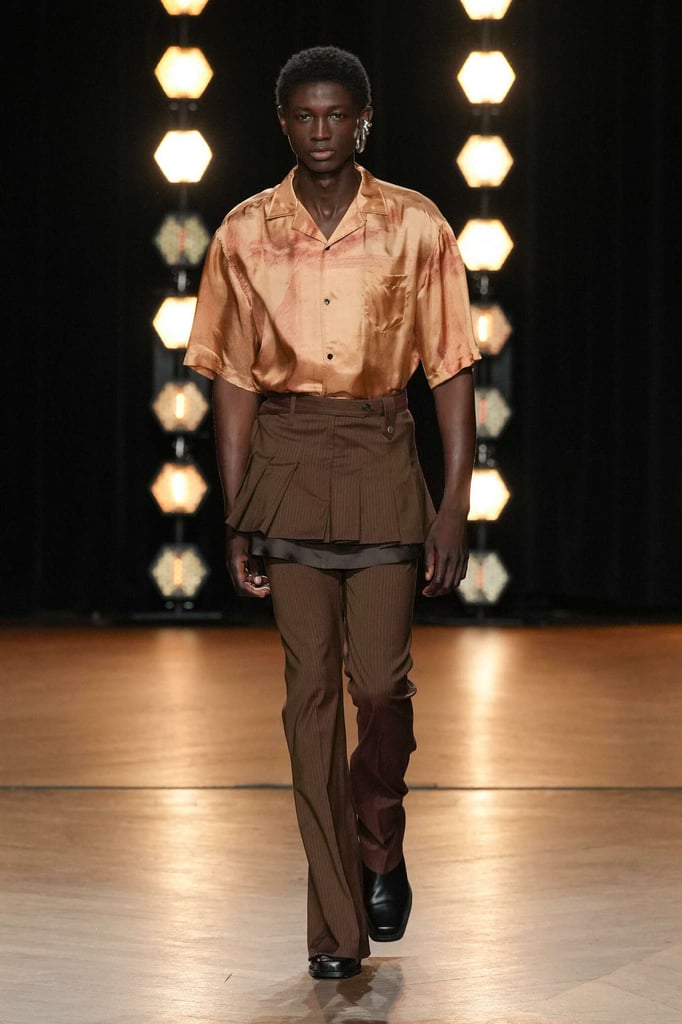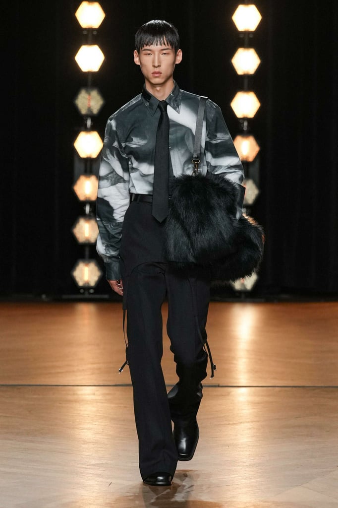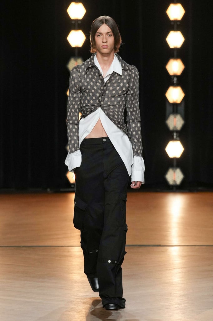 DEFILE EGONLAB A L’ELYSEE-MONTMARTRE: Le duo de créateurs Florentin Glémarec et Kévin Nompeix a présenté sa huitième collection, intitulée « Toute Première Fois », qui reste fidèle à l’univers de la marque. Les costumes sont omniprésents et se voient confrontés à la question des codes de genre traditionnels. Une veste noire de costume à coupe croisée avec un profond décolleté ouvre le défilé. Des foulards portés comme des paréos sont superposés. Certains tops s’inspirent de harnais. Une longue robe noire semi-transparente est d’une grande sensualité. Des mini-jupes plissées sont parfois glissées sur les pantalons et les jeans. Le style glam est assumé, avec des chemises en soie imprimées, des manteaux et des sacs en fourrure XXL, de longues gabardines structurées en cuir ou une combinaison courte et décolletée. La palette de couleurs est dominée par le noir, mais finit par laisser la place à des tons dorés, marron et cuivre. Le jean est également mis en scène avec différents délavages et des coupes taille basse. Une sculpture-corset asymétrique et tridimensionnelle à reflets métallisés vient clôturer le défilé en beauté.