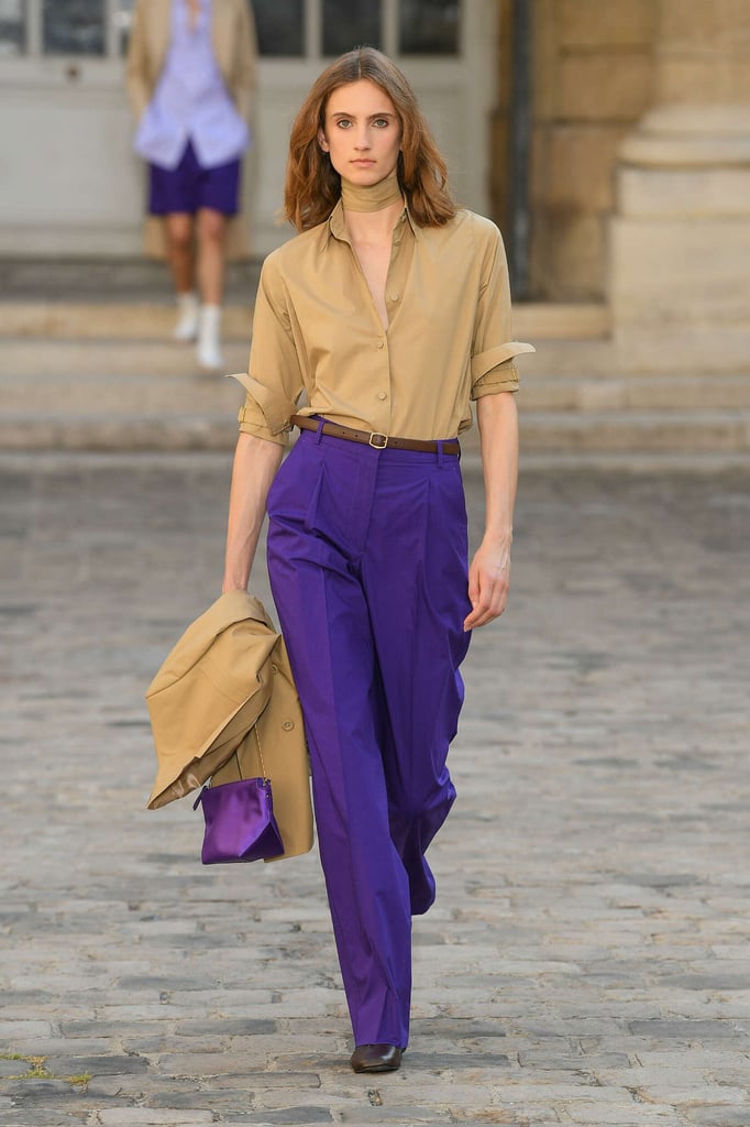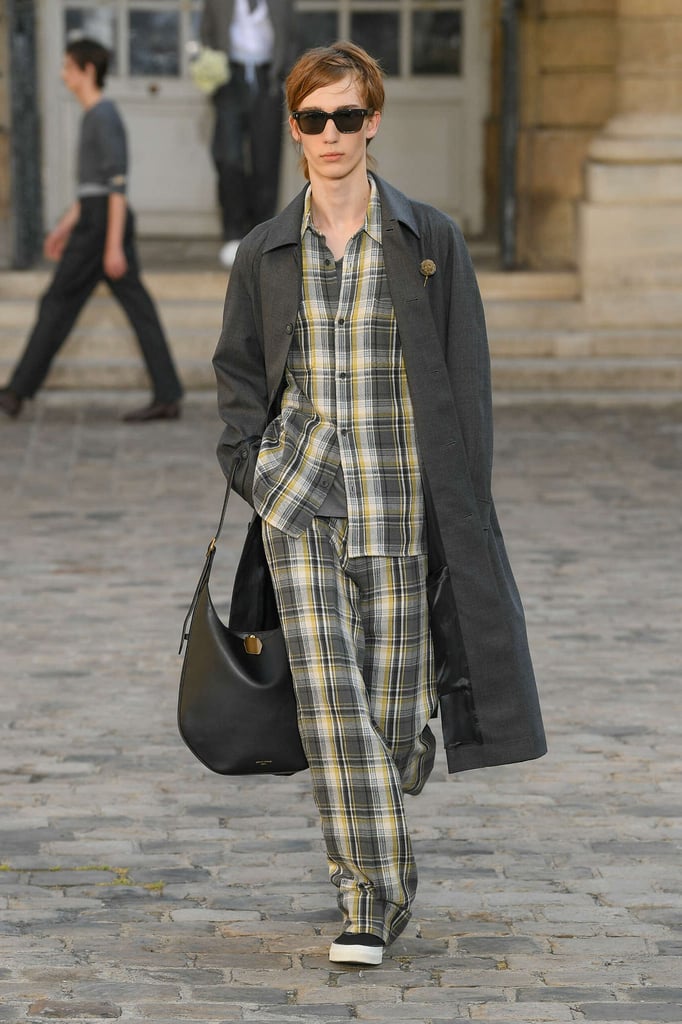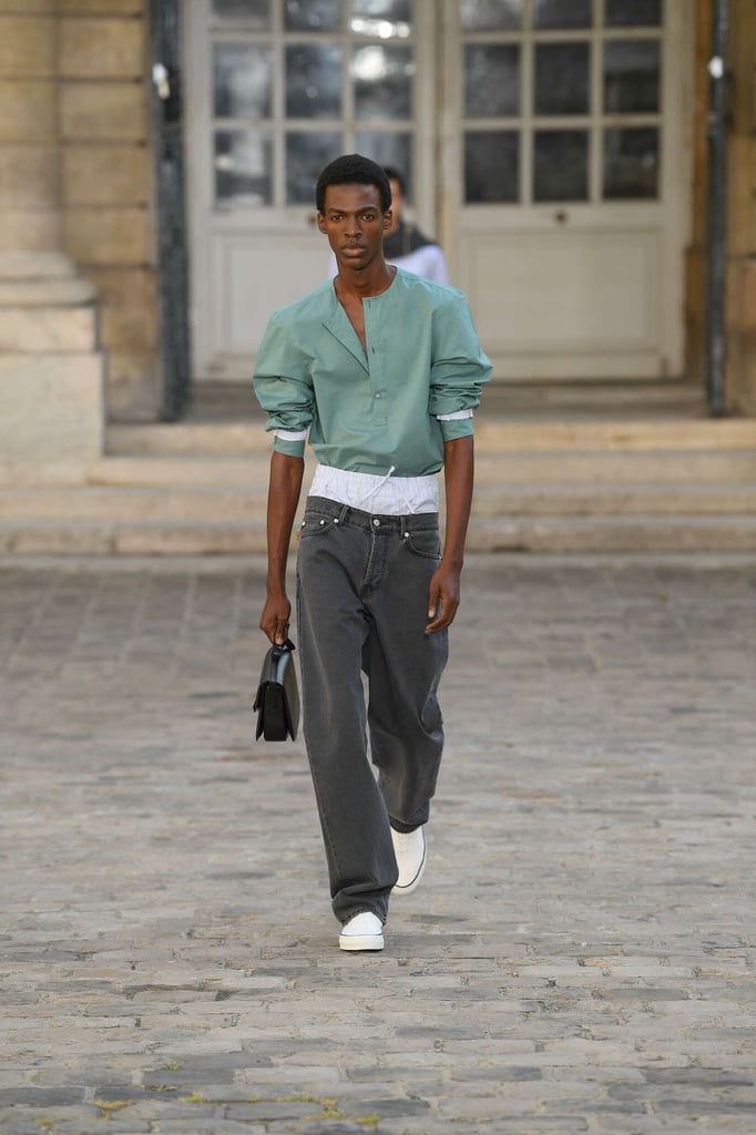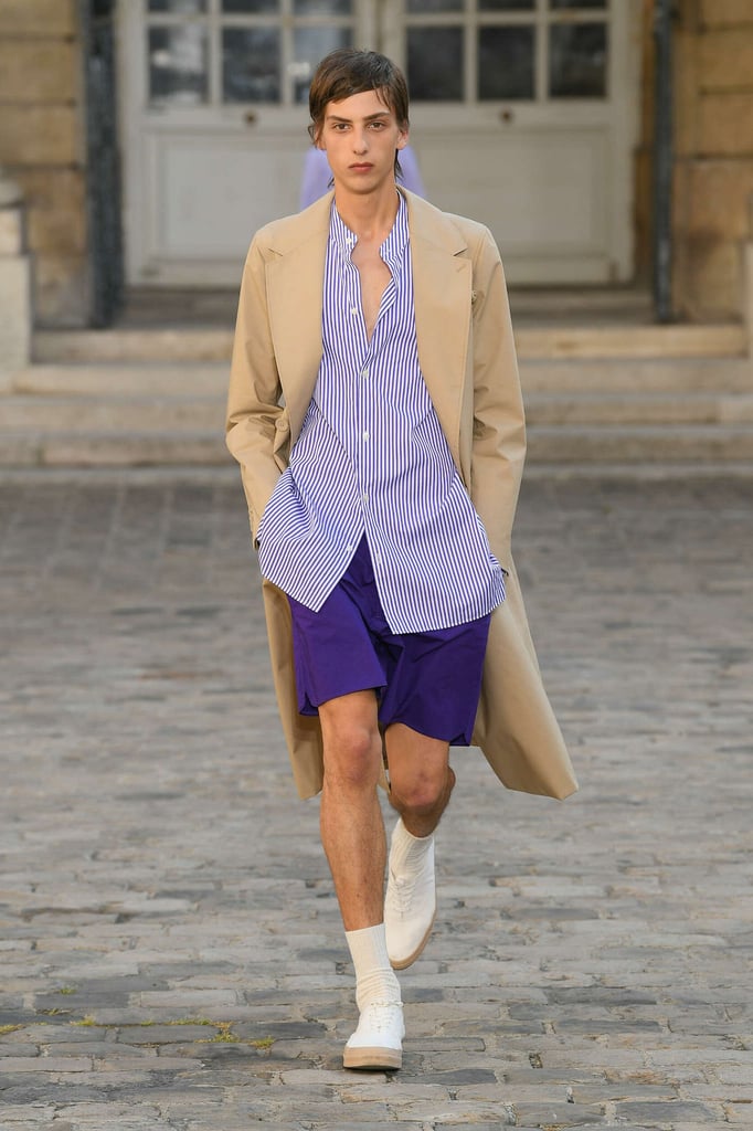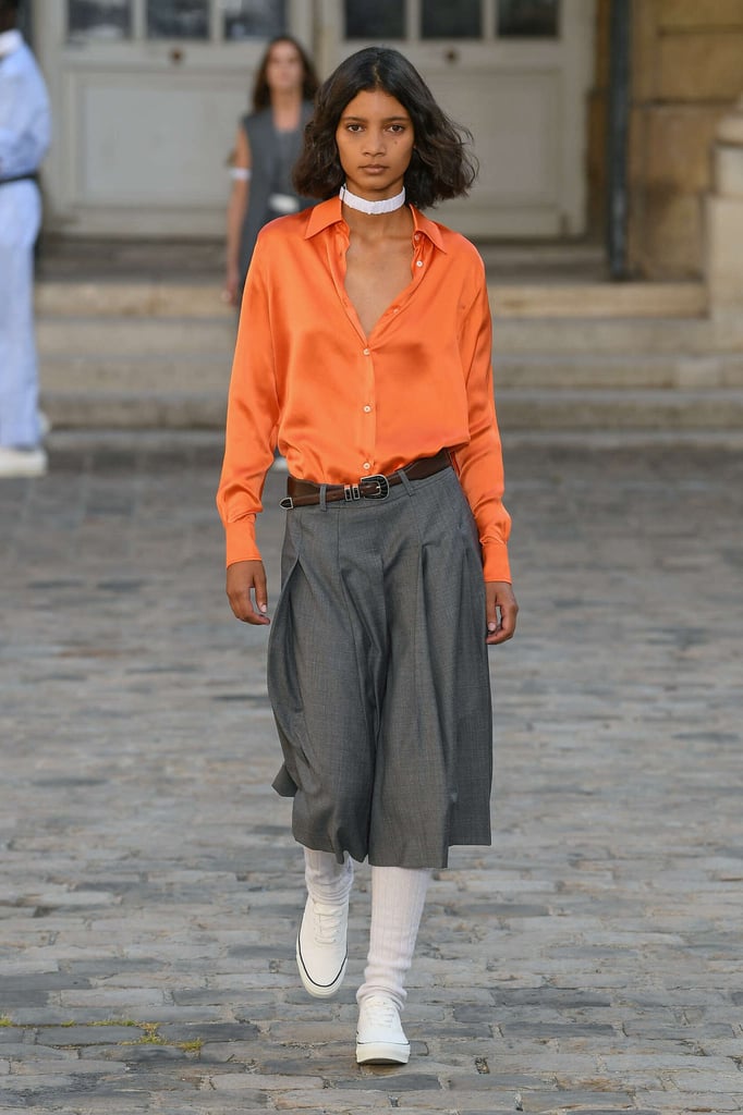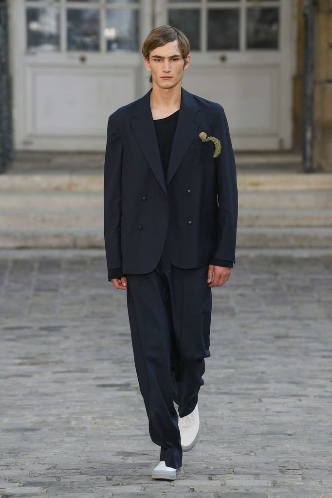 DEFILE OFFICINE GENERALE A LA MONNAIE DE PARIS: Le designer-fondateur de la marque, Pierre Mahéo, a présenté une nouvelle déclinaison de son univers parisien chic, tout en délicatesse pour l’homme et la femme. Il a travaillé des formes nouvelles, plus « loose », plus souples. Des vestes qui ressemblent à des vestes de smoking se combinent à des pantalons taille-élastique en popeline. Une attention toute particulière a été portée à la fluidité des matières et aux coupes. Les femmes portent des costumes dont les manches des vestes ont été ôtées, ou des ensembles chemise oversize et pantalon ample. Beaucoup d’unis, quelques imprimés all-over. Au-delà de la palette classique de gris, marine, blanc, kaki, un violet intense et un orange cuivré viennent animer la collection. Les fleurs séchées permettent d’habiller d’un rien la silhouette et se trouvent sur toutes les tenues, discrètes ou bien visibles: à la poche d’un manteau trois-quart bleu marine très fluide sur un cardigan au large col V en laine légère et un pantalon à pince taille haute ample, accrochée à un pull en laine noué autour du cou associé à une chemise à demi-patte de boutonnage, dans la poche arrière d’un denim ample gris porté avec une chemise kaki aux manches retroussées, ou même glissée dans des serre-chaussette. Un unique blouson en cuir noir est porté par un jeune dandy qui l’a associé à un short élégant mi-cuisse, des lunettes de soleil, un foulard en soie, des sneakers crème, et tient un bouquet de fleurs séchées sous le bras.
