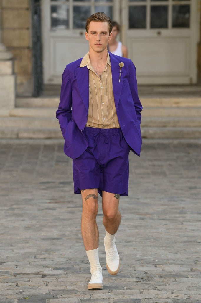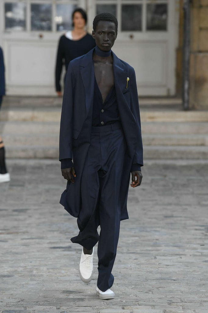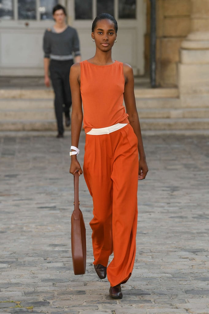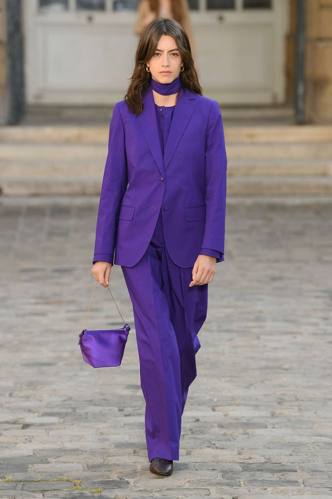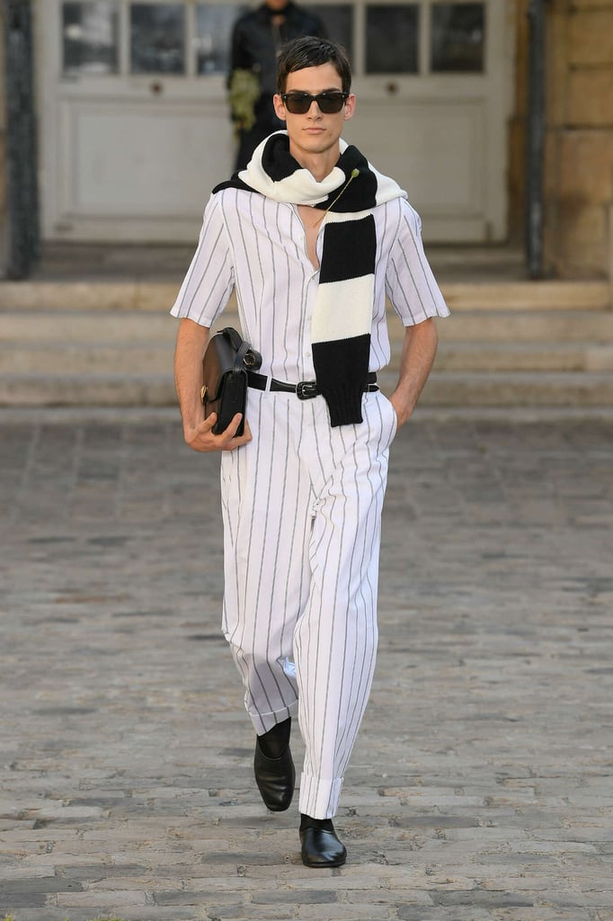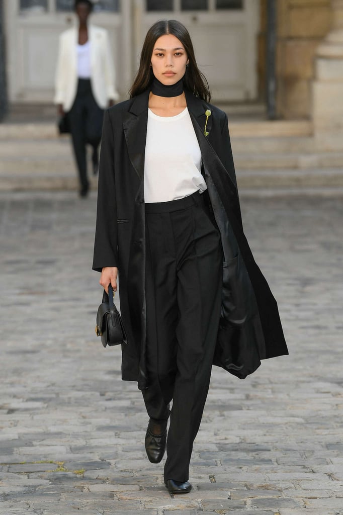 DEFILE OFFICINE GENERALE A LA MONNAIE DE PARIS: Le designer-fondateur de la marque, Pierre Mahéo, a présenté une nouvelle déclinaison de son univers parisien chic, tout en délicatesse pour l’homme et la femme. Il a travaillé des formes nouvelles, plus « loose », plus souples. Des vestes qui ressemblent à des vestes de smoking se combinent à des pantalons taille-élastique en popeline. Une attention toute particulière a été portée à la fluidité des matières et aux coupes. Les femmes portent des costumes dont les manches des vestes ont été ôtées, ou des ensembles chemise oversize et pantalon ample. Beaucoup d’unis, quelques imprimés all-over. Au-delà de la palette classique de gris, marine, blanc, kaki, un violet intense et un orange cuivré viennent animer la collection. Les fleurs séchées permettent d’habiller d’un rien la silhouette et se trouvent sur toutes les tenues, discrètes ou bien visibles: à la poche d’un manteau trois-quart bleu marine très fluide sur un cardigan au large col V en laine légère et un pantalon à pince taille haute ample, accrochée à un pull en laine noué autour du cou associé à une chemise à demi-patte de boutonnage, dans la poche arrière d’un denim ample gris porté avec une chemise kaki aux manches retroussées, ou même glissée dans des serre-chaussette. Un unique blouson en cuir noir est porté par un jeune dandy qui l’a associé à un short élégant mi-cuisse, des lunettes de soleil, un foulard en soie, des sneakers crème, et tient un bouquet de fleurs séchées sous le bras.