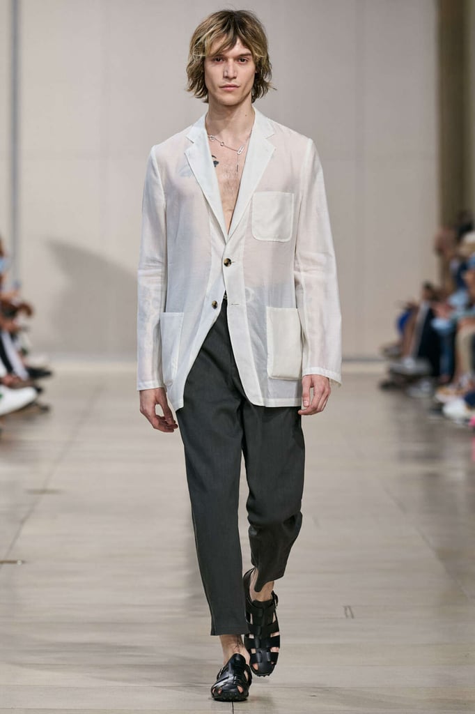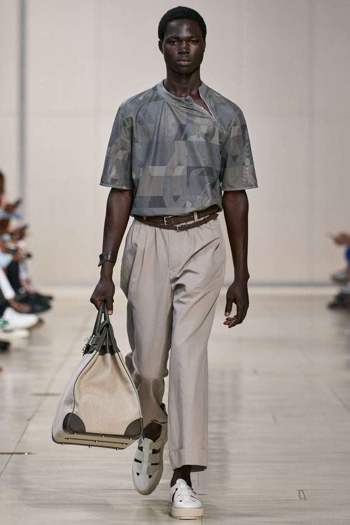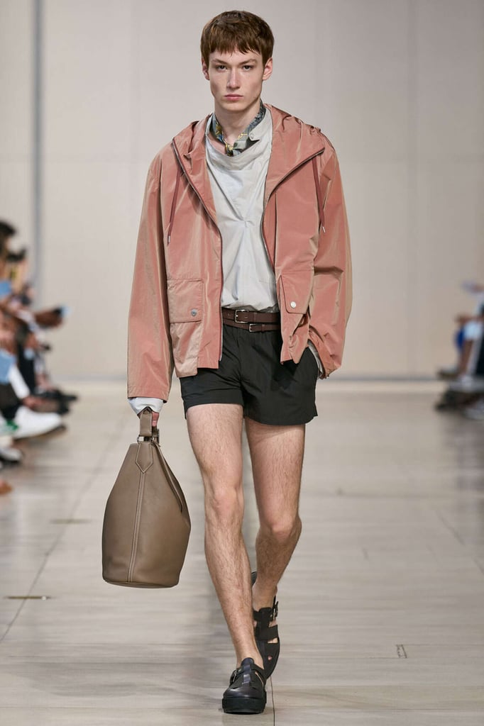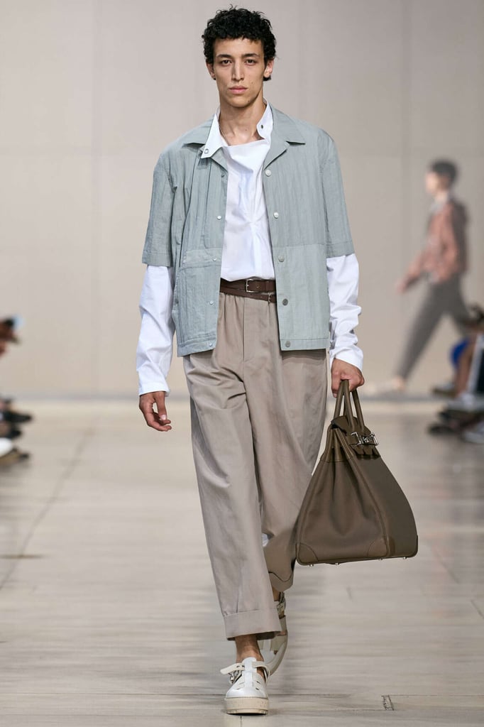 DEFILE HERMES AU PALAIS D’IENA: Pour cette nouvelle saison estivale, la directrice artistique des collections masculines, Véronique Nichanian, fait (enfin) entrer le short court dans son vestiaire et s’aventure sur le terrain du masculin/féminin. Le défilé s’ouvre sur des chemises transparentes, quadrillées de lignes blanches, qui voilent à peine la peau. Certains mannequins montrent leurs jambes, avec des shorts courts à taille élastique en cuir assortis à des blousons en veau nubuck perforé. Les pantalons en popeline de coton craquant sont larges, laissant les chevilles à l’air, tandis que les chemises à col soufflé en soie lavée bâillent sur le torse. Des vestes du soir en matière technique blanche forment un voile opaque sur la peau comme un papier-calque, la souplesse en plus. La collection élégante, aux finitions parfaites, se décline dans une palette sobre et restreinte de bleu délavé, gris brume, beige désert. Les sandales, qui ont des ouvertures sur les côtés mais couvrent les orteils, se veulent une alternative aux baskets.