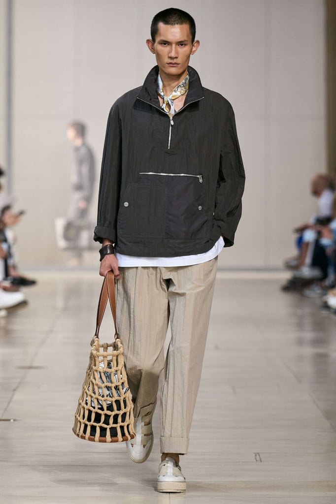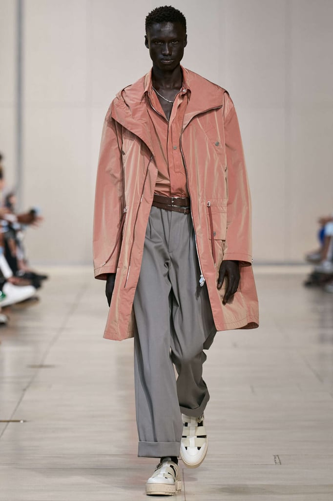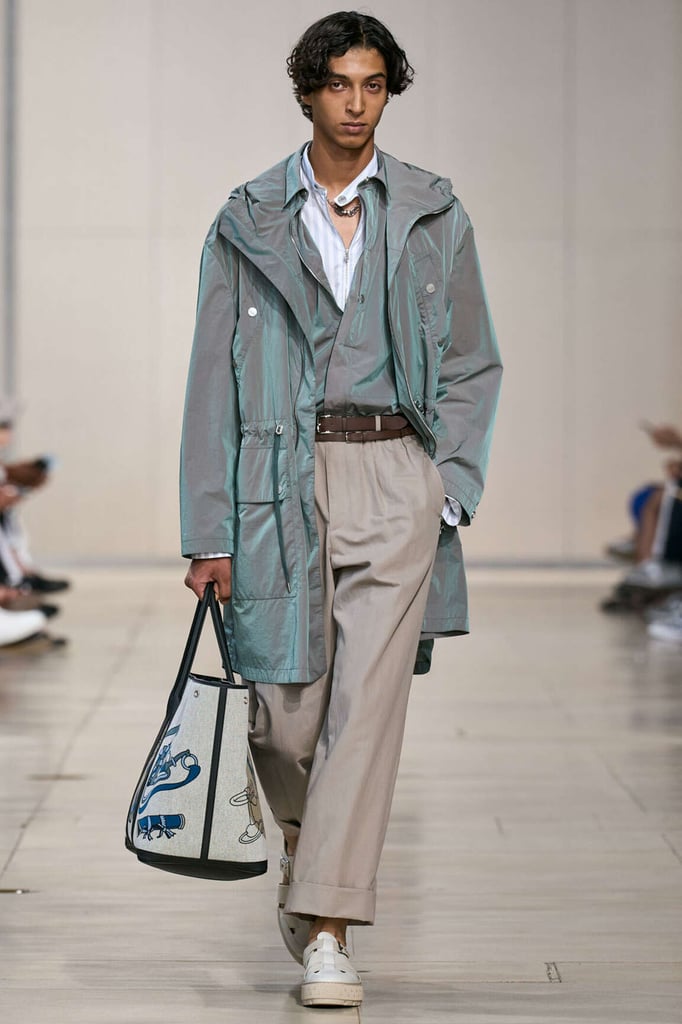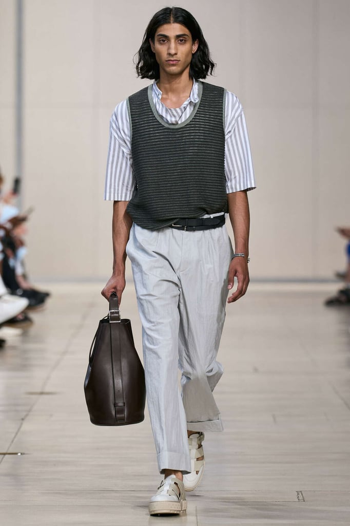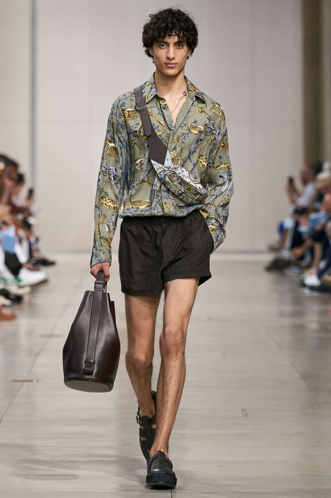 DEFILE HERMES AU PALAIS D’IENA: Pour cette nouvelle saison estivale, la directrice artistique des collections masculines, Véronique Nichanian, fait (enfin) entrer le short court dans son vestiaire et s’aventure sur le terrain du masculin/féminin. Le défilé s’ouvre sur des chemises transparentes, quadrillées de lignes blanches, qui voilent à peine la peau. Certains mannequins montrent leurs jambes, avec des shorts courts à taille élastique en cuir assortis à des blousons en veau nubuck perforé. Les pantalons en popeline de coton craquant sont larges, laissant les chevilles à l’air, tandis que les chemises à col soufflé en soie lavée bâillent sur le torse. Des vestes du soir en matière technique blanche forment un voile opaque sur la peau comme un papier-calque, la souplesse en plus. La collection élégante, aux finitions parfaites, se décline dans une palette sobre et restreinte de bleu délavé, gris brume, beige désert. Les sandales, qui ont des ouvertures sur les côtés mais couvrent les orteils, se veulent une alternative aux baskets.