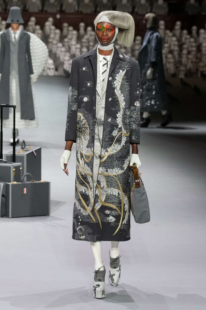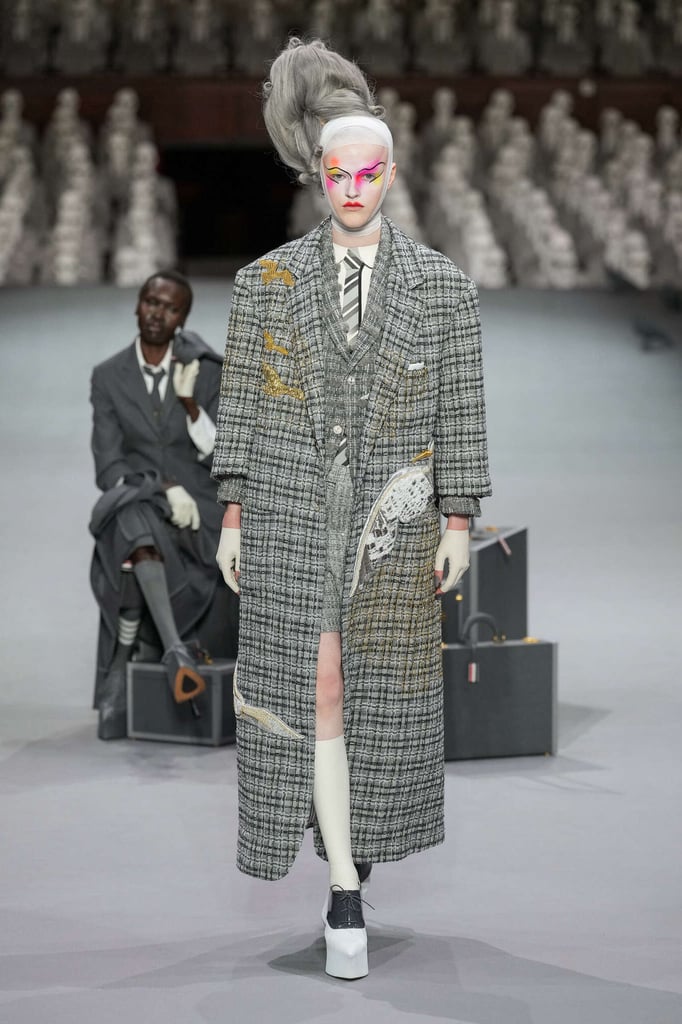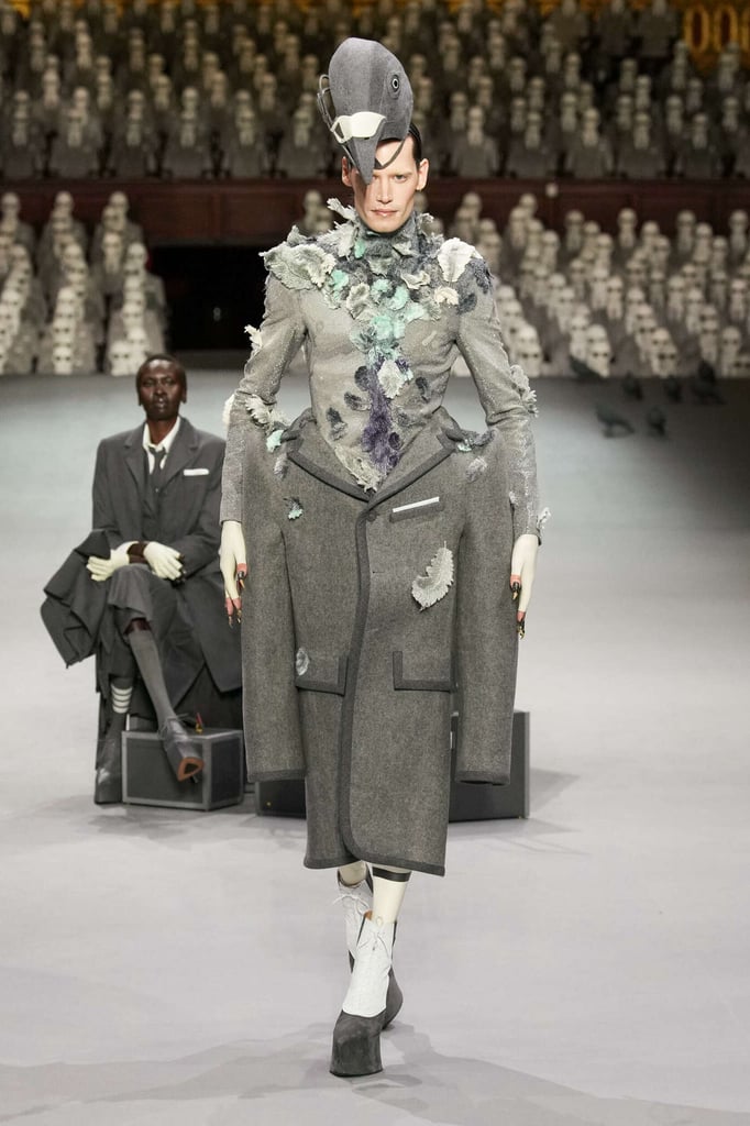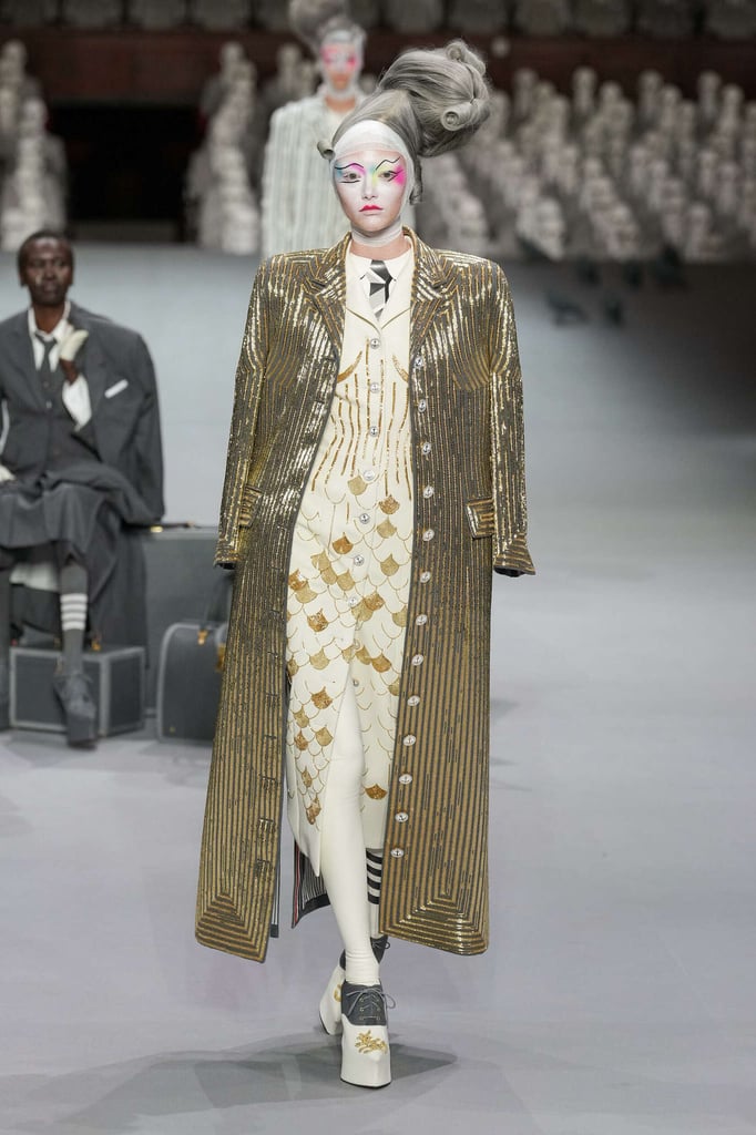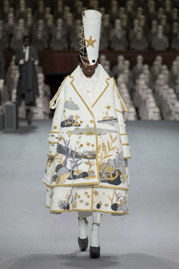 DEFILE THOM BROWNE AU PALAIS GARNIER: Le designer américain a présenté un show spectaculaire pour son premier défilé haute couture et le vingtième anniversaire de sa marque. Fidèle à sa couleur fétiche, le gris, il s’est lancé à fond dans les silhouettes et les ornements typiques de la haute couture. Il taille des manteaux en forme de cloche d’église avec chapeaux assortis, et imagine des manches gigantesques en forme d’ailes de papillon. Des fils de laine, de soie, utilisés comme des pinceaux, servent à dessiner sur les vêtements des paysages marins évoquant la Côte Est des Etats-Unis qui lui est chère. Un homard géant doré brodé s’agrippe le long de la colonne vertébrale, des sequins carrés reproduisent des crabes pixélisés, des bandeaux de tulle imbriqués et piqués de perles imitent le mouvement des vagues, des perles transparentes servent à dessiner des bancs de poissons. Le maquillage clownesque et les perruques baroques donnent à l’ensemble un côté théâtral et décalé. Tout en restant fidèle à son esthétique, Thom Browne insuffle à son travail une sophistication très parisienne.