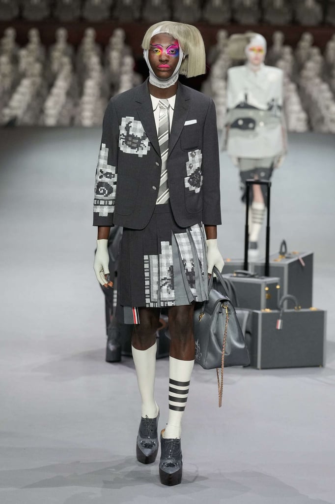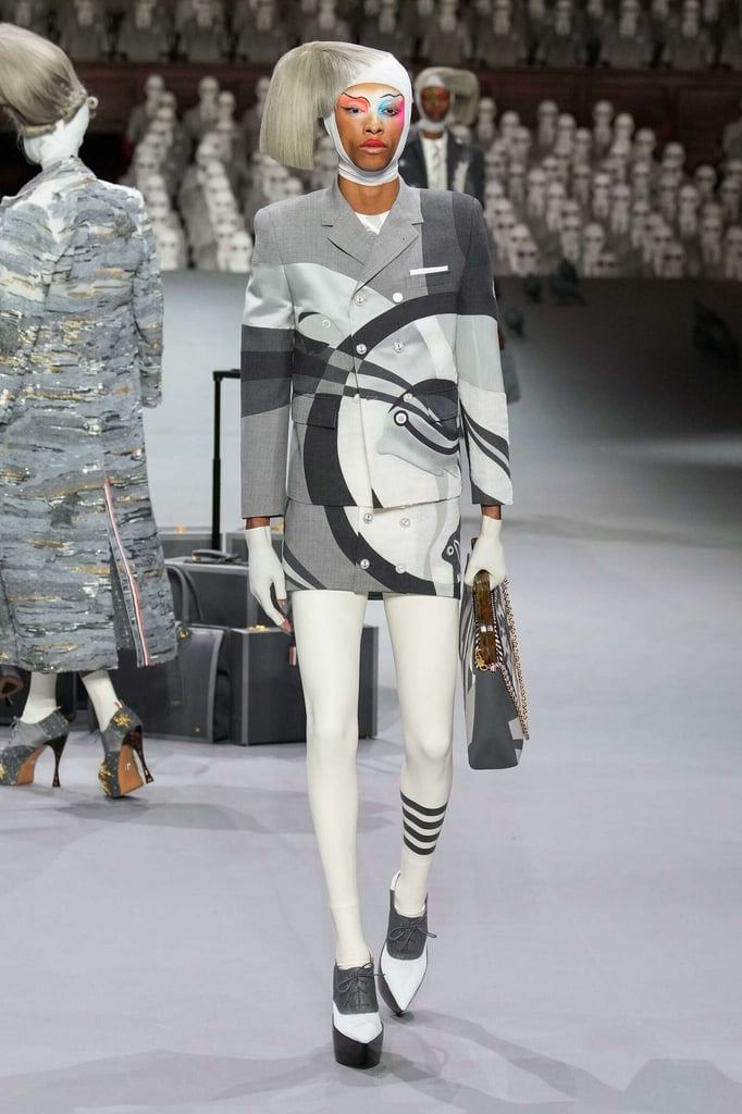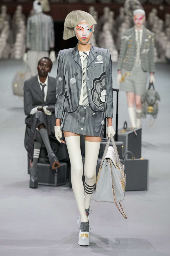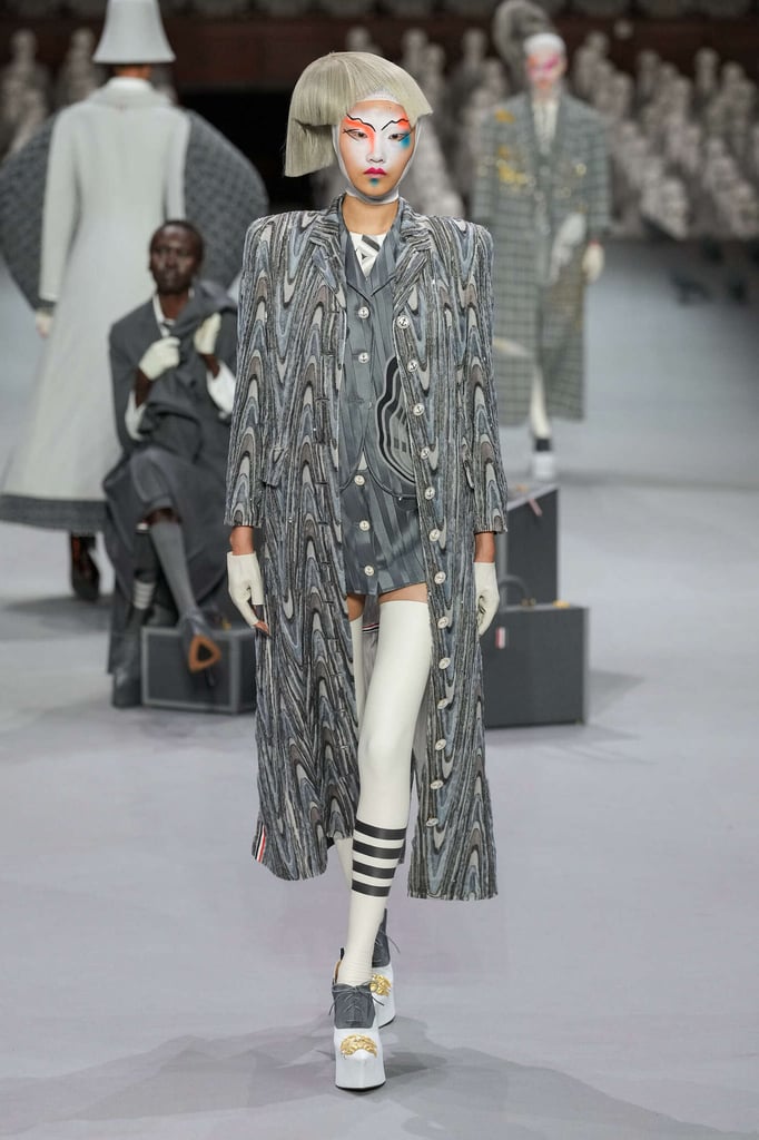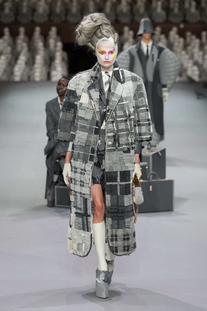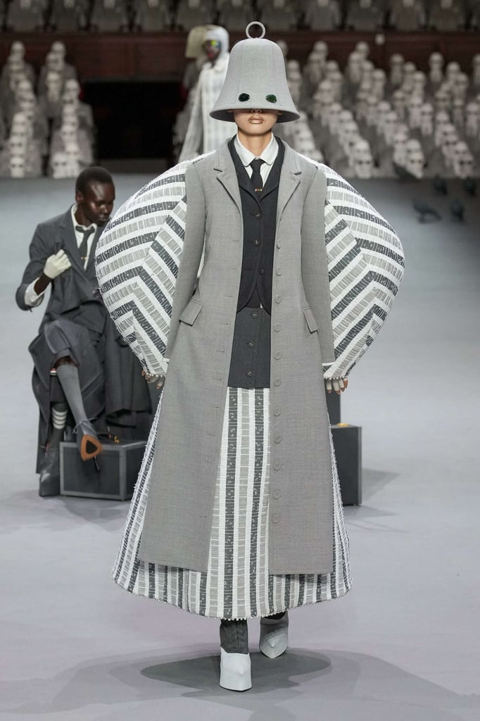 DEFILE THOM BROWNE AU PALAIS GARNIER: Le designer américain a présenté un show spectaculaire pour son premier défilé haute couture et le vingtième anniversaire de sa marque. Fidèle à sa couleur fétiche, le gris, il s’est lancé à fond dans les silhouettes et les ornements typiques de la haute couture. Il taille des manteaux en forme de cloche d’église avec chapeaux assortis, et imagine des manches gigantesques en forme d’ailes de papillon. Des fils de laine, de soie, utilisés comme des pinceaux, servent à dessiner sur les vêtements des paysages marins évoquant la Côte Est des Etats-Unis qui lui est chère. Un homard géant doré brodé s’agrippe le long de la colonne vertébrale, des sequins carrés reproduisent des crabes pixélisés, des bandeaux de tulle imbriqués et piqués de perles imitent le mouvement des vagues, des perles transparentes servent à dessiner des bancs de poissons. Le maquillage clownesque et les perruques baroques donnent à l’ensemble un côté théâtral et décalé. Tout en restant fidèle à son esthétique, Thom Browne insuffle à son travail une sophistication très parisienne.