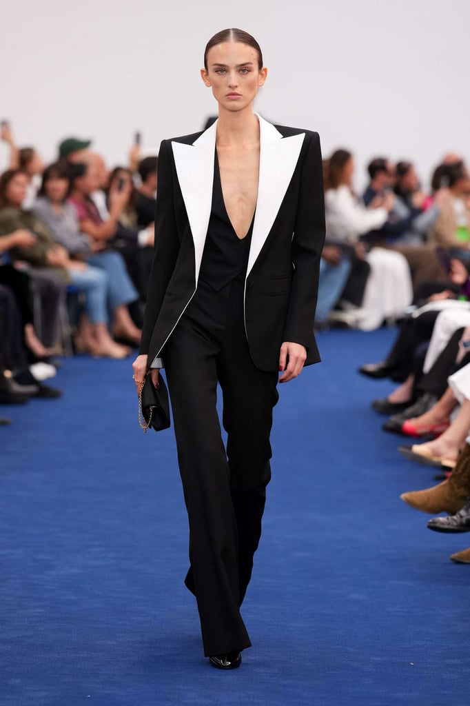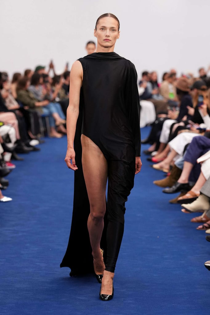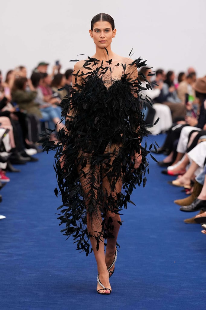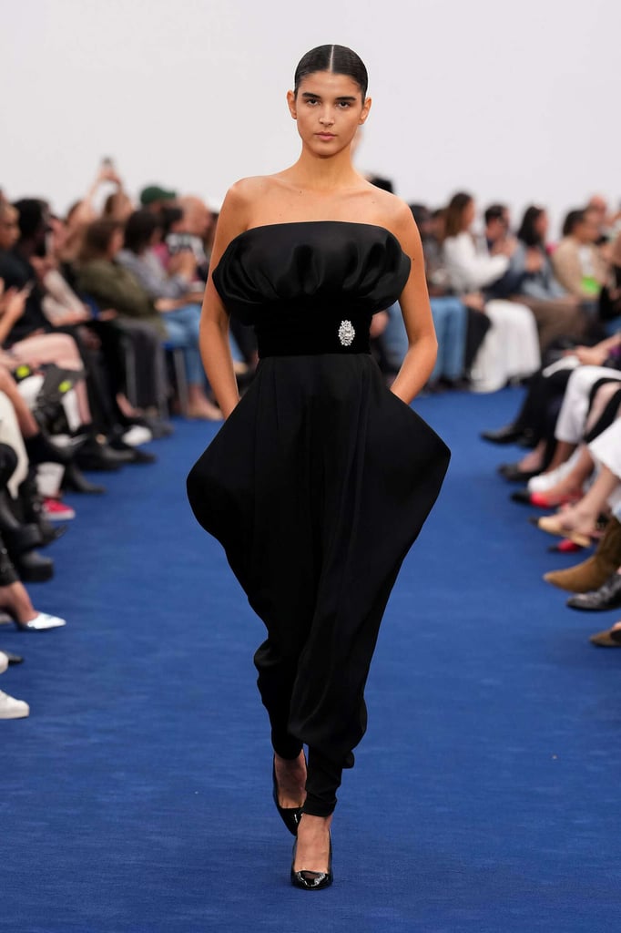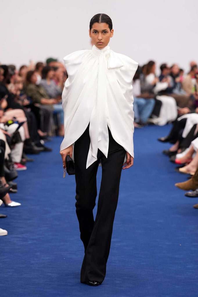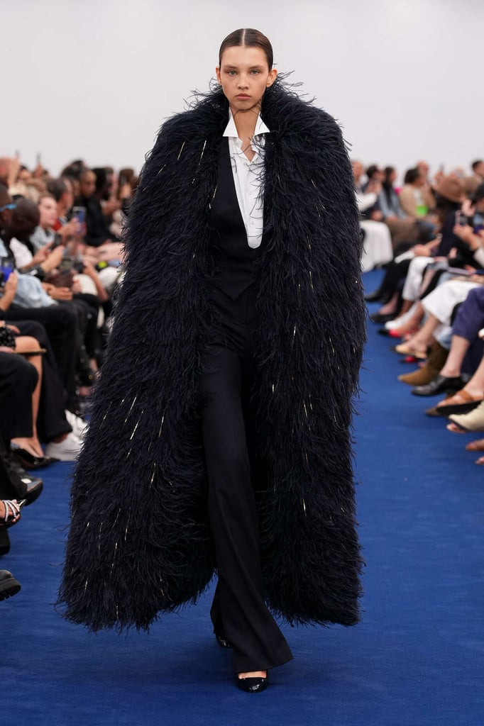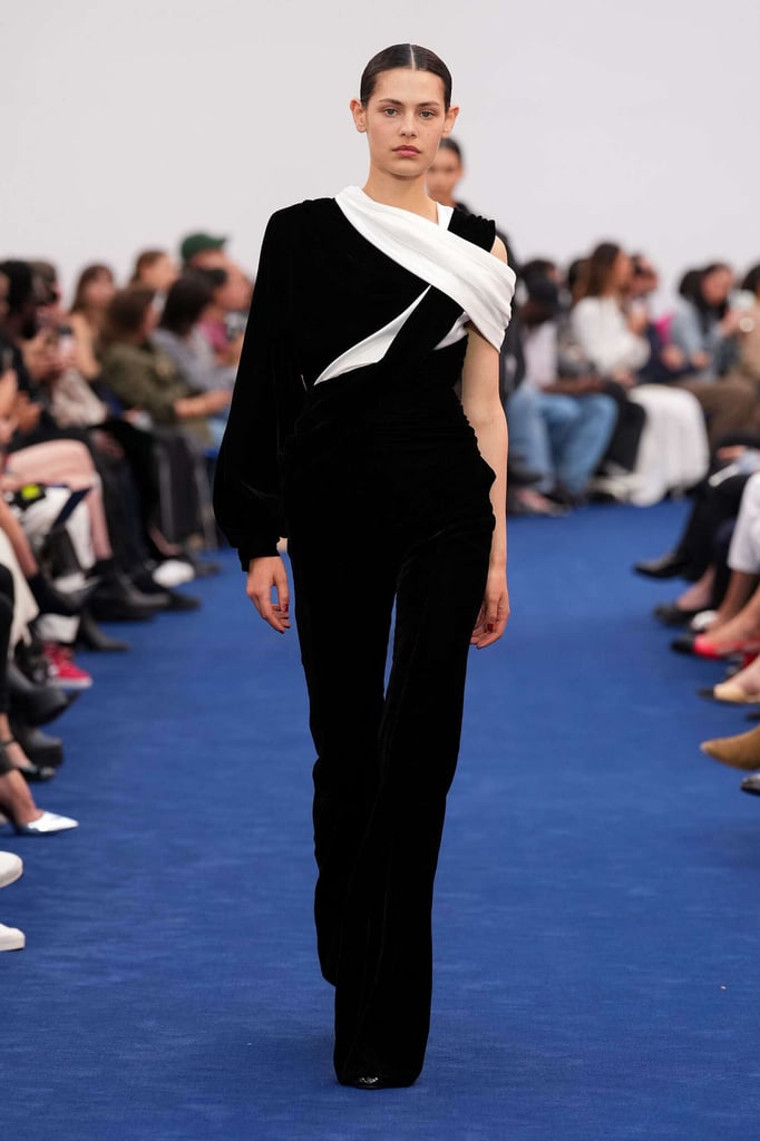 DEFILE ALEXANDRE VAUTHIER AU PALAIS DE TOKYO: Alors qu’il affectionne d’habitude les tenues extravagantes, le couturier français a dévoilé pour cette saison une élégante garde-robe de « basiques haute couture ». On y trouve ainsi des chemisiers blancs romantiques à lavallière, des tops asymétriques noirs créant un effet de cape, des pantalons de tailleur noirs, des pantalons évasés ou bouffants. De longs manteaux ajourés à la taille, des chemises oversize structurées et des combinaisons voluptueuses à décolleté bustier. De séduisants costumes classiques en velours, avec des épaulettes marquées et des revers contrastants, sont déclinés en version homme et femme. Les robes se parent de silhouettes drapées d’inspiration hellénique, avec des fentes latérales. De longues silhouettes noires sont parfaitement ajustées. La palette de couleurs met à l’honneur le noir, le blanc et le marron, puis des teintes métallisées comme le cuivre, l’argent et l’or. Les looks les plus audacieux sont décorés de volants rigides, de plumes métalliques ou d’un body drapé. Cette sobriété élégante ne dédaigne pas un petit côté festif.