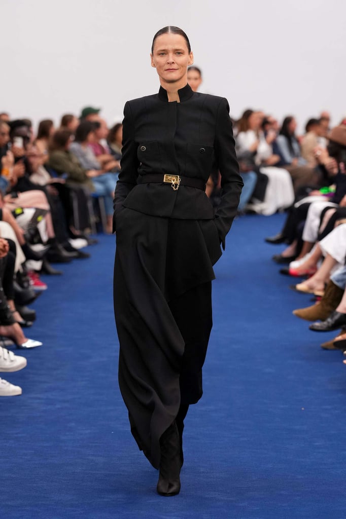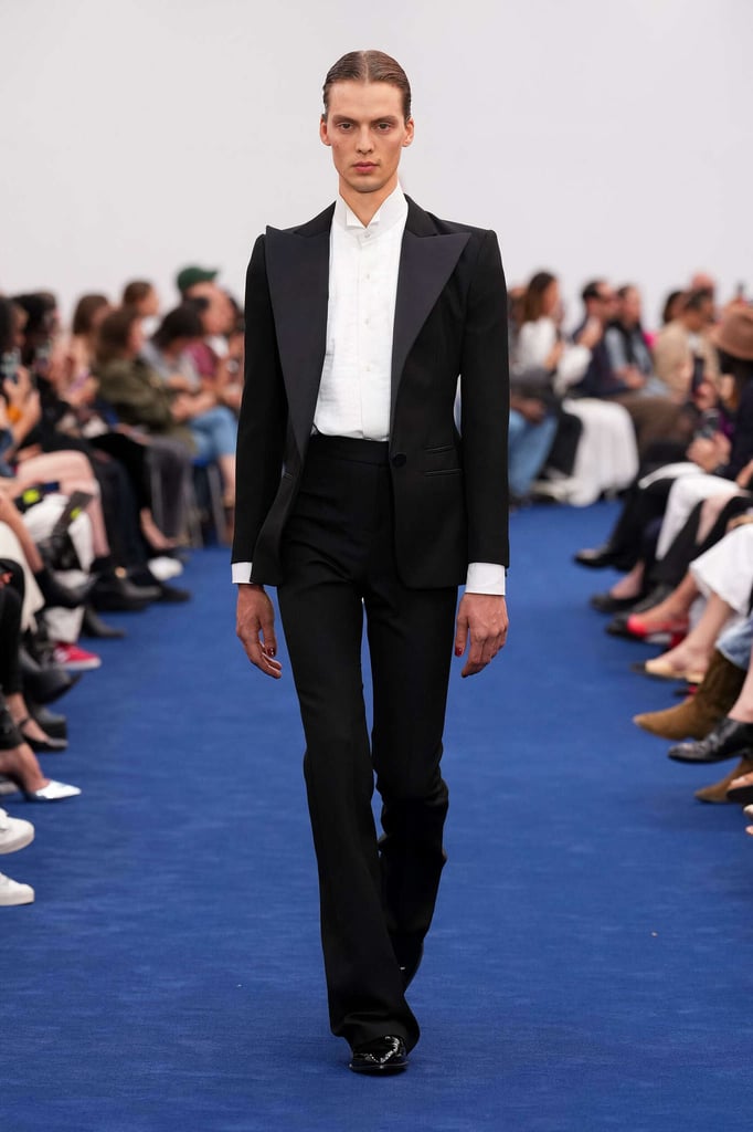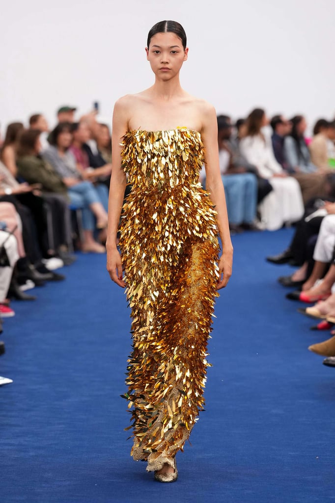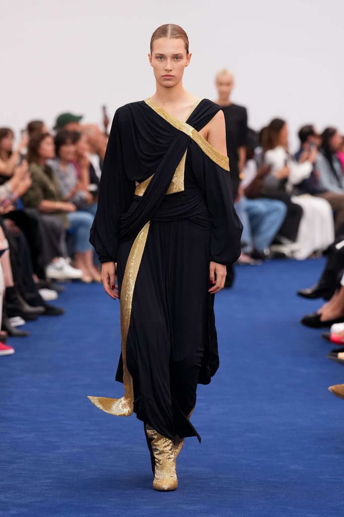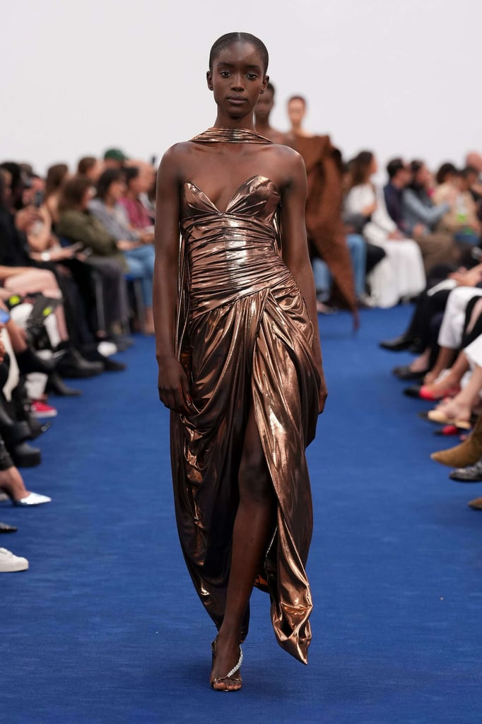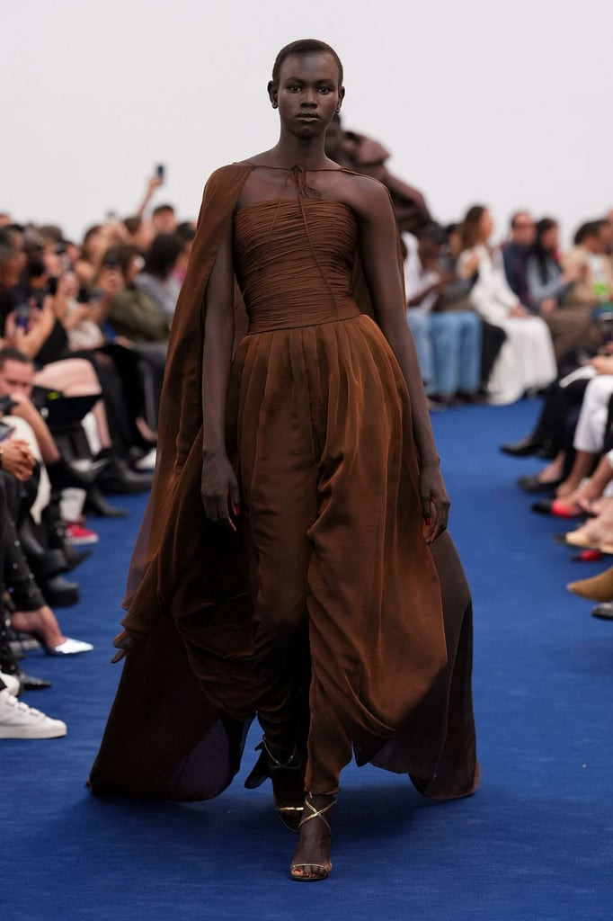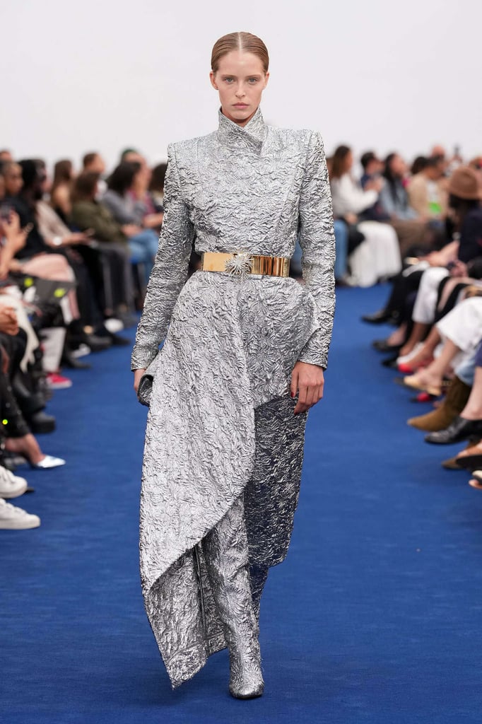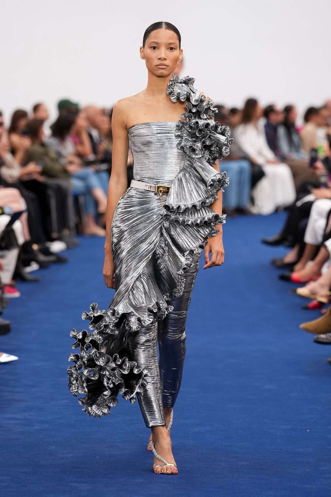 DEFILE ALEXANDRE VAUTHIER AU PALAIS DE TOKYO: Alors qu’il affectionne d’habitude les tenues extravagantes, le couturier français a dévoilé pour cette saison une élégante garde-robe de « basiques haute couture ». On y trouve ainsi des chemisiers blancs romantiques à lavallière, des tops asymétriques noirs créant un effet de cape, des pantalons de tailleur noirs, des pantalons évasés ou bouffants. De longs manteaux ajourés à la taille, des chemises oversize structurées et des combinaisons voluptueuses à décolleté bustier. De séduisants costumes classiques en velours, avec des épaulettes marquées et des revers contrastants, sont déclinés en version homme et femme. Les robes se parent de silhouettes drapées d’inspiration hellénique, avec des fentes latérales. De longues silhouettes noires sont parfaitement ajustées. La palette de couleurs met à l’honneur le noir, le blanc et le marron, puis des teintes métallisées comme le cuivre, l’argent et l’or. Les looks les plus audacieux sont décorés de volants rigides, de plumes métalliques ou d’un body drapé. Cette sobriété élégante ne dédaigne pas un petit côté festif.