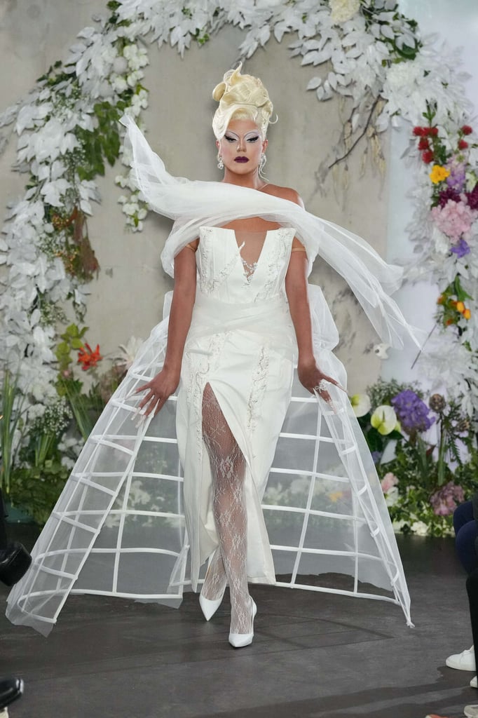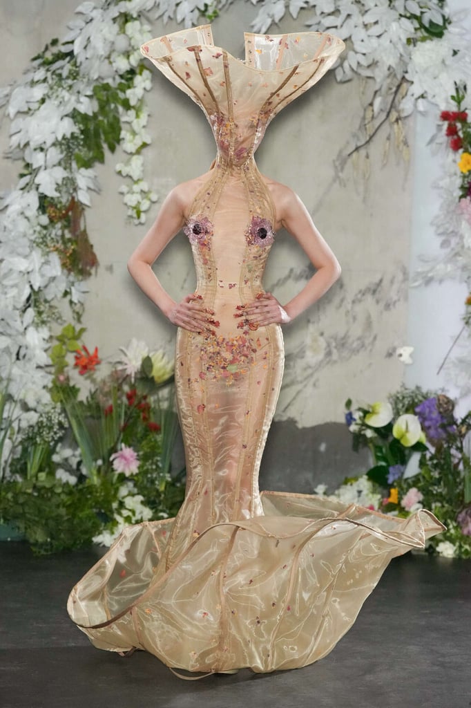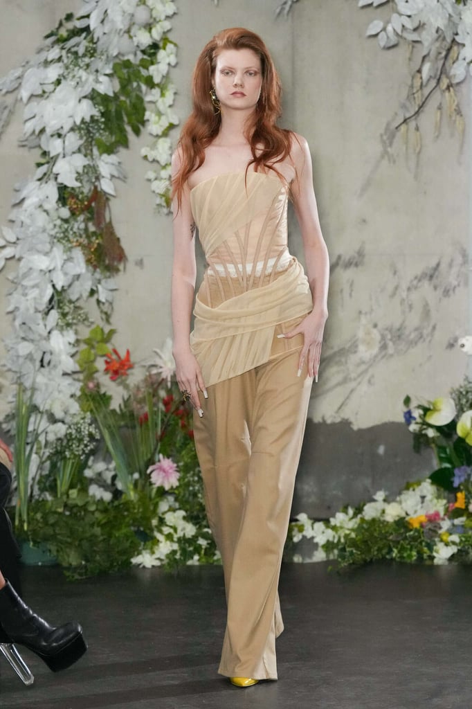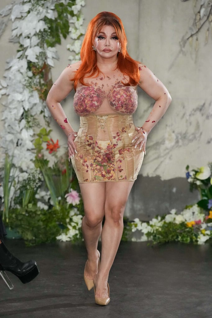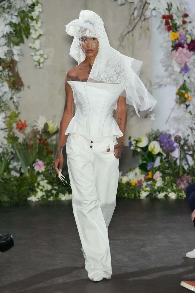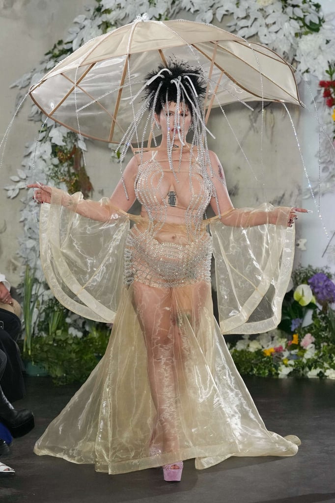 DEFILE WEINSANTO AU CLUB TECHNO « CARBONE »: Pour cette nouvelle collection intitulée « Perfect Day », le jeune créateur alsacien de 29 ans Victor Weinsanto revisite à sa façon le thème du mariage. La mariée est en blanc, mais complètement désembourgeoisée. Le travail de corseterie y est volontairement révélé, plutôt que de servir uniquement de dessous caché. La lingerie tout en transparence sert de robe dès le premier look porté par la créatrice Lady Miss Boo (habilleuse de drag queens), suivie peu après par Nicky Doll dont la crinoline s’affiche en dehors de sa robe. D’autres personnalités de la nuit, comme Sam Quealy, Julie Demont et Miss Allanah Star, font partie de ce show audacieux dans lequel rayonnent différentes générations et morphologies. Une robe vase semi-transparente est décorée uniquement de délicats pétales de fleurs. Mais le créateur propose également des tenues plus décontractées avec cravates, capuches incorporées dans les vestes, manteaux de laine et robes en satin. Les pantalons font aussi leur apparition dans des silhouettes couture oversize. Un luxe plus subtil qui, au-delà du classique noir et blanc, se décline dans des tons nude, beige et jaune.