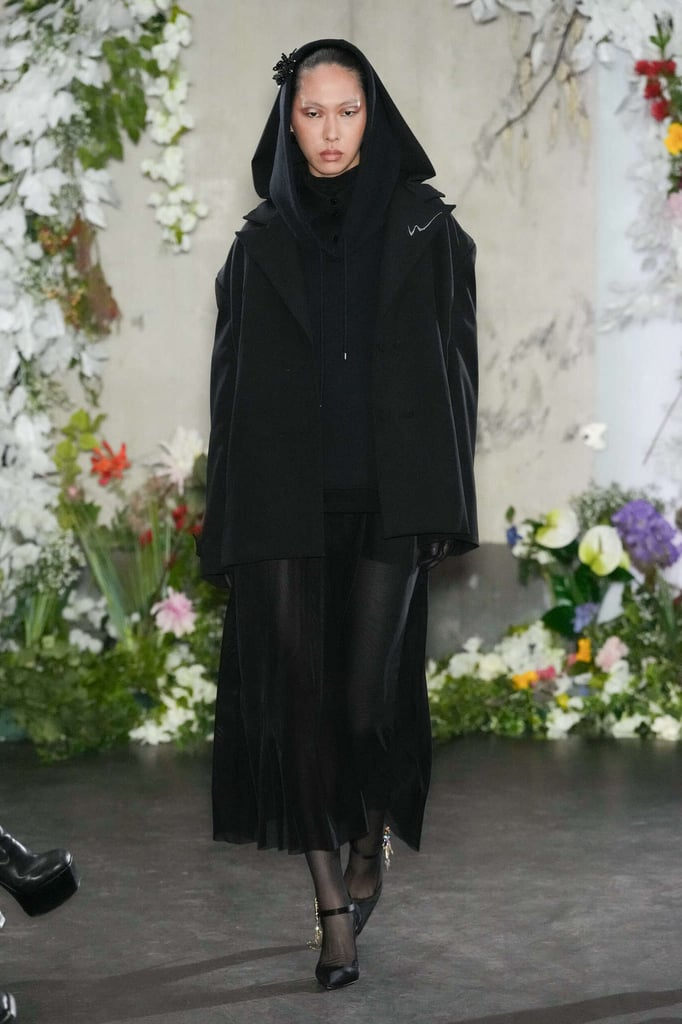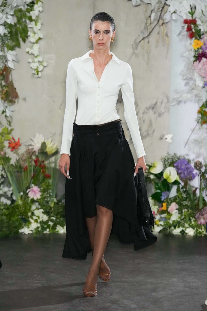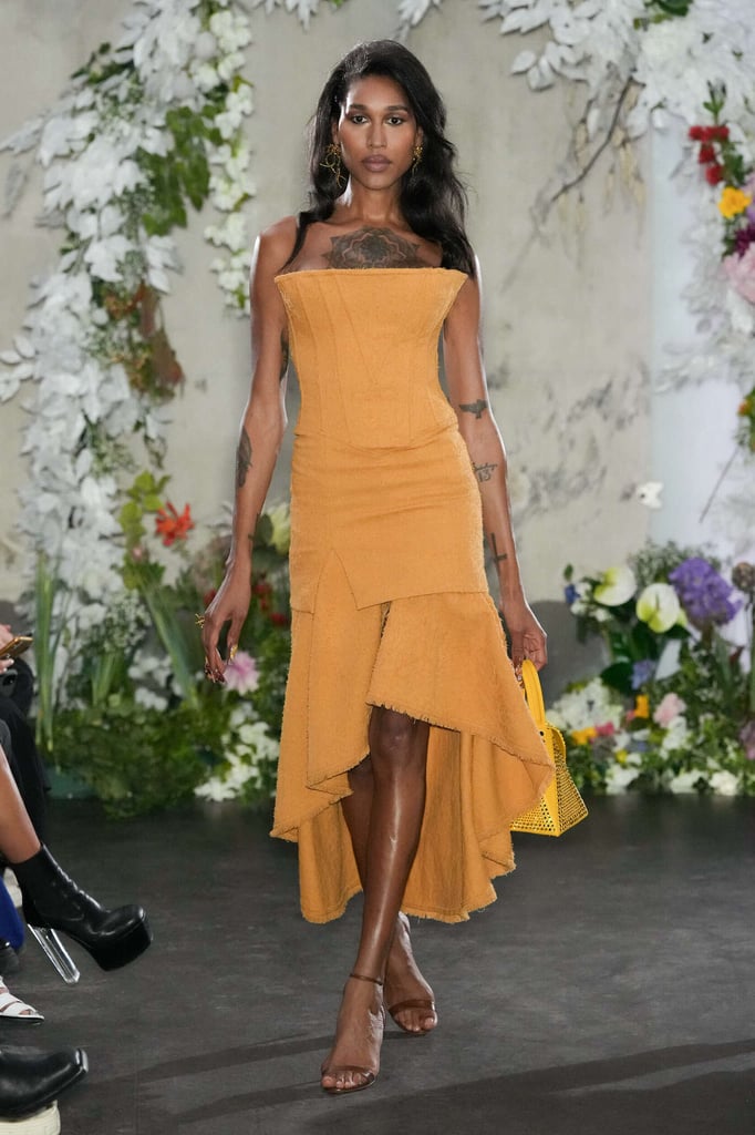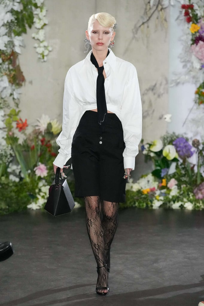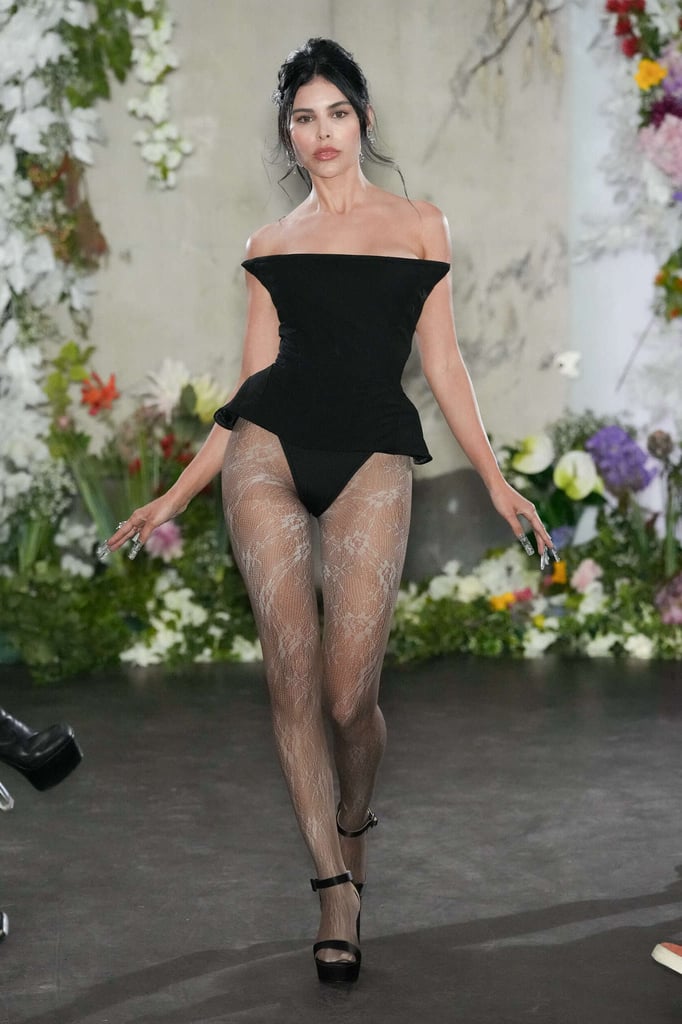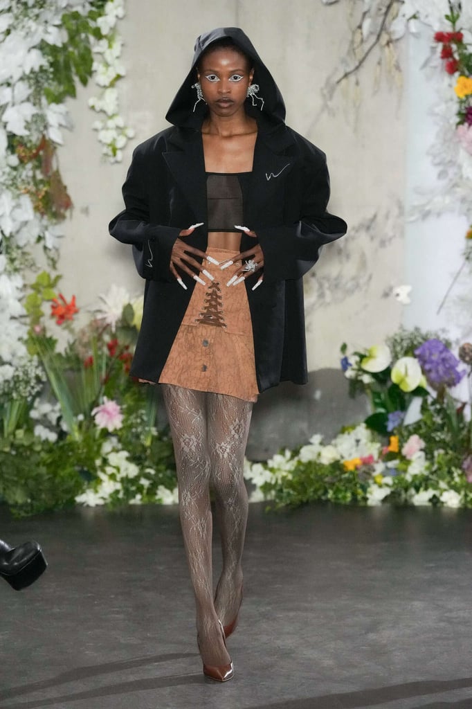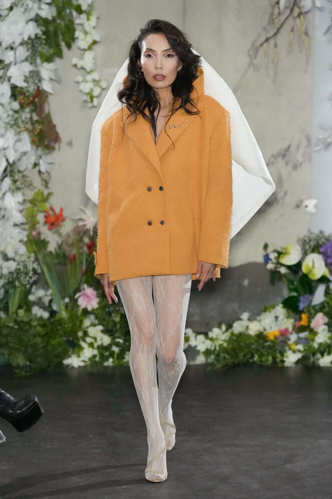 DEFILE WEINSANTO AU CLUB TECHNO « CARBONE »: Pour cette nouvelle collection intitulée « Perfect Day », le jeune créateur alsacien de 29 ans Victor Weinsanto revisite à sa façon le thème du mariage. La mariée est en blanc, mais complètement désembourgeoisée. Le travail de corseterie y est volontairement révélé, plutôt que de servir uniquement de dessous caché. La lingerie tout en transparence sert de robe dès le premier look porté par la créatrice Lady Miss Boo (habilleuse de drag queens), suivie peu après par Nicky Doll dont la crinoline s’affiche en dehors de sa robe. D’autres personnalités de la nuit, comme Sam Quealy, Julie Demont et Miss Allanah Star, font partie de ce show audacieux dans lequel rayonnent différentes générations et morphologies. Une robe vase semi-transparente est décorée uniquement de délicats pétales de fleurs. Mais le créateur propose également des tenues plus décontractées avec cravates, capuches incorporées dans les vestes, manteaux de laine et robes en satin. Les pantalons font aussi leur apparition dans des silhouettes couture oversize. Un luxe plus subtil qui, au-delà du classique noir et blanc, se décline dans des tons nude, beige et jaune.