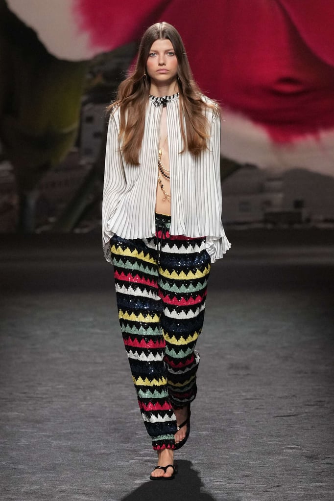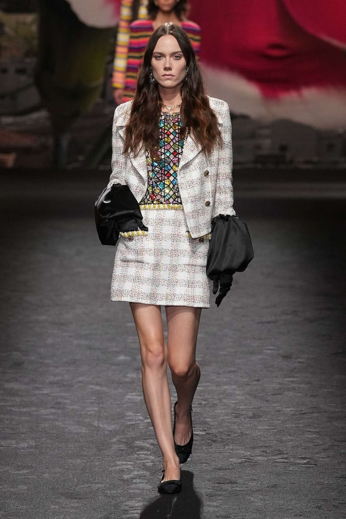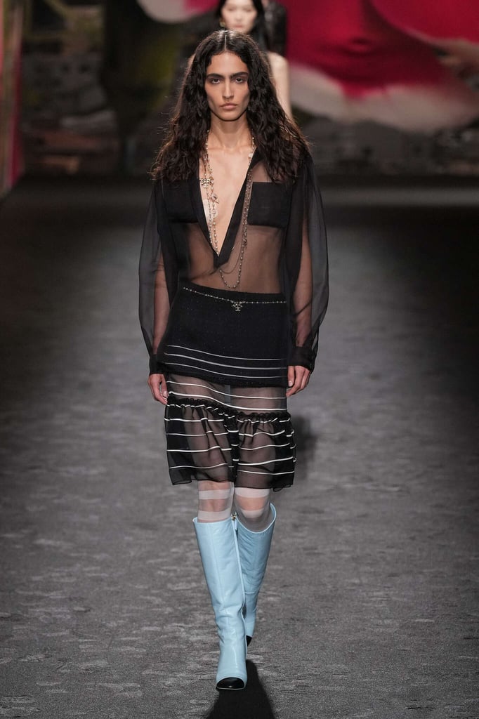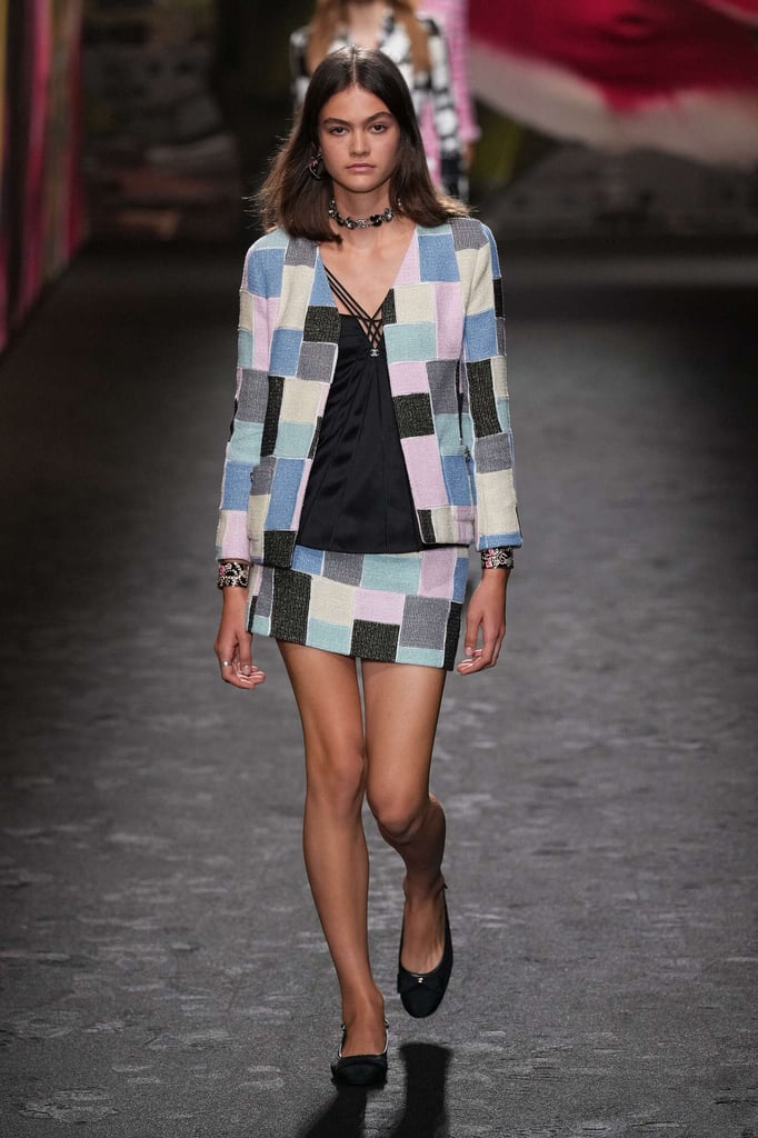 DEFILE CHANEL AU GRAND PALAIS EPHEMERE: La directrice artistique Virginie Viard a présenté une collection estivale, pleine d’énergie et de joie de vivre, inspirée par la Provence et la célèbre Villa de Noailles à Hyères. Apparaissent ainsi des robes plissées et corsages hippie chic, associés à des blazers écossais, de superbes caftans légers en laine bouclée, faciles à enfiler ou à enlever. Egalement d’astucieuses jupes-culottes, des shorts portés avec des tops rebrodés de cristaux, ou encore des débardeurs de kayakistes, monogrammés CC. La créatrice a innové en présentant pour la première fois chez Chanel des jeans et tuniques en denim vieilli, associés à des ceintures perlées. Des jupes portefeuille de forme irrégulière, en laine bouclée, ont un côté plus long de quelques centimètres. Les mannequins marchent à plat: mules diamantées, tongs monogrammées, ou ballerines incrustées de perles avec des noeuds en ruban noir. Sauf pour le soir: dans la tendance actuelle de la semi-transparence, de superbes robes en mousseline de soie noire, style négligé, sont combinées à des cuissardes bleu glacier à talons hauts. Des imprimés floraux fantaisie, déclinés en tailleurs pantalon, blazers et jupes plissées sont une allusion à l’insouciance propre à la Villa Noailles et à son heure de gloire.