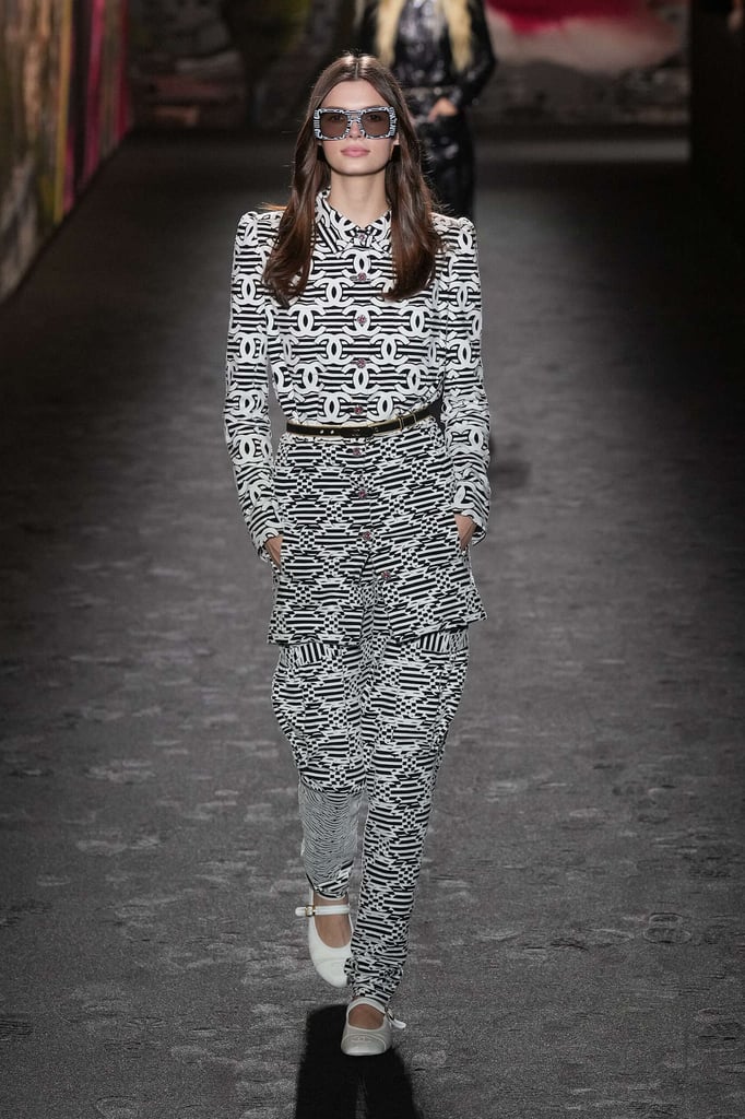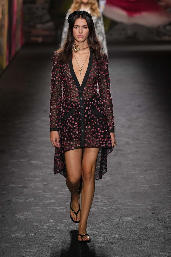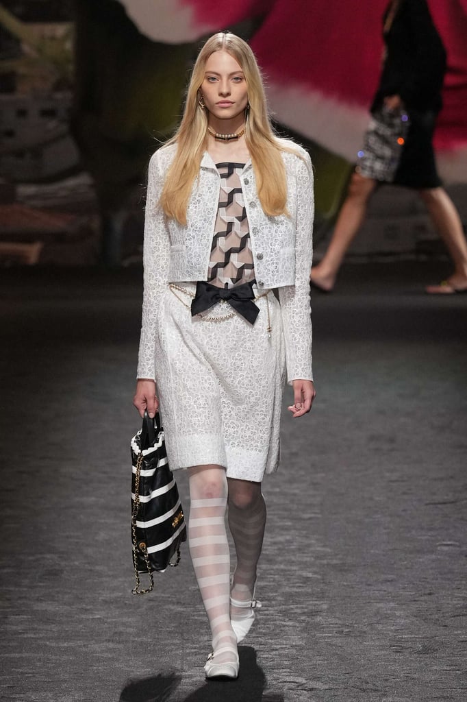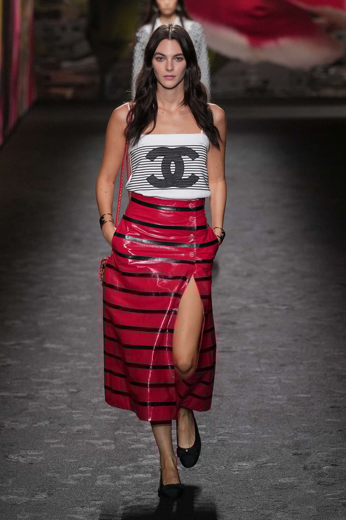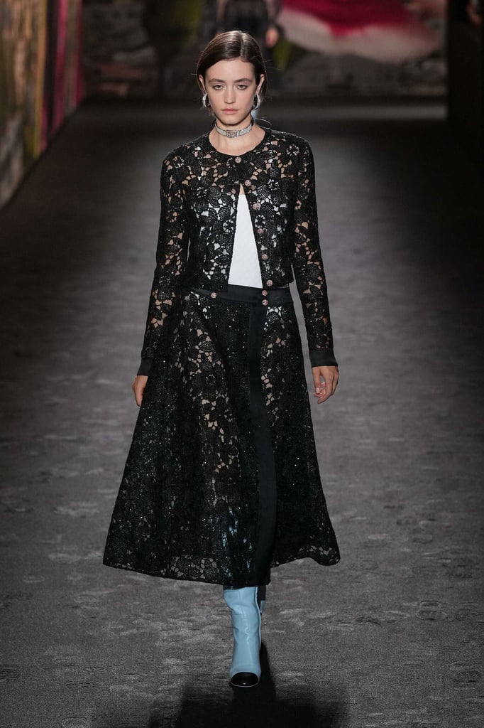 DEFILE CHANEL AU GRAND PALAIS EPHEMERE: La directrice artistique Virginie Viard a présenté une collection estivale, pleine d’énergie et de joie de vivre, inspirée par la Provence et la célèbre Villa de Noailles à Hyères. Apparaissent ainsi des robes plissées et corsages hippie chic, associés à des blazers écossais, de superbes caftans légers en laine bouclée, faciles à enfiler ou à enlever. Egalement d’astucieuses jupes-culottes, des shorts portés avec des tops rebrodés de cristaux, ou encore des débardeurs de kayakistes, monogrammés CC. La créatrice a innové en présentant pour la première fois chez Chanel des jeans et tuniques en denim vieilli, associés à des ceintures perlées. Des jupes portefeuille de forme irrégulière, en laine bouclée, ont un côté plus long de quelques centimètres. Les mannequins marchent à plat: mules diamantées, tongs monogrammées, ou ballerines incrustées de perles avec des noeuds en ruban noir. Sauf pour le soir: dans la tendance actuelle de la semi-transparence, de superbes robes en mousseline de soie noire, style négligé, sont combinées à des cuissardes bleu glacier à talons hauts. Des imprimés floraux fantaisie, déclinés en tailleurs pantalon, blazers et jupes plissées sont une allusion à l’insouciance propre à la Villa Noailles et à son heure de gloire.