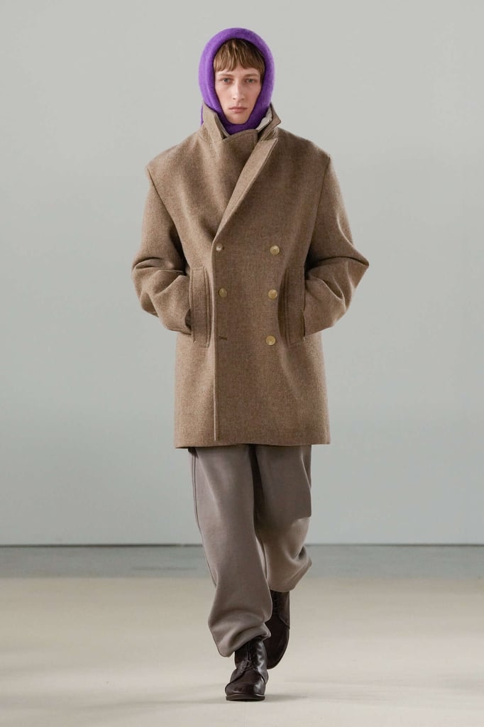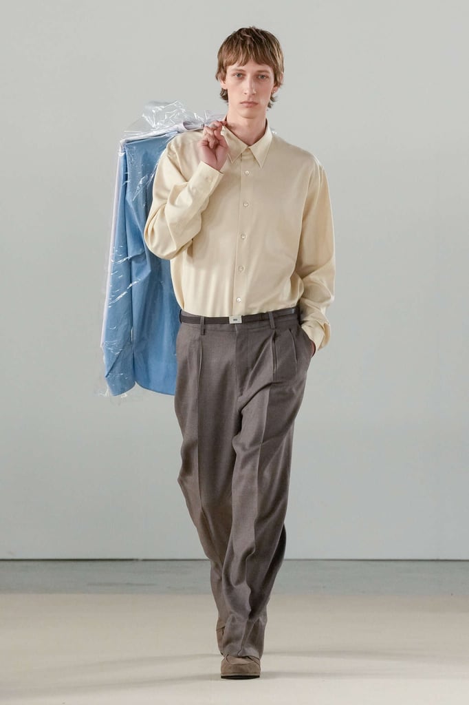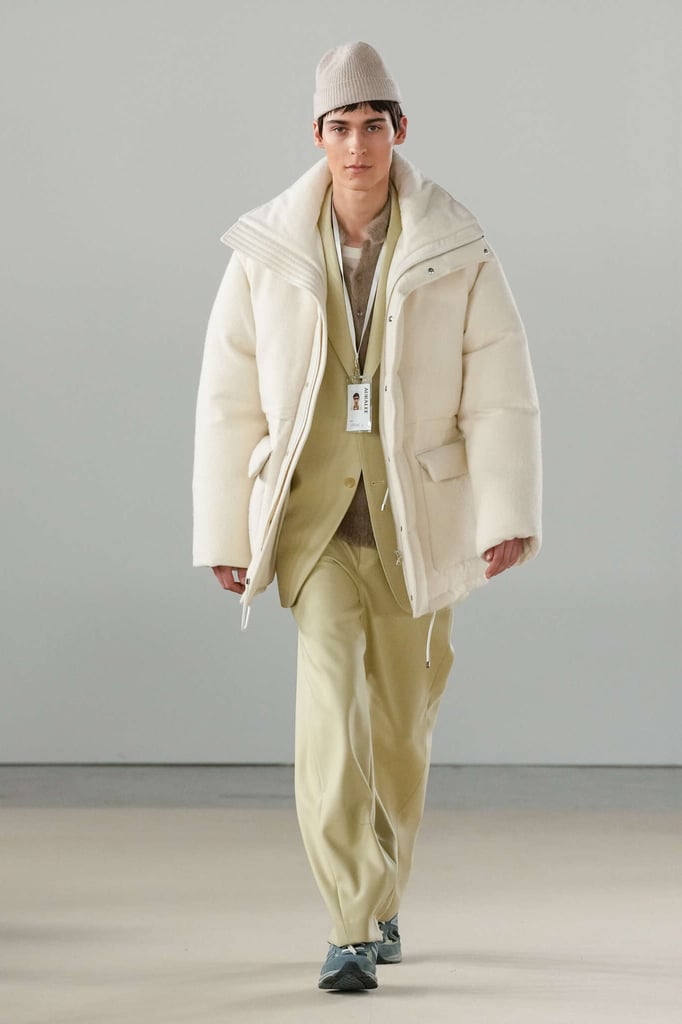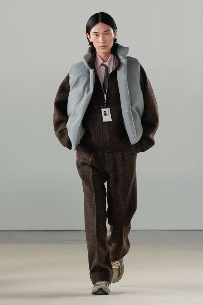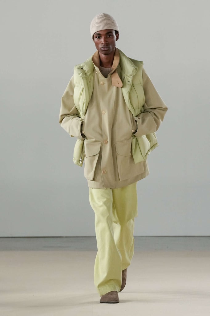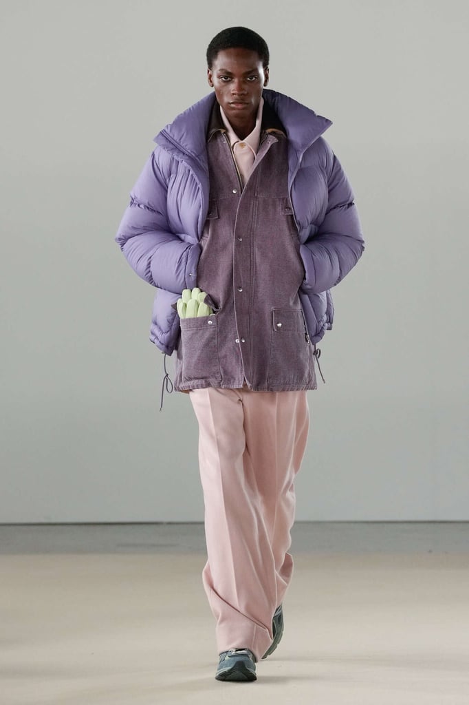 DEFILE AURALEE AU PALAIS DE TOKYO: La marque japonaise fondée en 2015 par Ryoto Iwai à Tokyo proposait son premier défilé à la Fashion Week parisienne (après être intervenue depuis plusieurs années dans le programme des présentations). Dans cette collection mixte toute en délicatesse le créateur revisite le vestiaire du quotidien en mettant en avant de somptueuses matières développées par la marque elle-même. Il imagine ce moment particulier qui caractérise la fin d’une journée de travail, quand on sort du bureau avec l’envie de rentrer chez soi ou la perspective d’une soirée au théâtre ou entre amis. Certains hommes ont le temps de passer au pressing récupérer leur tenue pour le dîner, d’autres ont mis leur doudoune ou leur chandail dans un sac, tandis que quelques-uns ont encore le badge du bureau autour du cou. Les mannequins arborent une élégance nonchalante, mélangeant avec un chic indéniable de l’outerwear, des pièces de workwear, comme cette veste en denim qui semble taillée dans ces grosses toiles servant à confectionner les typiques combinaisons de travail beiges, et un habillement de bureau plus classique à base de costumes aux proportions simples et confortables. Le créateur s’amuse à mixer et superposer habits et matières. La veste courte en tweed aux manches légèrement arrondies s’enfile sur un hoodie à capuche ultra doux, lui-même superposé à un pull-over ultra léger en cachemire. Le coupe-vent mauve long se porte sur la gabardine, qui protège à son tour du costume. Des couleurs incisives comme le rouge, le turquoise ou le violet s’immiscent avec naturel dans une palette de tons pastels. De superbes cabans sont réalisés dans une nouvelle matière, une laine éponge double-face. Une doudoune-parka en alpaga est à la fois résistante et légère. Les manteaux tombent impeccablement, tandis qu’en guise de chemise, une femme endosse sous la veste de son tailleur un cardigan mandarine impalpable. La qualité est omniprésente, s’exprimant à travers la douceur et la fluidité des vêtements.