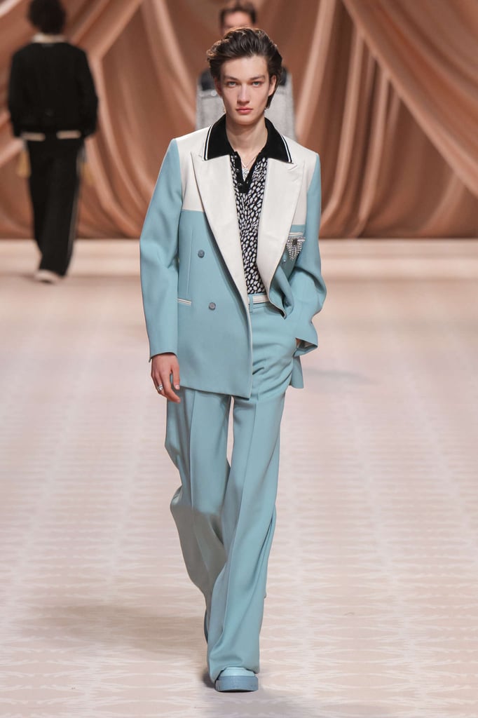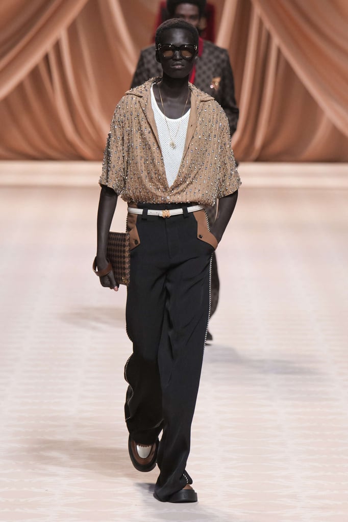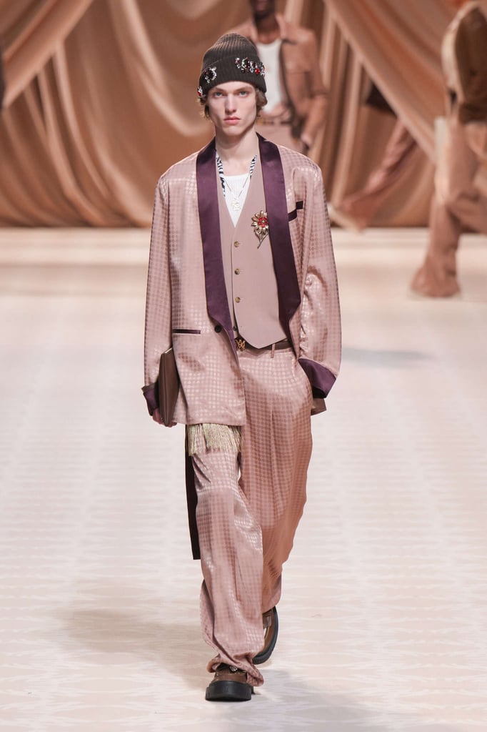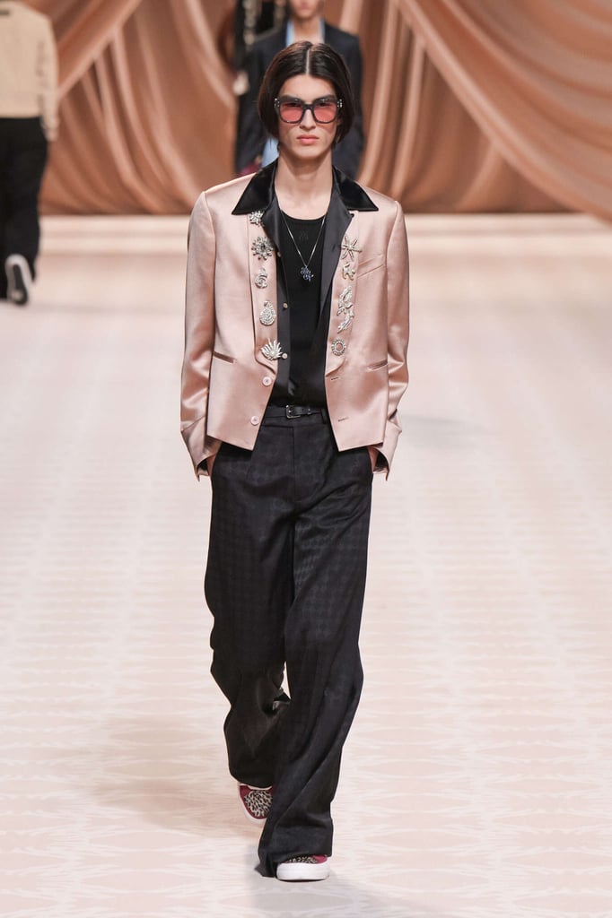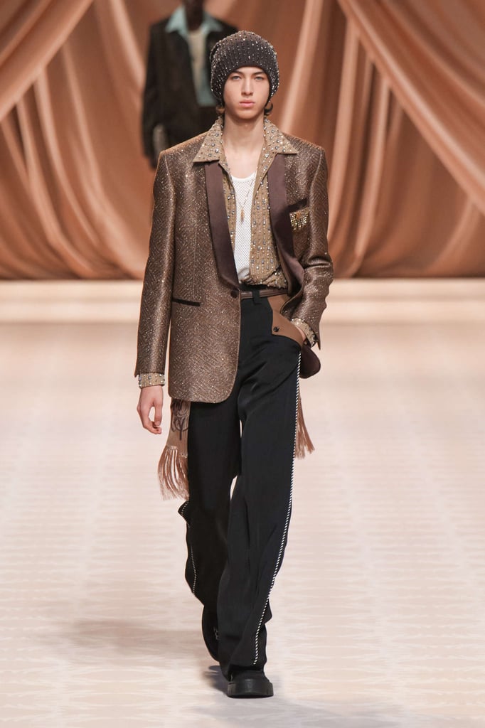 DEFILE AMIRI AU CARREAU DU TEMPLE: La marque fondée en 2014 par le créateur californien Mike Amiri délaisse le denim de ses débuts et propose une garde-robe classique tout à la fois décontractée et très élégante avec un twist rock. Tout se joue sur les matières, entre recherche et touche artisanale, avec des tissus luxueux (cachemire, soie, mohair, satin, cuir). Un travail particulier est réalisé sur les textures avec, cette saison, de remarquables effets de brillance: du débardeur ajouré discrètement scintillant qui se devine sous une chemise en soie, aux bonnets de laine décorés de pierres précieuses, en passant par le délicat cardigan en mohair bordé de rubis. Vestes et chemises étincellent, tissées dans des fils dorés, pavées de strass ou encore brodées de perles. Tout comme les manteaux traversés de fines striures argentées faisant penser à des traces de pluie. Certains costumes sont couverts de baguettes argent. Les cristaux sont partout, ils composent notamment des broches qui viennent orner des bonnets ou bien le revers d’un gilet ou d’une veste de smoking en satin. Les pantalons sont confortables, légèrement évasés, mais toujours chic avec leur galon latéral. La chemise entrouverte sur un maillot de corps ou optant pour un superbe polo coloré, les modèles endossent avec nonchalance de somptueuses vestes, laissant l’écharpe frangée pointer son nez sur la cuisse, sans jamais oublier la pochette en accessoire discret mais indispensable. Le thème damier s’invite parfois, tout comme le motif léopard. Pour le soir, les dandys sortent le grand jeu, enfilant une jaquette queue de pie dont les basques derrière se prolongent avec majesté jusqu’au sol en longue traîne.