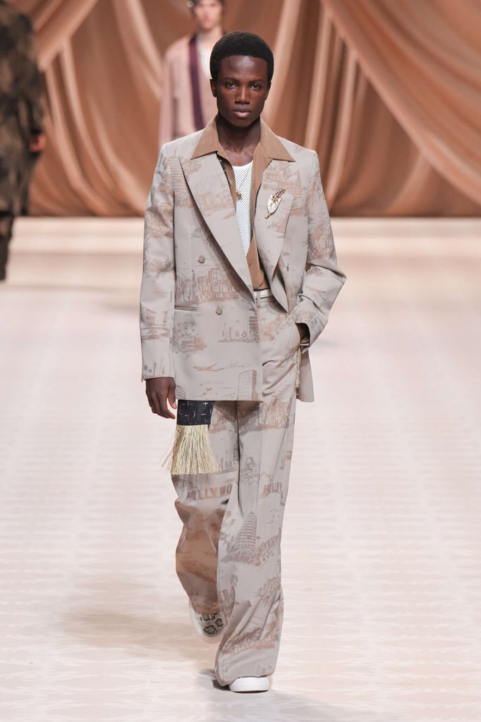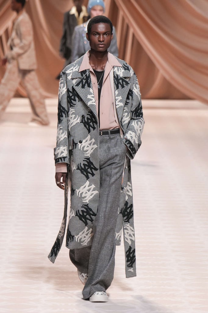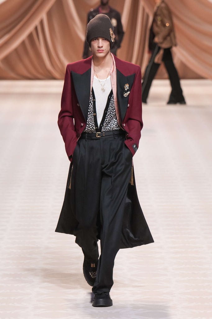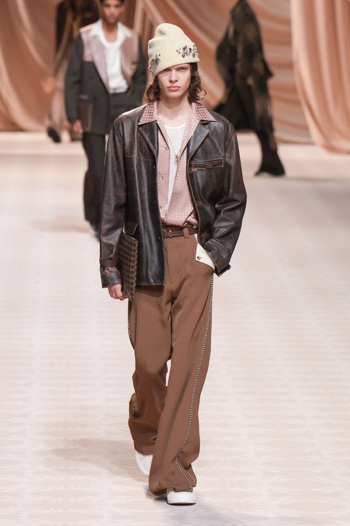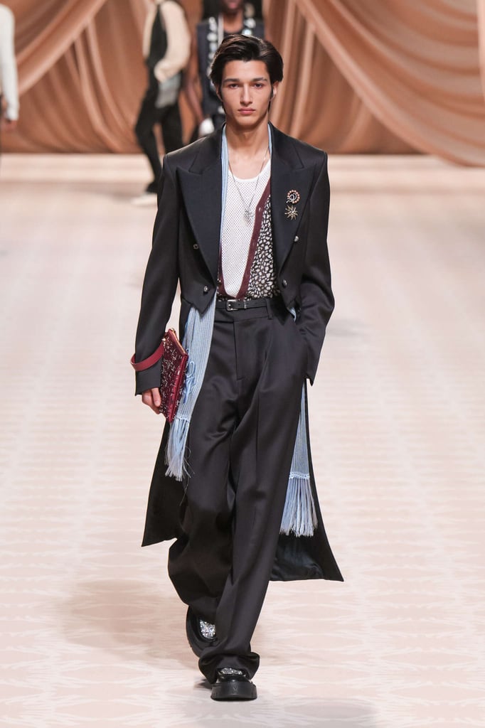 DEFILE AMIRI AU CARREAU DU TEMPLE: La marque fondée en 2014 par le créateur californien Mike Amiri délaisse le denim de ses débuts et propose une garde-robe classique tout à la fois décontractée et très élégante avec un twist rock. Tout se joue sur les matières, entre recherche et touche artisanale, avec des tissus luxueux (cachemire, soie, mohair, satin, cuir). Un travail particulier est réalisé sur les textures avec, cette saison, de remarquables effets de brillance: du débardeur ajouré discrètement scintillant qui se devine sous une chemise en soie, aux bonnets de laine décorés de pierres précieuses, en passant par le délicat cardigan en mohair bordé de rubis. Vestes et chemises étincellent, tissées dans des fils dorés, pavées de strass ou encore brodées de perles. Tout comme les manteaux traversés de fines striures argentées faisant penser à des traces de pluie. Certains costumes sont couverts de baguettes argent. Les cristaux sont partout, ils composent notamment des broches qui viennent orner des bonnets ou bien le revers d’un gilet ou d’une veste de smoking en satin. Les pantalons sont confortables, légèrement évasés, mais toujours chic avec leur galon latéral. La chemise entrouverte sur un maillot de corps ou optant pour un superbe polo coloré, les modèles endossent avec nonchalance de somptueuses vestes, laissant l’écharpe frangée pointer son nez sur la cuisse, sans jamais oublier la pochette en accessoire discret mais indispensable. Le thème damier s’invite parfois, tout comme le motif léopard. Pour le soir, les dandys sortent le grand jeu, enfilant une jaquette queue de pie dont les basques derrière se prolongent avec majesté jusqu’au sol en longue traîne.