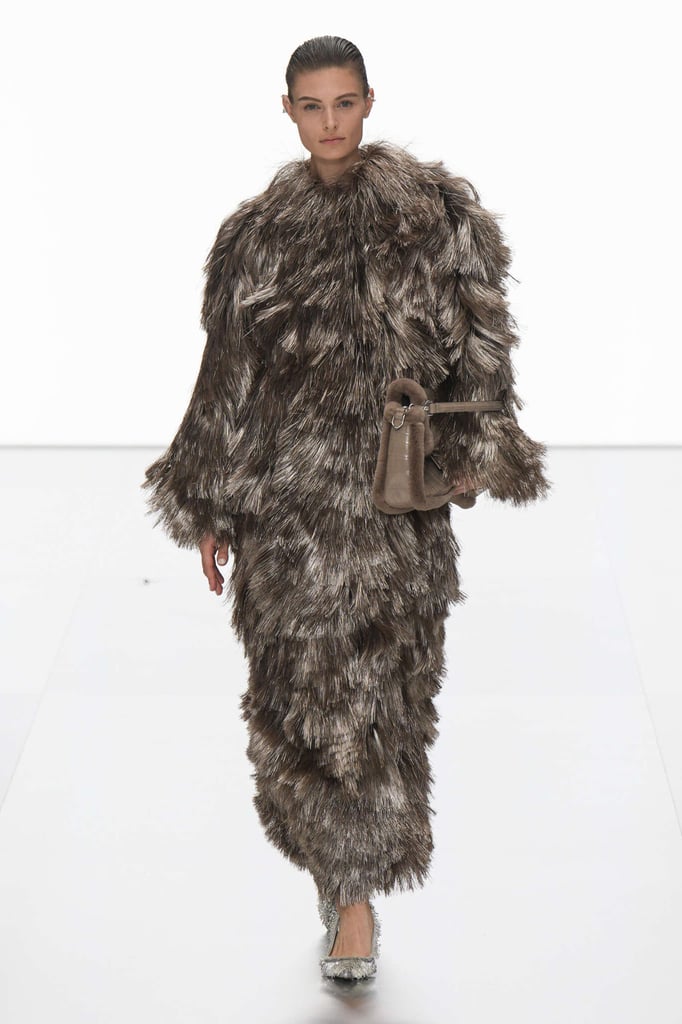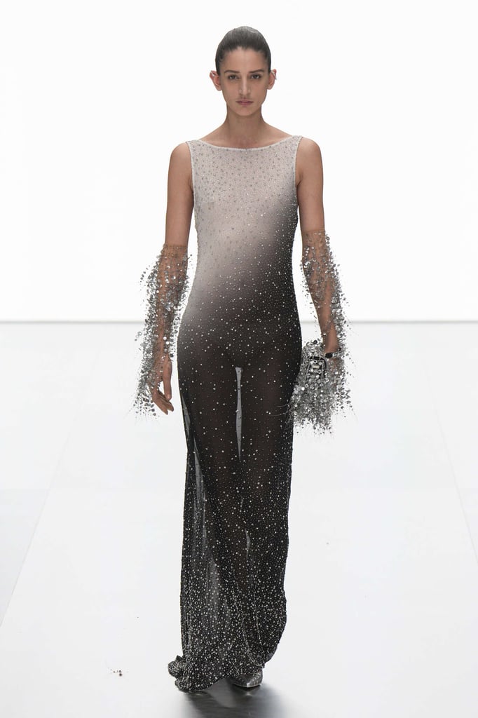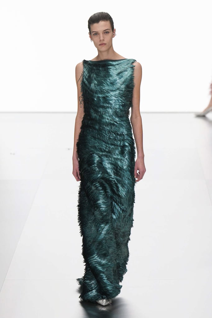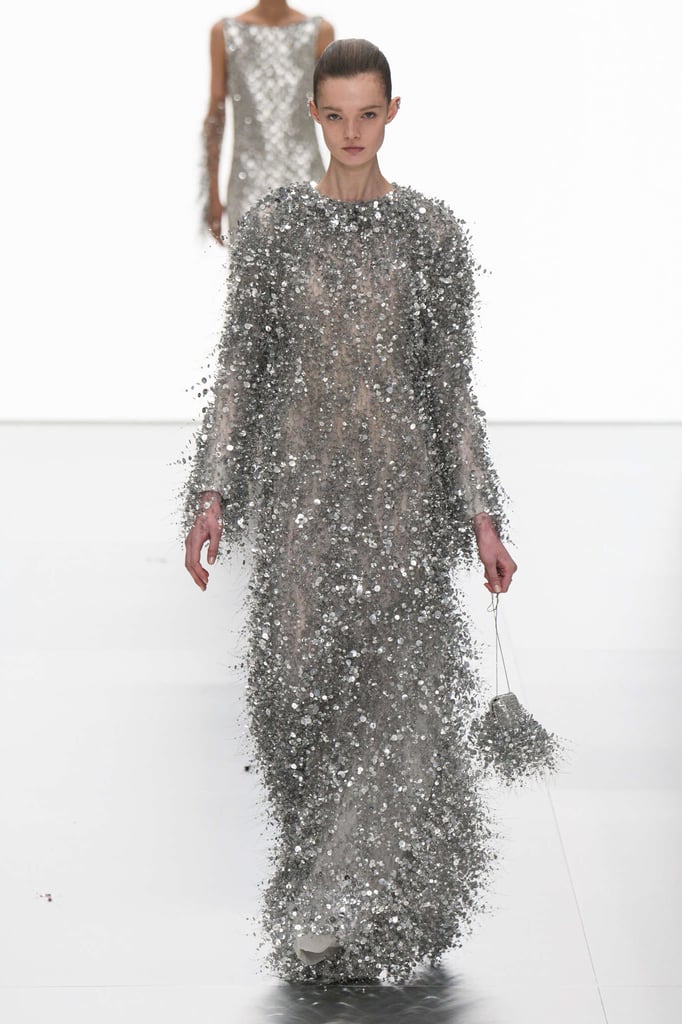 DEFILE FENDI HAUTE COUTURE AU PALAIS BRONGNIART: Le directeur artistique Kim Jones poursuit son approche minimaliste initiée la saison précédente et propose des silhouettes sensuelles et futuristes issues d’un immense travail sur les textures. Le vestiaire s’ouvre avec des total looks noirs ou blancs à l’élégance minimaliste d’une grande simplicité. Des robes bustiers qui tombent droit jusqu’aux mollets, des robes-tricots moulantes en maille ultra fine tissée dans un mélange de fils de cachemire et de vigogne, des vestes d’homme en laine masculine. Des ensembles top et jupe en peau de crocodile, matière servant à réaliser aussi des petits blousons et manteaux. Cette austérité se combine çà et là avec une touche sexy. Par exemple, avec des tuniques de vestale taillées dans un voile transparent ou du gazar de soie, ou avec des jeux de laçage évoquant l’art du shibari (le bondage japonais) via des bandeaux-brassières couvrant la poitrine, tout en s’enroulant autour du cou et des épaules. Des effets scintillants apportent une énergie magnétique à l’ensemble avec des jupes bouillonnantes, confectionnées à partir de franges métalliques recouvertes de paillettes. Les franges d’un fil à la fois soyeux et rigide ressemblent à une fourrure en poils argentés dans un long manteau ou en poils bruns dans une veste volumineuse. Des franges en forme de plumes extra light brodées à la main se meuvent de façon sinueuse, comme dans certaines pelisses, dans des jupes couleur bronze ou dans une robe longue bleu-vert. L’esprit cosmique est souligné par des lunettes futuristes très légères et par une série de tenues argentées étincelantes. De la robe asymétrique en dégradé blanc/noir parée d’une constellation de cristaux, aux robes de cote de maille embrassant le corps, en passant par une tenue de sirène toute en écailles réfléchissantes et jusqu’à un costume-carapace pour embarquer dans une navette spatiale trempé dans de l’argent.