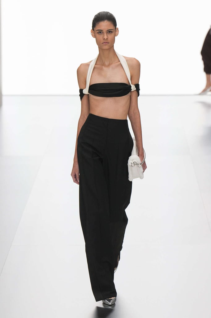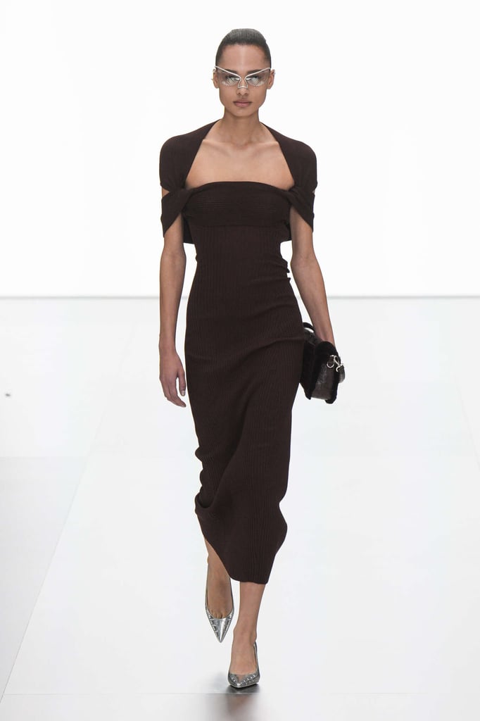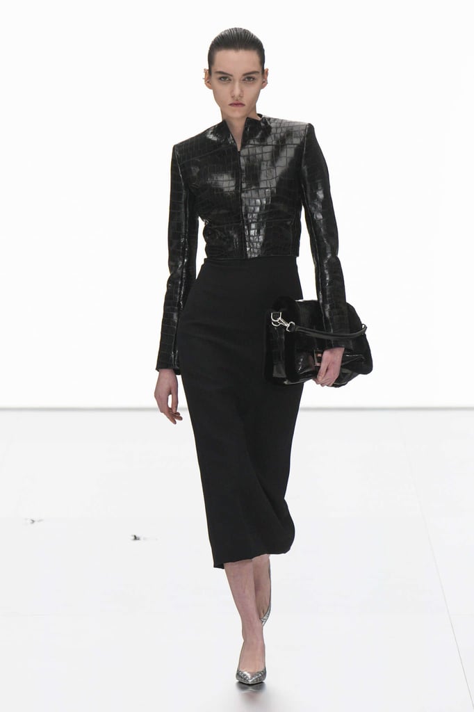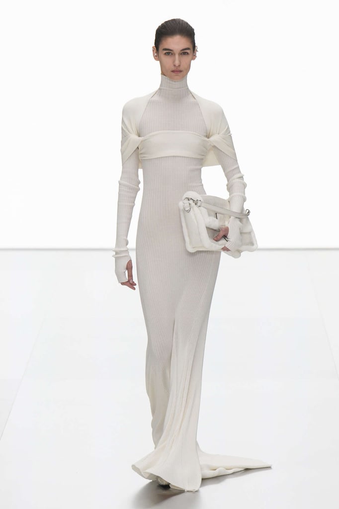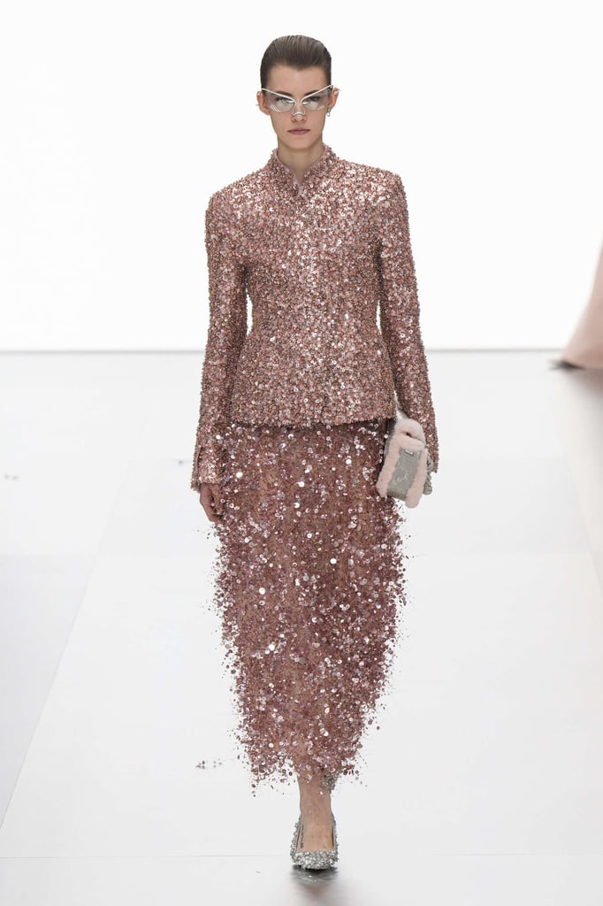 DEFILE FENDI HAUTE COUTURE AU PALAIS BRONGNIART: Le directeur artistique Kim Jones poursuit son approche minimaliste initiée la saison précédente et propose des silhouettes sensuelles et futuristes issues d’un immense travail sur les textures. Le vestiaire s’ouvre avec des total looks noirs ou blancs à l’élégance minimaliste d’une grande simplicité. Des robes bustiers qui tombent droit jusqu’aux mollets, des robes-tricots moulantes en maille ultra fine tissée dans un mélange de fils de cachemire et de vigogne, des vestes d’homme en laine masculine. Des ensembles top et jupe en peau de crocodile, matière servant à réaliser aussi des petits blousons et manteaux. Cette austérité se combine çà et là avec une touche sexy. Par exemple, avec des tuniques de vestale taillées dans un voile transparent ou du gazar de soie, ou avec des jeux de laçage évoquant l’art du shibari (le bondage japonais) via des bandeaux-brassières couvrant la poitrine, tout en s’enroulant autour du cou et des épaules. Des effets scintillants apportent une énergie magnétique à l’ensemble avec des jupes bouillonnantes, confectionnées à partir de franges métalliques recouvertes de paillettes. Les franges d’un fil à la fois soyeux et rigide ressemblent à une fourrure en poils argentés dans un long manteau ou en poils bruns dans une veste volumineuse. Des franges en forme de plumes extra light brodées à la main se meuvent de façon sinueuse, comme dans certaines pelisses, dans des jupes couleur bronze ou dans une robe longue bleu-vert. L’esprit cosmique est souligné par des lunettes futuristes très légères et par une série de tenues argentées étincelantes. De la robe asymétrique en dégradé blanc/noir parée d’une constellation de cristaux, aux robes de cote de maille embrassant le corps, en passant par une tenue de sirène toute en écailles réfléchissantes et jusqu’à un costume-carapace pour embarquer dans une navette spatiale trempé dans de l’argent.