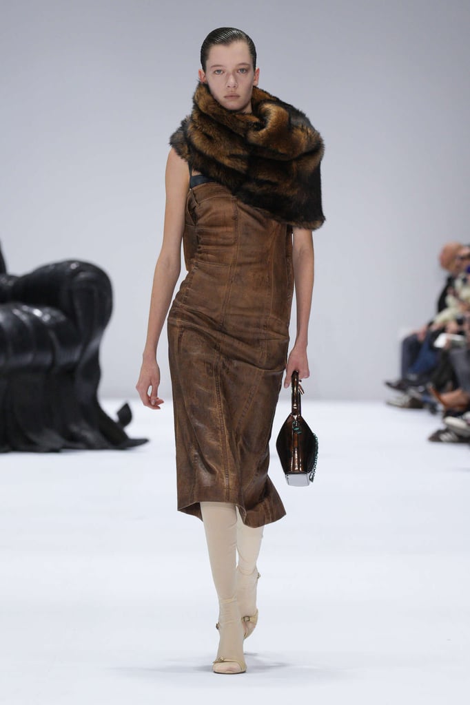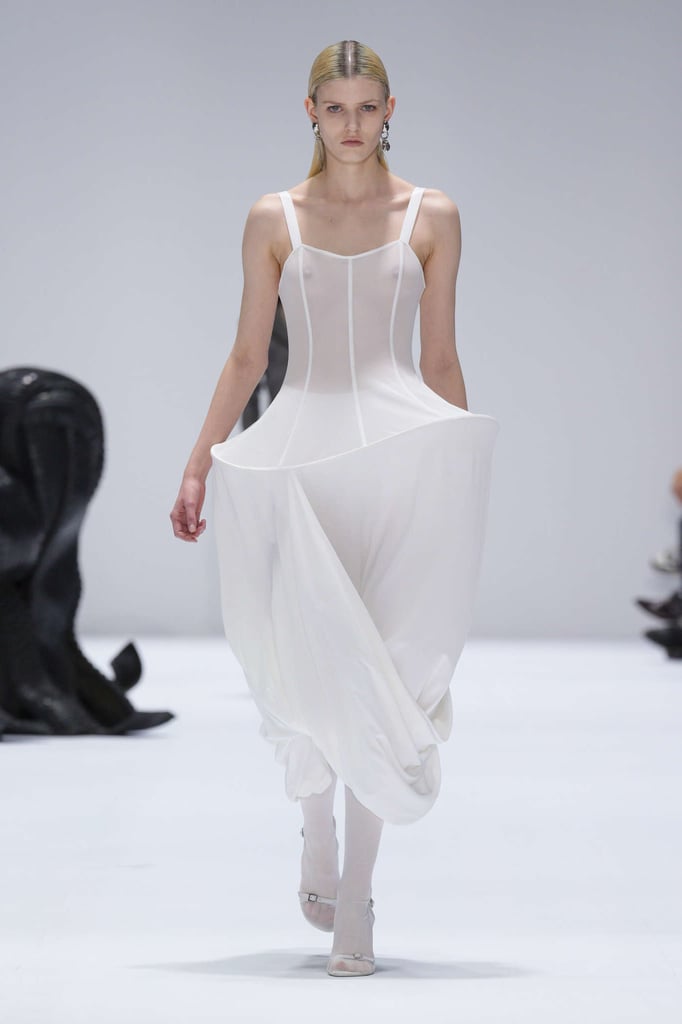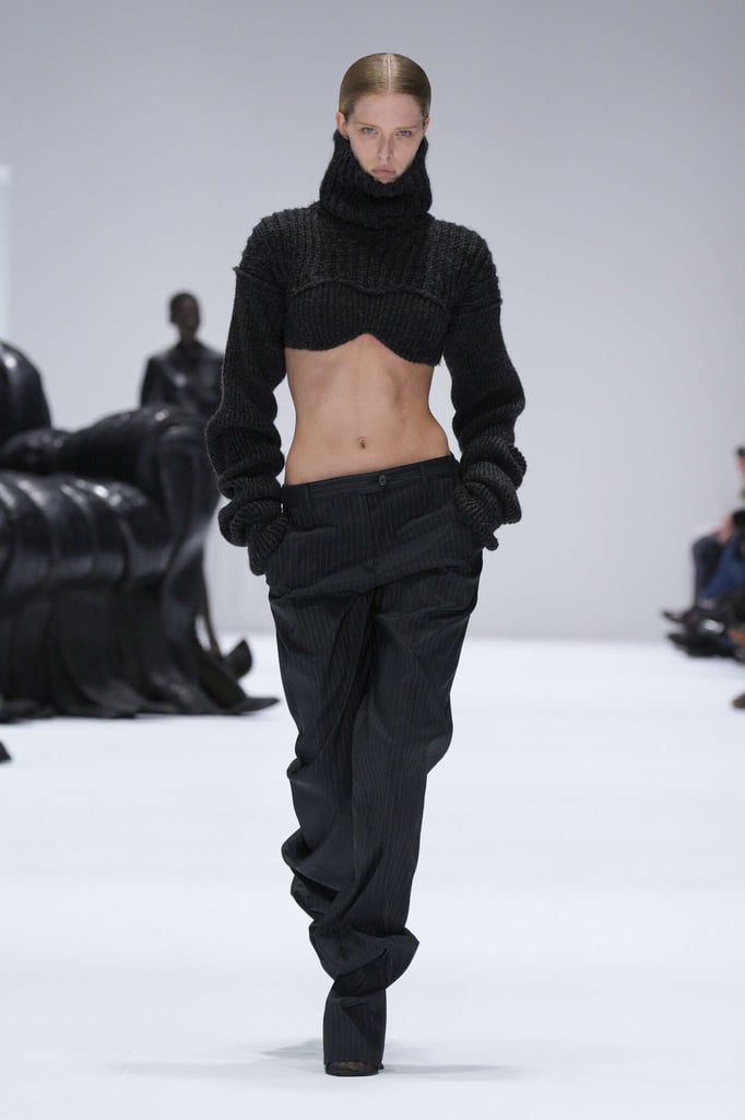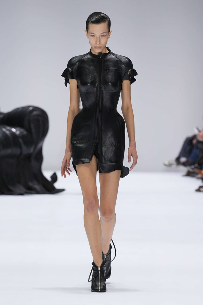 DEFILE ACNE STUDIOS A L’OBSERVATOIRE DE PARIS: Le styliste Jonny Johansson met en scène des guerrières avant-gardistes dans une collection puissante et énergique. Dans un décor cinématographique tout blanc, garni de chaises massives fabriquées avec des pneus de voitures par l’artiste estonien Villu Jaanisoo, les mannequins défilent à vive allure en total look noir ou blanc. Elles se présentent dans des silhouettes courtes en cuir ou denim, chaussant escarpins et chaussures montantes ouvertes sur le talon, et portant des lunettes futuristes et des bijoux en métal chromé comme les carrosseries des voitures. Le créateur privilégie des coupes design épurées tracées d’un trait rapide et sec, bousculant les archétypes du dressing féminin, de la fourrure, qui s’enroule en étole autour du cou, à la petite robe noire. Les modèles se parent de robes fourreaux ou de robes à baleine légères en fin jersey, ainsi que d’élégantes chemises en soie au col rehaussé, qui tire-bouchonnent tant elles semblent extensibles, assorties aux pantalons. Le body à col montant est l’une des pièces phares de la collection, entièrement dénudé dans le dos par un long zip. De même que les pièces en cuir. A l’image de ces manteaux à l’allure de tailleurs, comme sculptés avec leurs formes arrondies et rigides, de ces ensembles en peau vieillie, de ces habits nappa seconde peau ou encore de ce combishort de plongeur en néoprène.