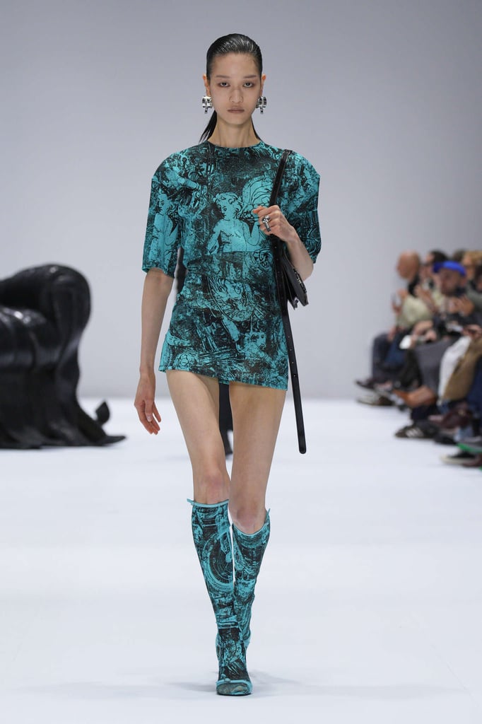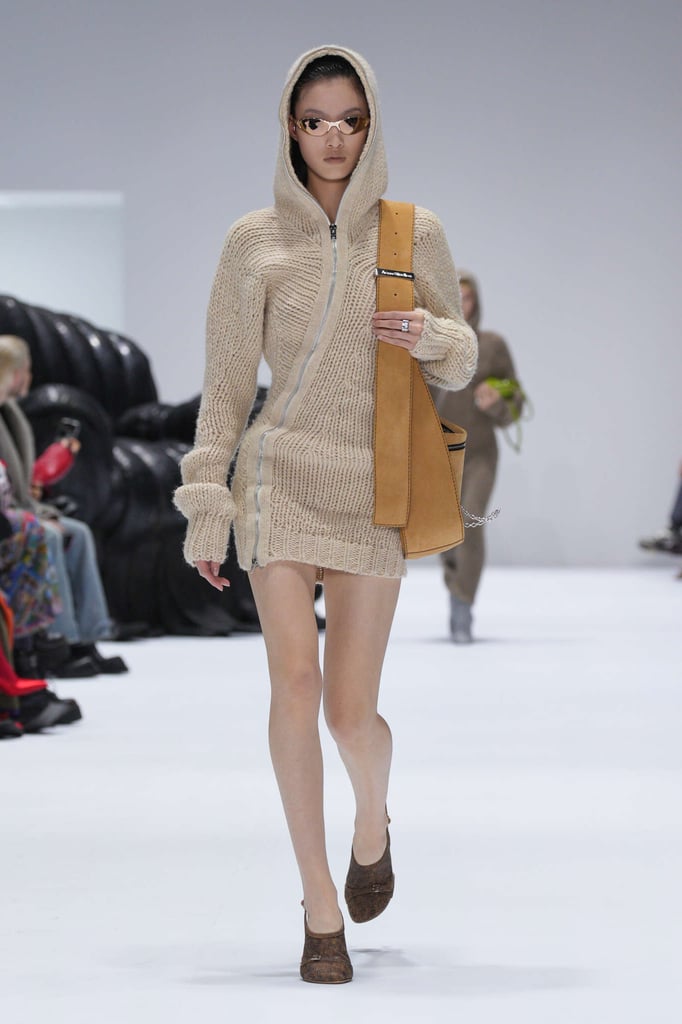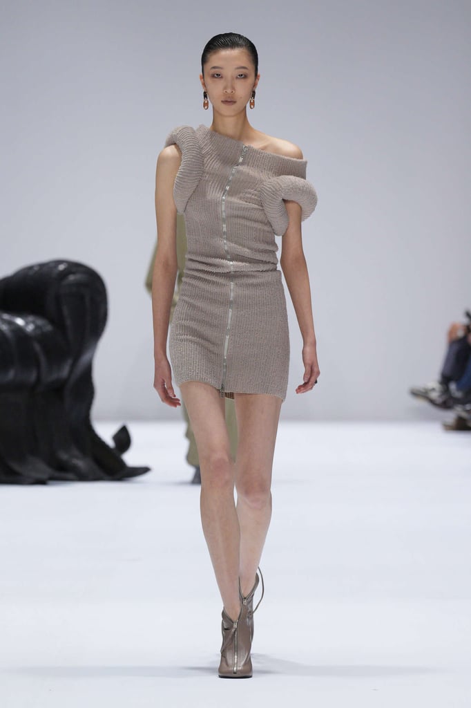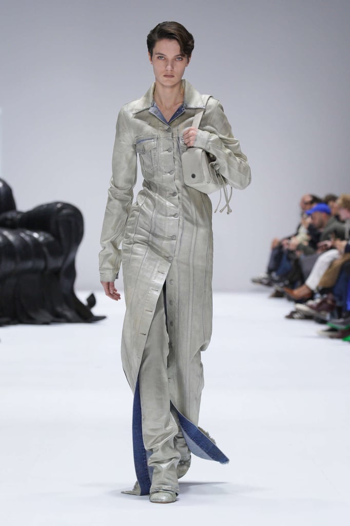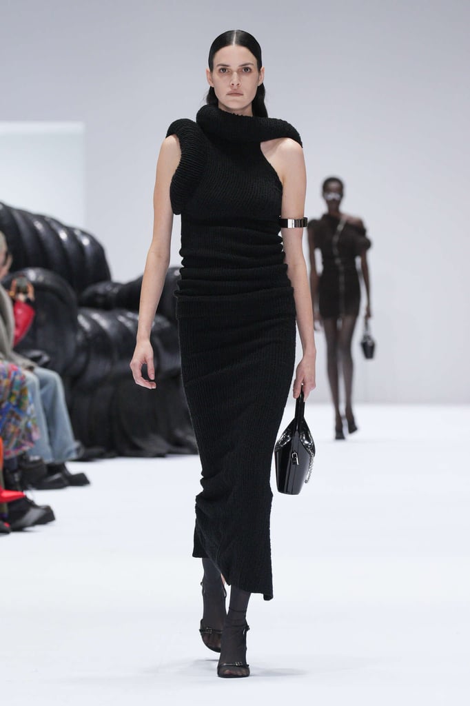 DEFILE ACNE STUDIOS A L’OBSERVATOIRE DE PARIS: Le styliste Jonny Johansson met en scène des guerrières avant-gardistes dans une collection puissante et énergique. Dans un décor cinématographique tout blanc, garni de chaises massives fabriquées avec des pneus de voitures par l’artiste estonien Villu Jaanisoo, les mannequins défilent à vive allure en total look noir ou blanc. Elles se présentent dans des silhouettes courtes en cuir ou denim, chaussant escarpins et chaussures montantes ouvertes sur le talon, et portant des lunettes futuristes et des bijoux en métal chromé comme les carrosseries des voitures. Le créateur privilégie des coupes design épurées tracées d’un trait rapide et sec, bousculant les archétypes du dressing féminin, de la fourrure, qui s’enroule en étole autour du cou, à la petite robe noire. Les modèles se parent de robes fourreaux ou de robes à baleine légères en fin jersey, ainsi que d’élégantes chemises en soie au col rehaussé, qui tire-bouchonnent tant elles semblent extensibles, assorties aux pantalons. Le body à col montant est l’une des pièces phares de la collection, entièrement dénudé dans le dos par un long zip. De même que les pièces en cuir. A l’image de ces manteaux à l’allure de tailleurs, comme sculptés avec leurs formes arrondies et rigides, de ces ensembles en peau vieillie, de ces habits nappa seconde peau ou encore de ce combishort de plongeur en néoprène.