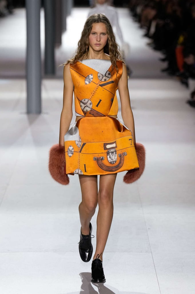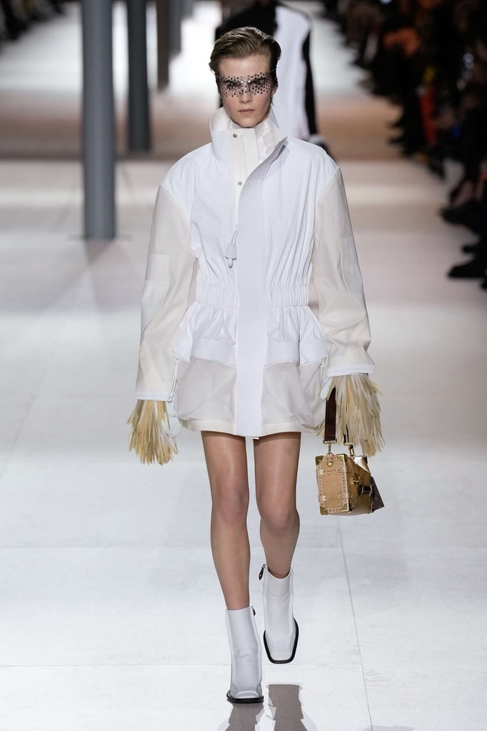 DEFILE LOUIS VUITTON DANS LA COUR CARREE DU LOUVRE: La collection synthétise parfaitement le style du directeur artistique Nicolas Ghesquière qui fêtait ses dix ans chez Louis Vuitton: sportswear actif, chic futuriste, finitions éclatantes, drapés audacieux. Le défilé s’ouvre avec des vêtements athlétiques entièrement blancs, des vestes Norfolk coupées comme des blousons à encolure haute et portées avec des jupes à volants et à poches. Puis apparaissent des robes fourreaux à paillettes et autres robes longues, des vestes de randonnée coupées comme des robes de cocktail, une remarquable série de robes bouffantes réalisées dans d’étonnantes soieries rigides imprimées comme des sacs LV et des monogrammes. Quelques robes noires laissent ensuite la place à une partie « robotique chic », une série très fraîche de gilets militaires gris mastic avec des tailles cintrées. De nombreux mannequins portent des gants en peau de mouton hirsute, tandis que d’autres sont munies de nouvelles mini valises en matelassé métallique. Le défilé se termine en beauté avec la mannequin vedette néerlandaise Rianne van Rompaey, vêtue d’une superbe robe noire à plumes asymétrique et de travers, surmontée d’une mini cape en cuir.
