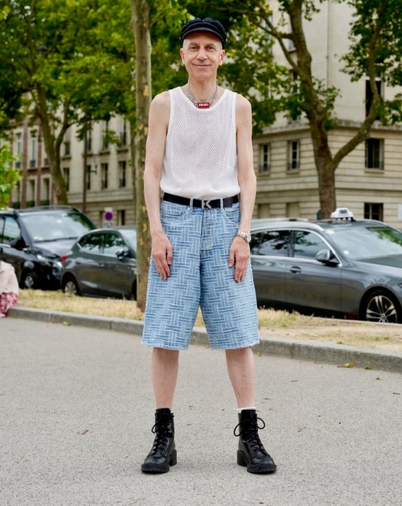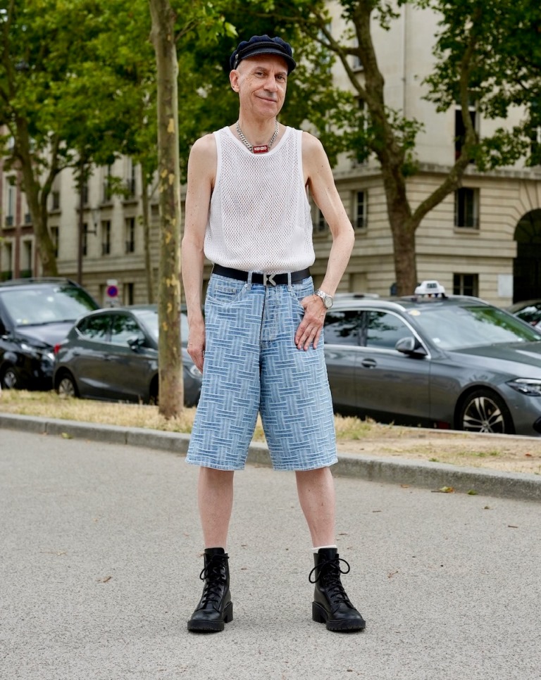 Le bermuda en jean, porté particulièrement par la chanteuse anglaise Charli XCX et la mannequin/influenceuse Bella Hadid, fait son grand retour cet été. C’est une pièce unisexe par excellence, couvrante (pour ceux/celles qui ne veulent pas trop se découvrir), large (ce qui évite d’avoir trop chaud l’été), qui se porte oversize et long jusqu’au genou pour être dans la tendance. Adapté à la ville comme à la plage, ses nombreuses poches (devant/derrière) le rendent très pratique. Qui plus est, il peut se combiner avec quasiment toutes les pièces de votre garde-robe: boots, baskets, escarpins, sweat-shirt, brassière,… Quant à moi, je porte un très beau short en jacquard texturé de la collection Kenzo Homme Eté 2025, assorti avec d’autres magnifiques pièces de cette même collection: sweat-shirt zippé à capuche en mesh, garni de perles brodées à la main; sweat-shirt blanc, également zippé, pour une version plus sobre; veste workwear brodée « Kenzo by Verdy » à la coupe boxy.