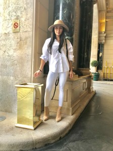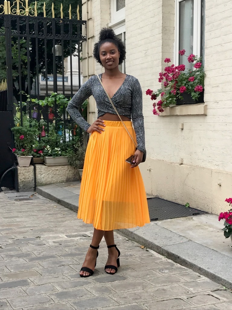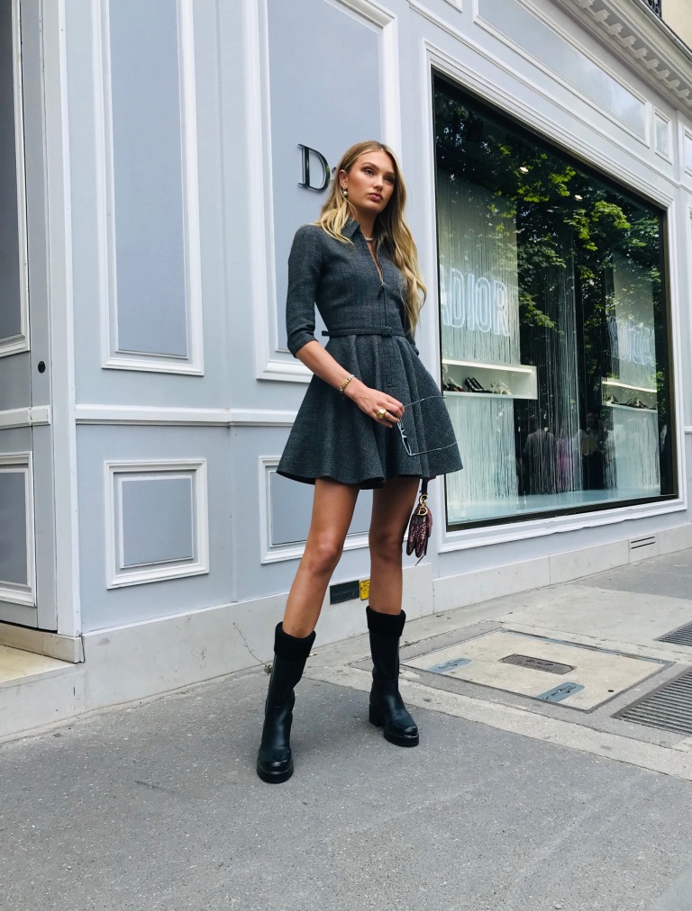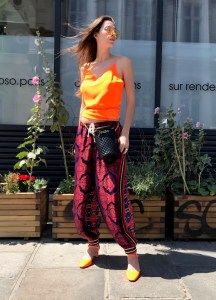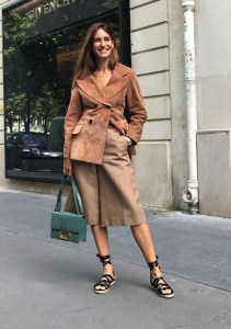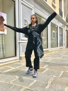 Pas d’hésitation à affronter le froid et les conditions hivernales avec des couleurs flashy pour plus de fun! L’orange se marie à merveille avec du bleu marine, du noir, du rouge et même du violet. Et pour une randonnée urbaine et stylée on choisit des boots vernies lacées, à semelles épaisses très confortables! Doudoune et jupe plissée asymétrique Kenzo; casquette officier en feutre « Abby », avec chaîne en métal, Maison Michel (collection AH 2019/2020); sac en cuir Zadig & Voltaire (collection AH 2019/2020) agrémenté d’un porte-clé à pompon Michael Kors; double collant (orange + résille); chaussettes en laine; boots vernies à lacets Steve Madden (collection AH 2019/2020)
