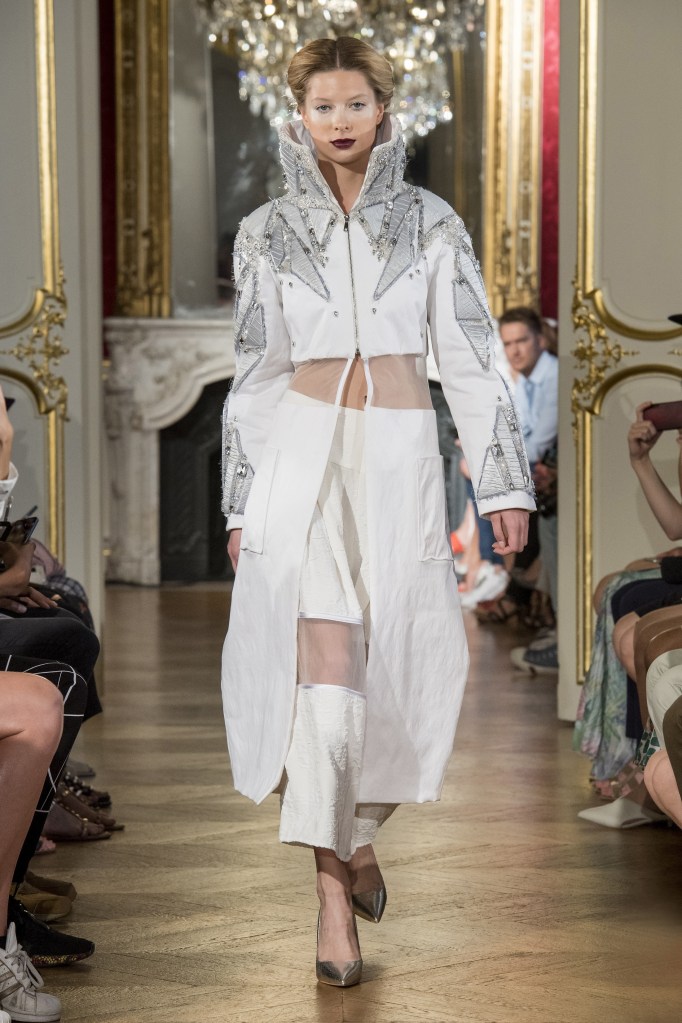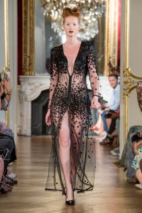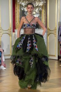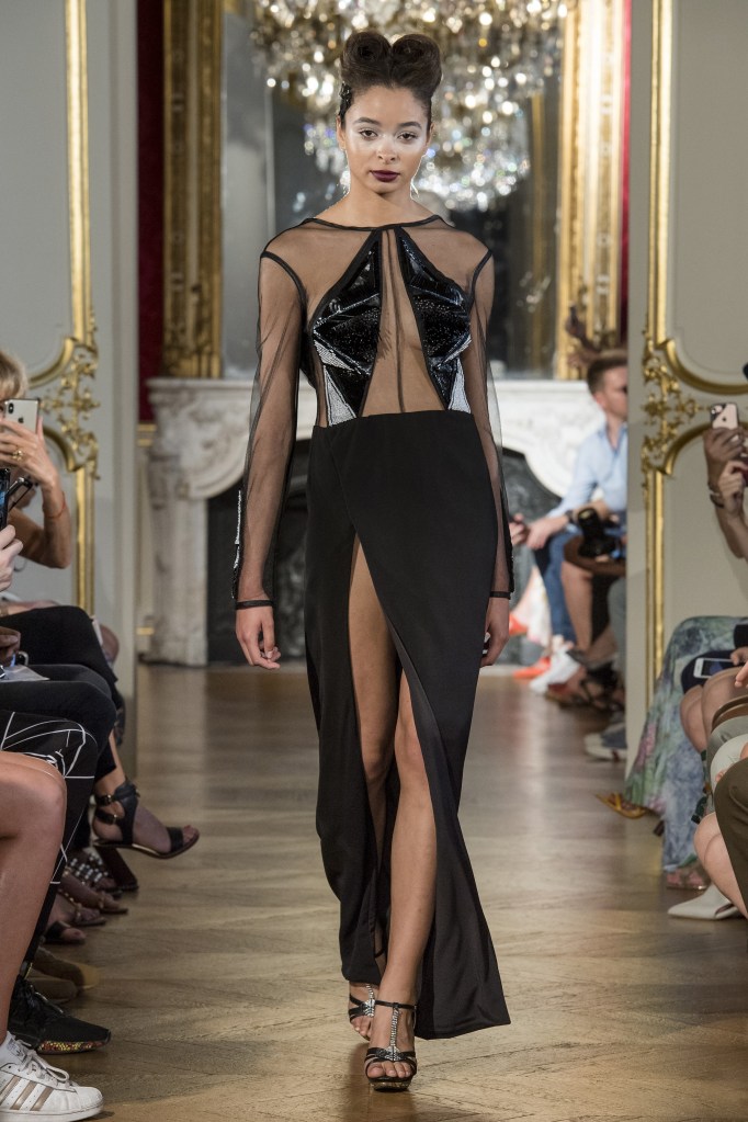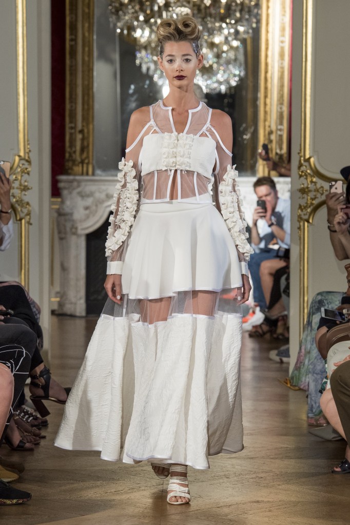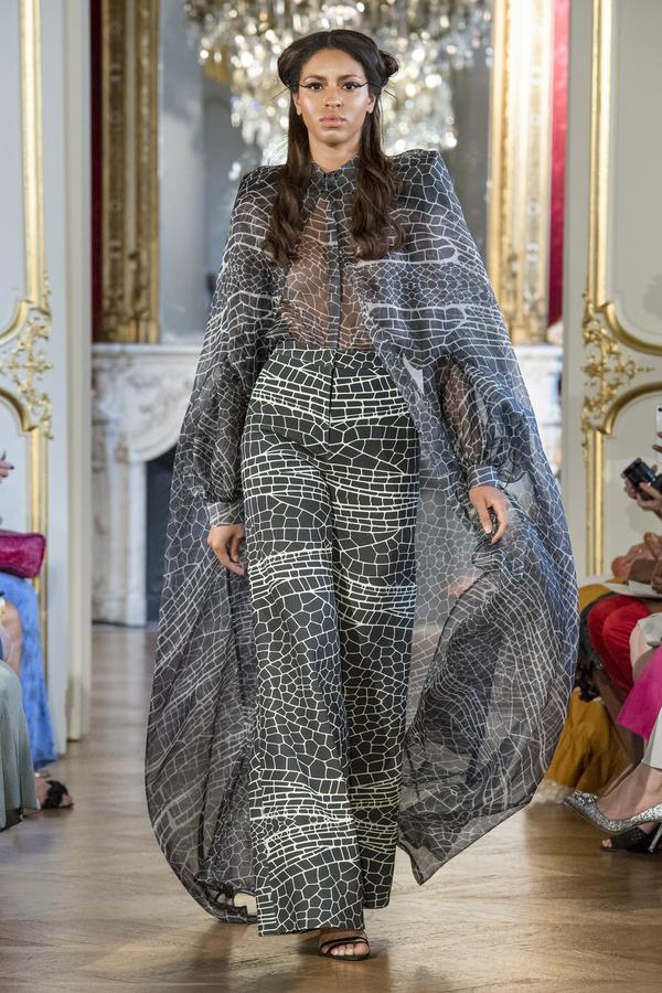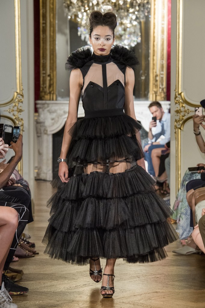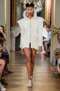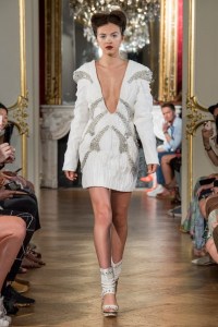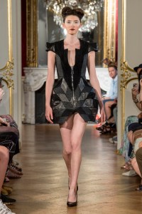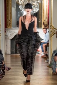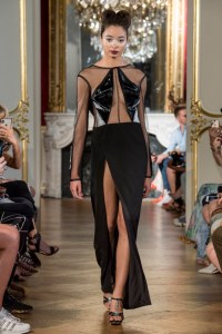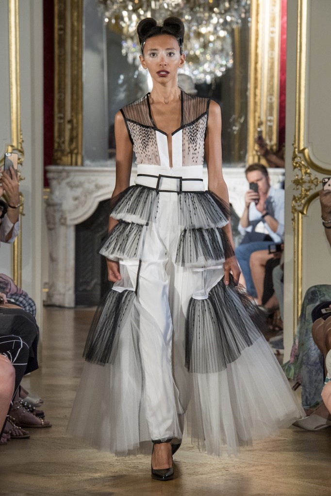 DEFILE ADELINE ZILIOX A L’HOTEL LE MAROIS – FRANCE AMERIQUES: Avec cette seconde collection couture intitulée « Black snow & White storm », inspirée par des images de mer gelée au coucher du soleil, la jeune créatrice strasbourgeoise fait également part de ses préoccupations écologiques. Se revendiquant de la « slow fashion » elle utilise des matières transformées, recyclées, dans lesquelles on retrouve certains matériaux provenant de collections précédentes. Elle transgresse quelque peu les codes de la haute couture en proposant des pièces résolument urbaines et contemporaines, aux broderies spectaculaires. Noir et blanc dominant. On aime beaucoup l’aspect créatif, asymétrique et graphique des silhouettes.