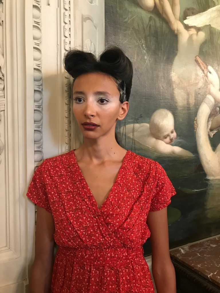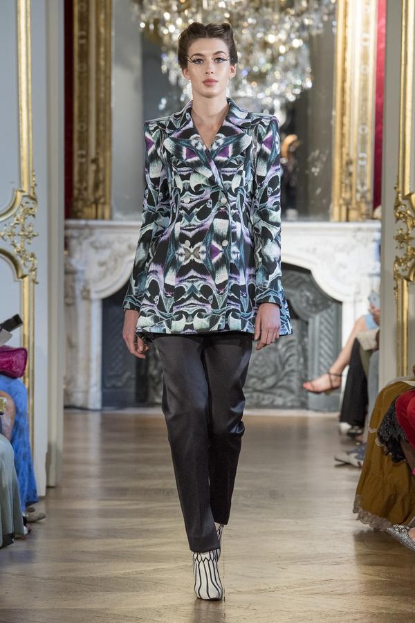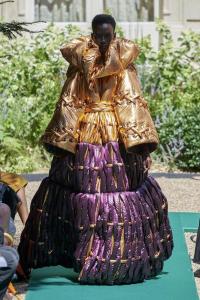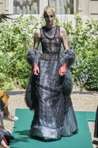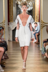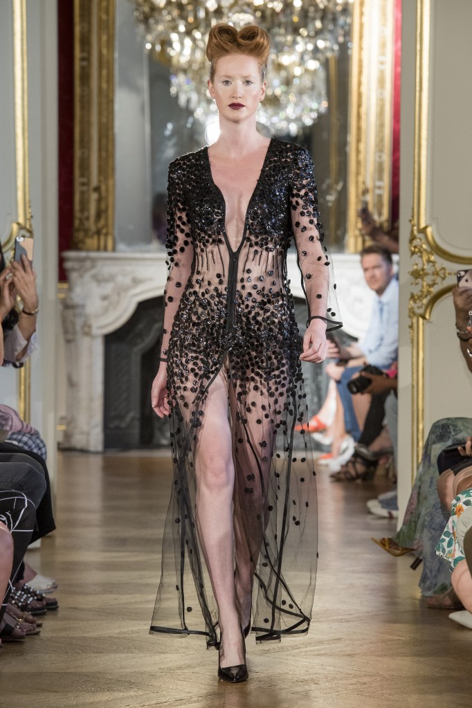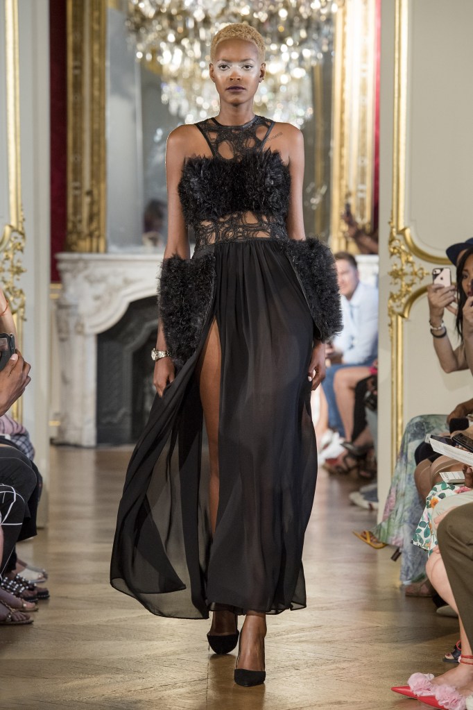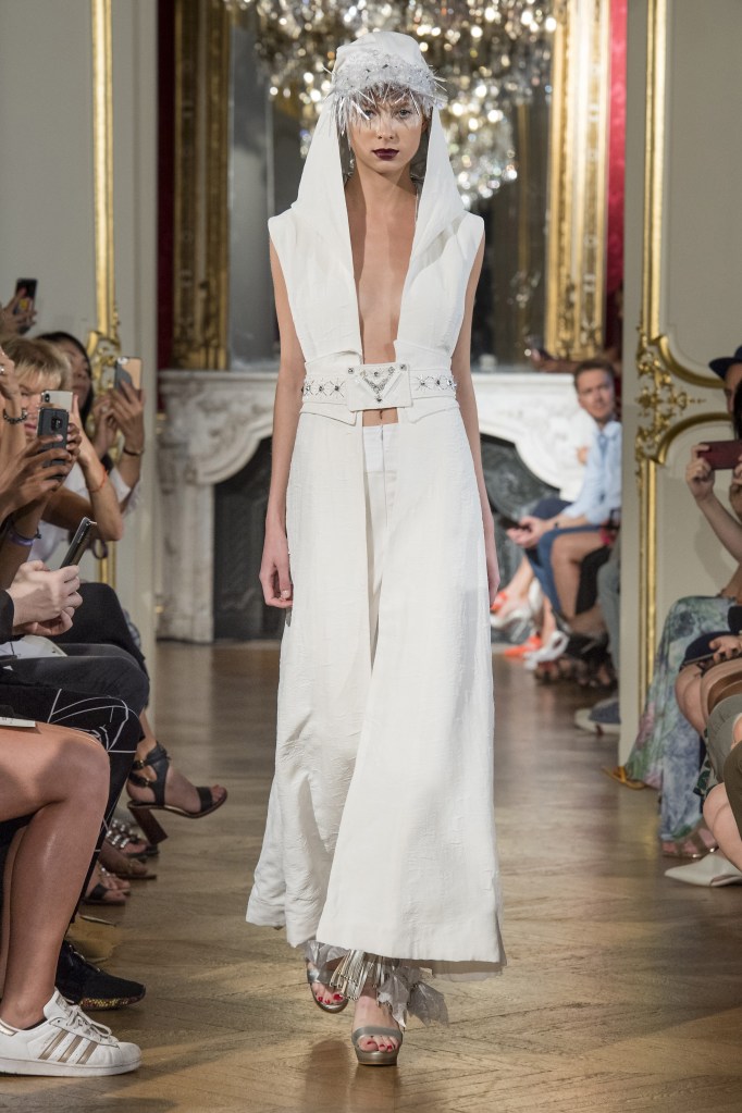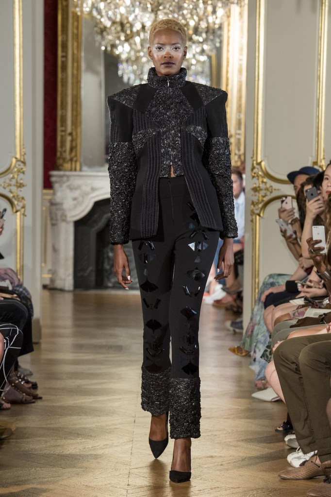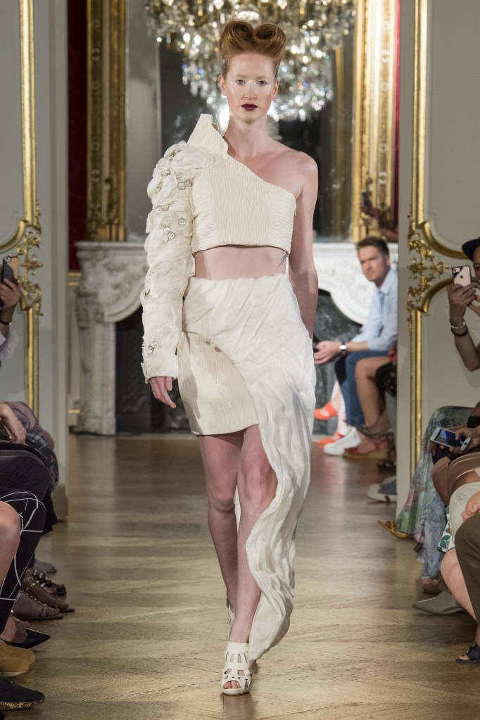 DEFILE ADELINE ZILIOX A L’HOTEL LE MAROIS – FRANCE AMERIQUES: Avec cette seconde collection couture intitulée « Black snow & White storm », inspirée par des images de mer gelée au coucher du soleil, la jeune créatrice strasbourgeoise fait également part de ses préoccupations écologiques. Se revendiquant de la « slow fashion » elle utilise des matières transformées, recyclées, dans lesquelles on retrouve certains matériaux provenant de collections précédentes. Elle transgresse quelque peu les codes de la haute couture en proposant des pièces résolument urbaines et contemporaines, aux broderies spectaculaires. Noir et blanc dominant. On aime beaucoup l’aspect créatif, asymétrique et graphique des silhouettes.