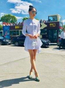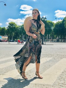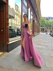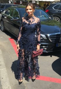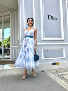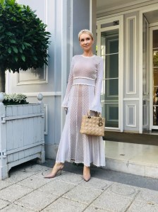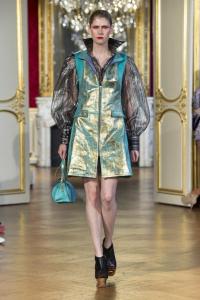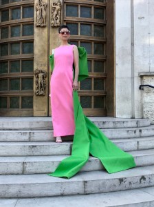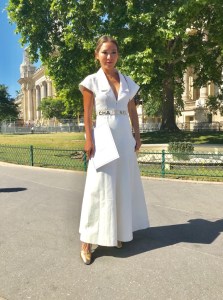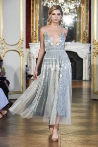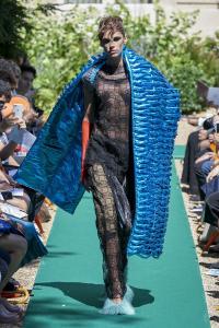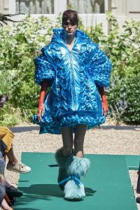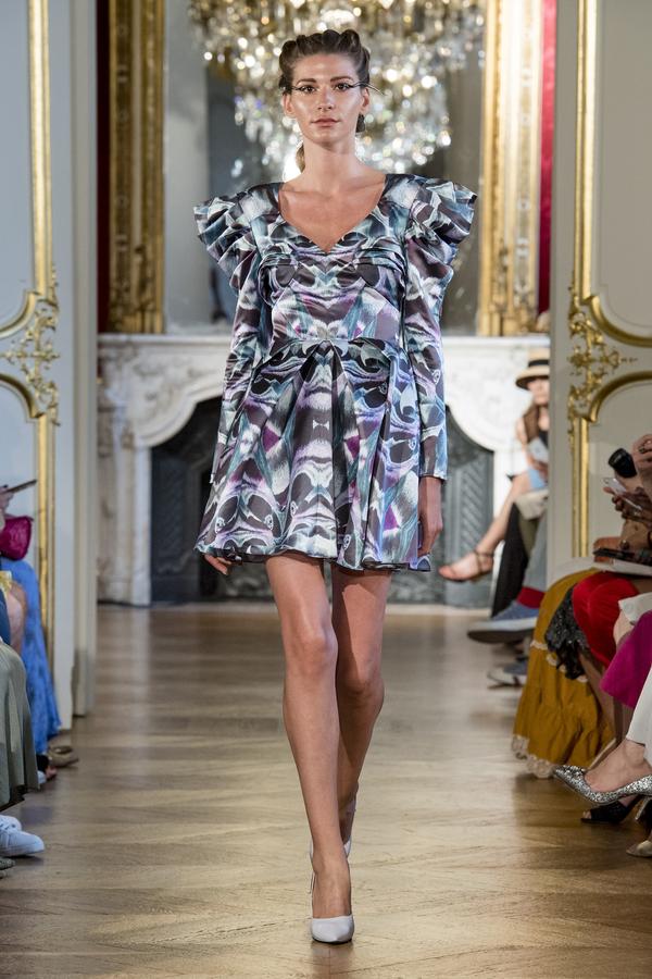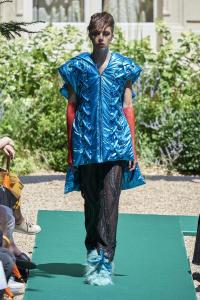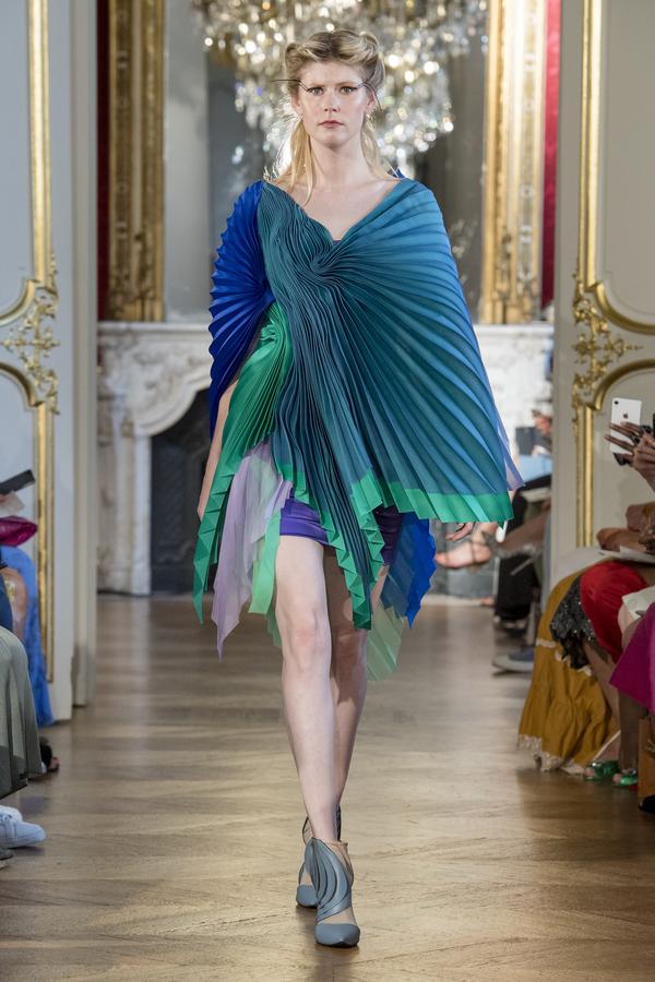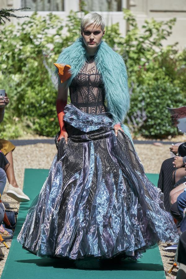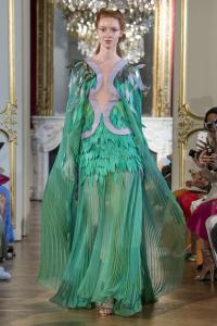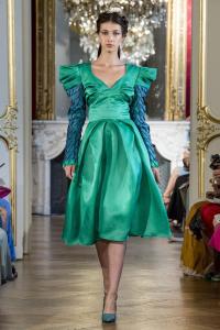 DEFILE ARMINE OHANYAN A L’HOTEL LE MAROIS – FRANCE AMERIQUES: Avec cette nouvelle collection intitulée « Let Fly » la jeune créatrice d’origine arménienne nous invite à nous évader pour découvrir l’inconnu et nous rapprocher de la nature. Ainsi la collection combine l’utilisation de matières naturelles (mousseline de soie, organza de soie, satin duchesse, coton,…) et les nouvelles technologies comme la découpe laser. De magnifiques plissés artisanaux ont été conçus par la Maison du Pli. On aime beaucoup les jolies combinaisons de bleu et de vert et les aspects graphiques de certaines tenues. La créatrice traduit également ses préoccupations écologiques en utilisant des plastiques recyclés, recouverts d’une couche d’or blanc par la maison Daumet qui entend révolutionner le monde de l’or grâce à des techniques innovantes et préservant l’environnement, issues de la recherche scientifique.