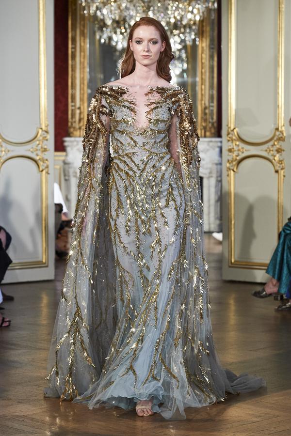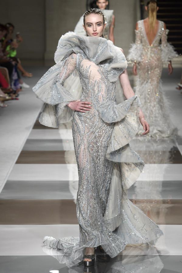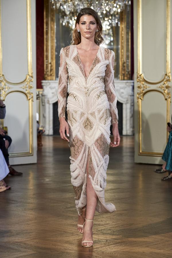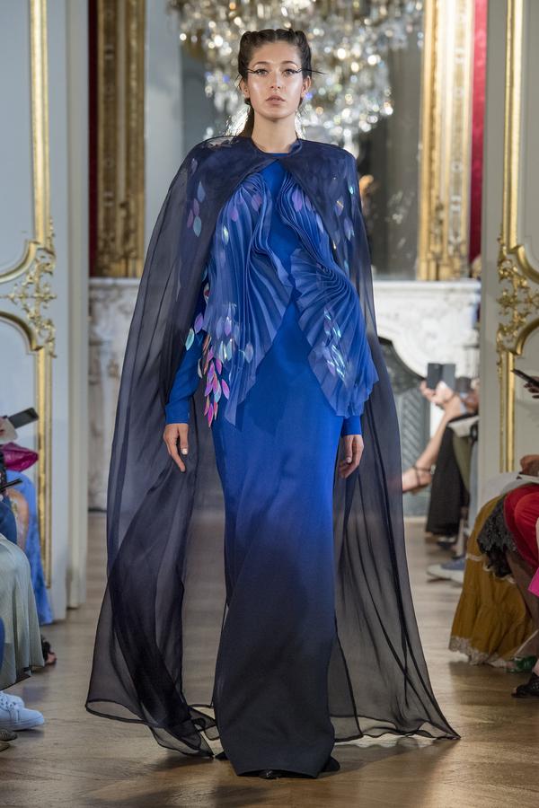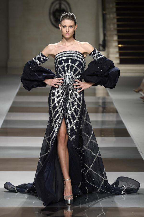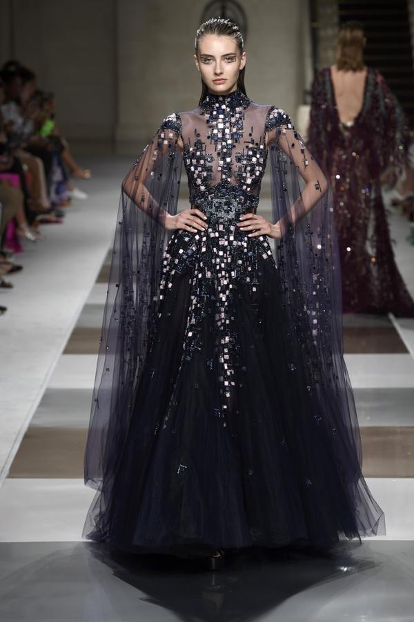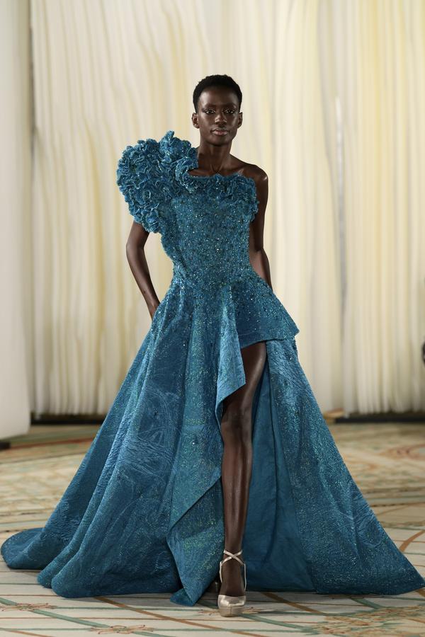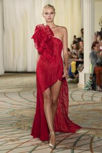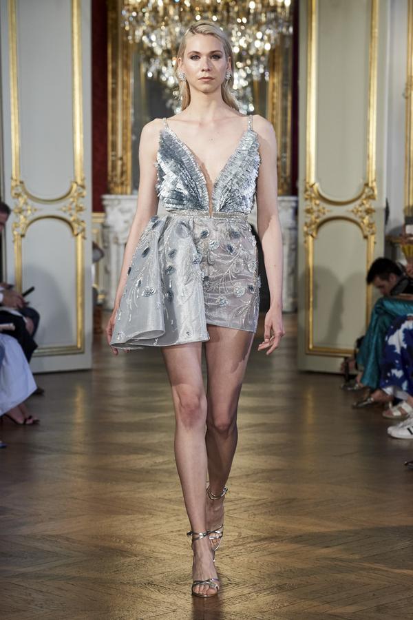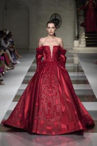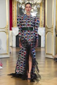 DEFILE ZIAD NAKAD AU PAVILLON CAMBON CAPUCINES: Pour cette nouvelle collection intitulée « Tessera » le couturier libanais s’est inspiré de la mosaïque antique et réalise ainsi une ode à l’architecture et à la géométrie. Mélangeant les tulles avec les chiffons, la dentelle et le velours, et maîtrisant parfaitement les coupes et les volumes, il donne à ses créations une dimension architecturale empreinte de modernité. Les silhouettes très féminines présentent des tailles marquées, ainsi que des manches oversize et asymétriques obtenues grâce à de véritables prouesses techniques tout en donnant une grande impression de légèreté. Les broderies ont été imaginées comme un assemblage de tesselles d’une mosaïque. Tout ceci se décline dans une palette de couleurs variées et raffinées avec du rouge, du bleu, du doré, de l’argenté et des pointes de noir.