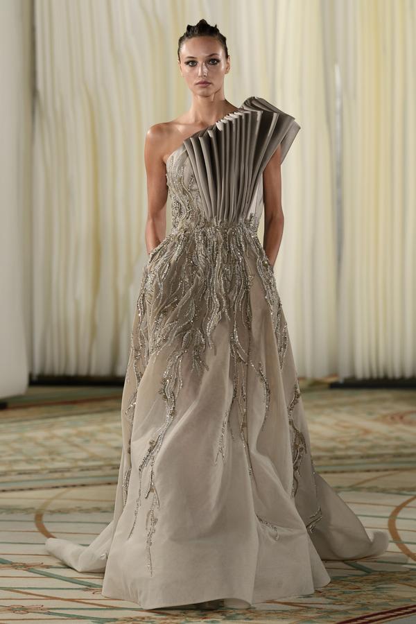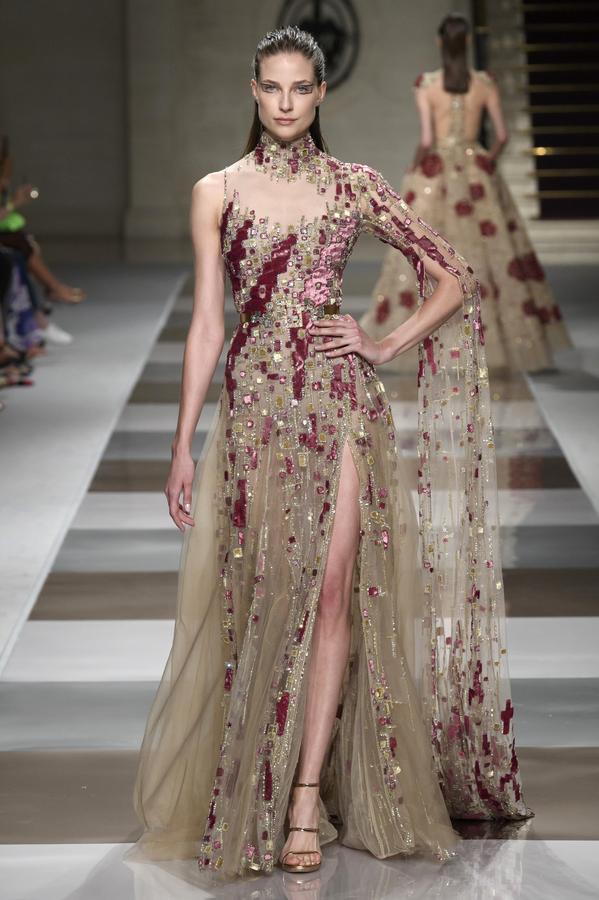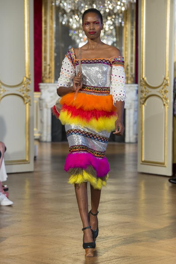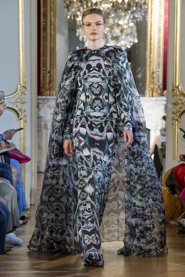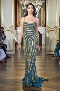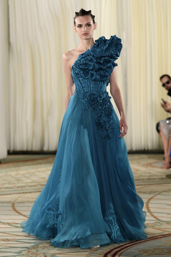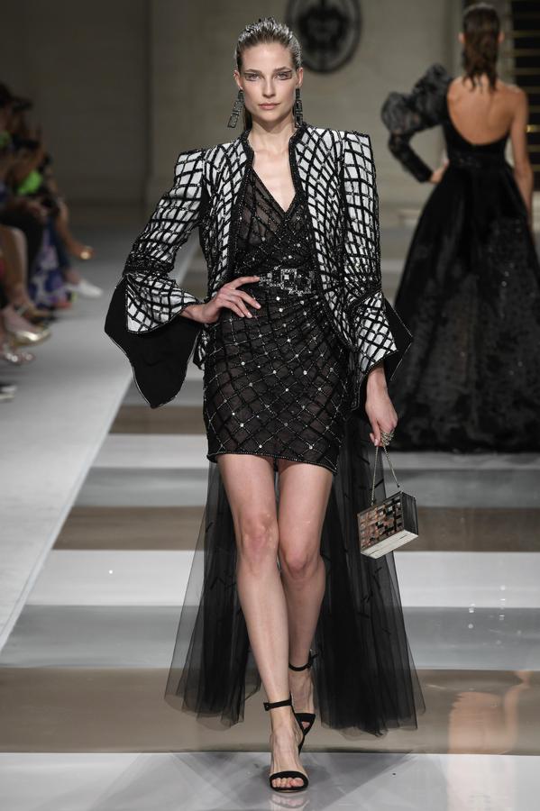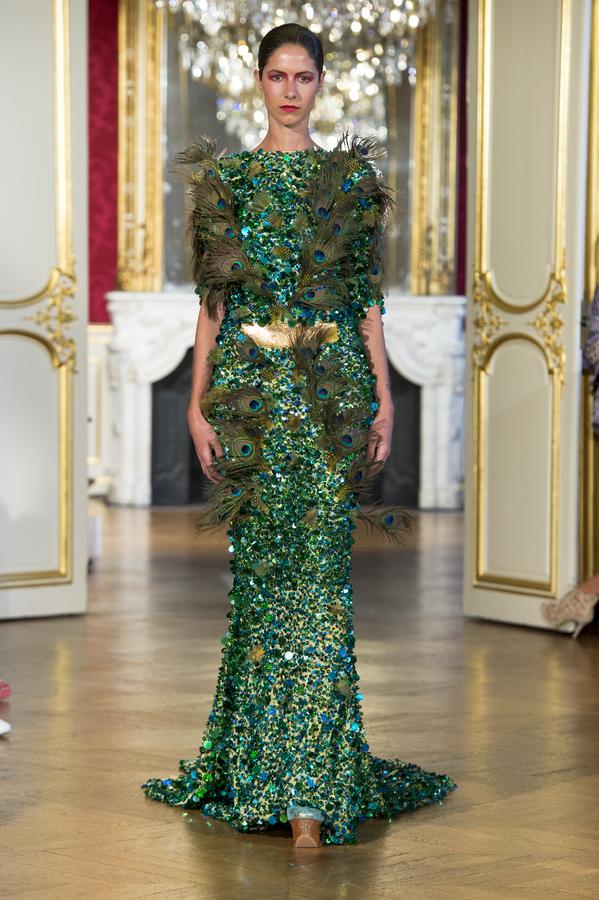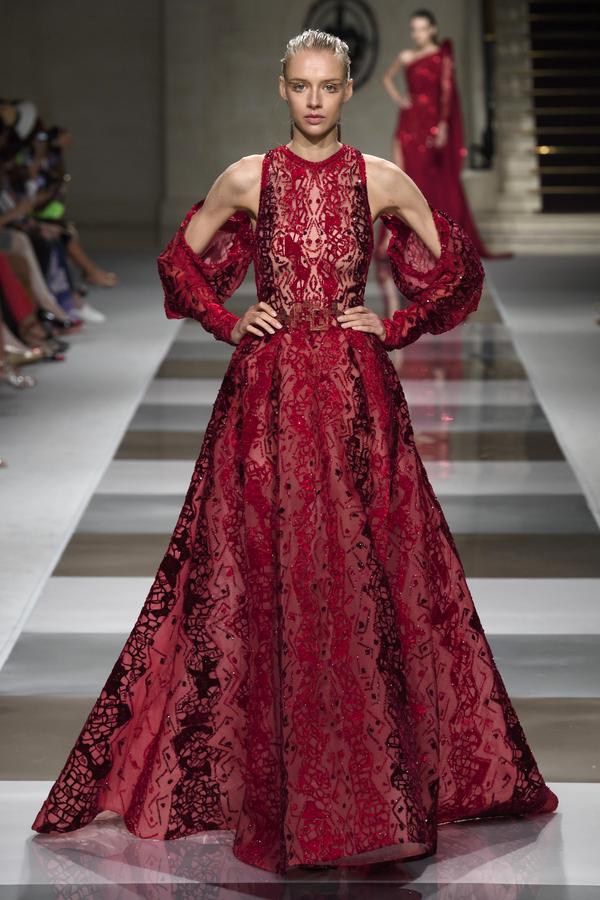 DEFILE ZIAD NAKAD AU PAVILLON CAMBON CAPUCINES: Pour cette nouvelle collection intitulée « Tessera » le couturier libanais s’est inspiré de la mosaïque antique et réalise ainsi une ode à l’architecture et à la géométrie. Mélangeant les tulles avec les chiffons, la dentelle et le velours, et maîtrisant parfaitement les coupes et les volumes, il donne à ses créations une dimension architecturale empreinte de modernité. Les silhouettes très féminines présentent des tailles marquées, ainsi que des manches oversize et asymétriques obtenues grâce à de véritables prouesses techniques tout en donnant une grande impression de légèreté. Les broderies ont été imaginées comme un assemblage de tesselles d’une mosaïque. Tout ceci se décline dans une palette de couleurs variées et raffinées avec du rouge, du bleu, du doré, de l’argenté et des pointes de noir.