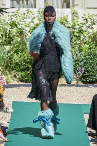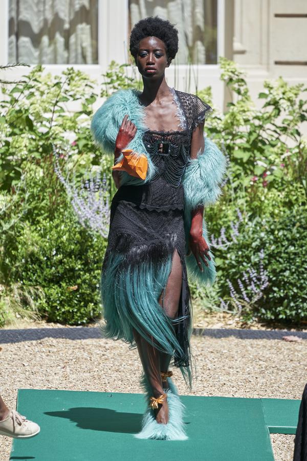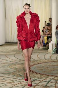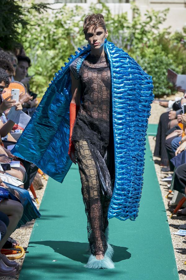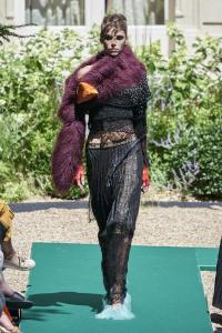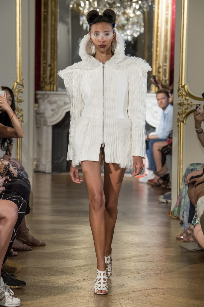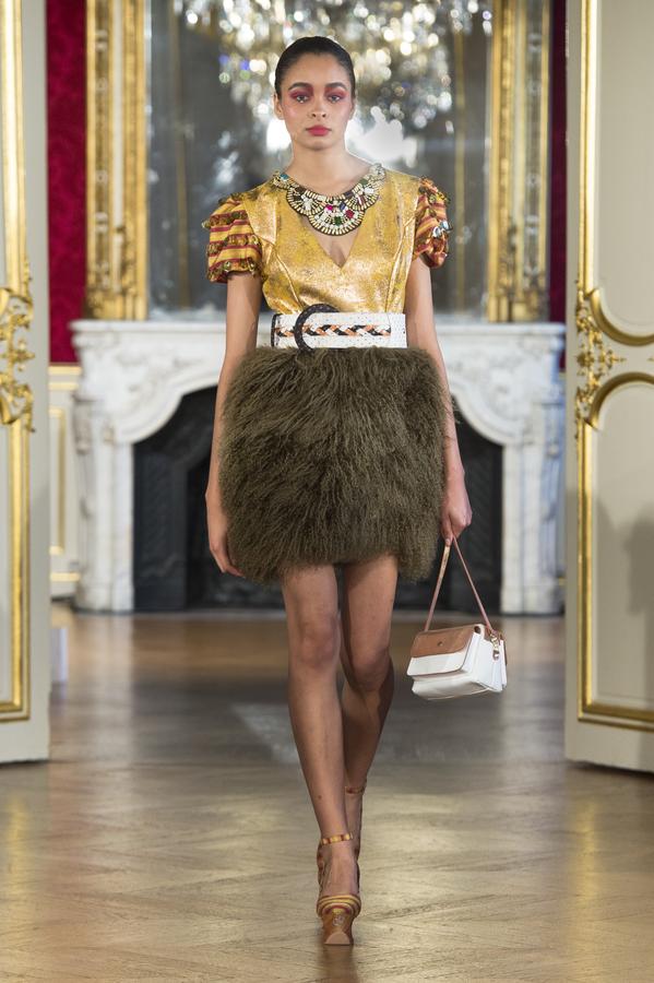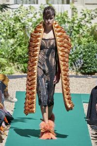 DEFILE ANTONIO ORTEGA A L’AMBASSADE DU CANADA: Avec cette nouvelle collection intitulée « Nomade » le créateur mexicano-canadien s’adresse aux nomades des temps modernes qui doivent affronter les éléments mais s’en amusent avec style et élégance. Les silhouettes grandiloquentes dégagent un esprit tout à la fois sauvage et futuriste. Omniprésentes dans la collection, les fourrures (synthétiques) sont produites grâce à des technologies innovantes. Les chaussures poilues et colorées reposent sur un talon imprimé en 3D. Les pièces sont ornées de tressages de matériaux et d’ajouts de cuir. On retrouve également les contrastes chers au créateur: de la fine dentelle côtoie des cheveux synthétiques déchaînés, des cordes a priori grossières se révèlent être, de plus près, une confection de tissu thermique métallisé.