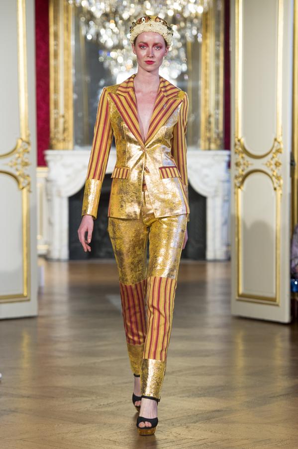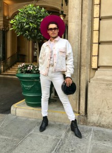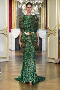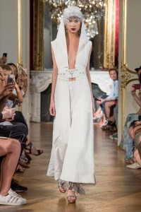 DEFILE PATRICK PHAM A L’HOTEL LE MAROIS – FRANCE AMERIQUES: Pour cette nouvelle collection intitulée « La Perle de l’Extrême-Orient » le créateur français d’origine vietnamienne s’est inspiré de ses souvenirs d’enfance au Vietnam et redécouvre les tissages ancestraux: « Lanh My A », un tissage de la soie spécial dont la technique de teinture prend près de cinq mois; le brocart, tissu de coton, de lin ou de chanvre fabriqué à la main, teint de multiples couleurs à partir de plantes sauvages et orné de motifs représentant chaque groupe ethnique. Le créateur revisite le brocart en le mélangeant à d’autres matériaux comme la peau de cheval et la fourrure de bétail: il le décline dans des silhouettes combinant le rythme effréné d’une Tzigane et le look sexy d’une Bohémienne, réunissant ainsi deux univers, le brocart rustique et le romantisme parisien. Concluant ce défilé coloré et exubérant, sa robe de mariée est réalisée avec une matière innovante, la soie de fleurs de jacinthe.