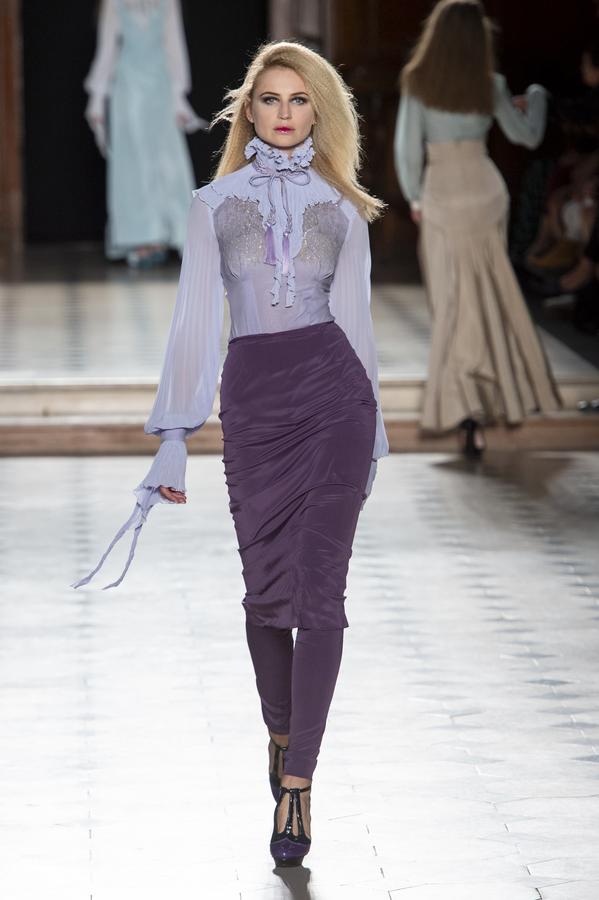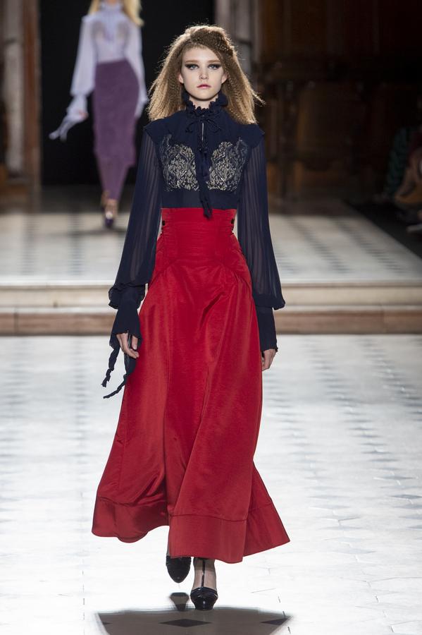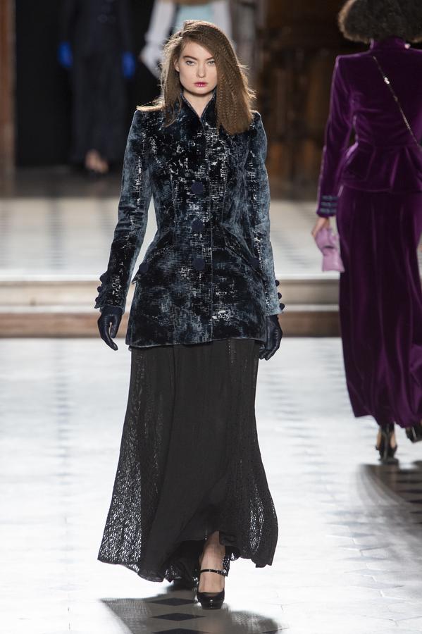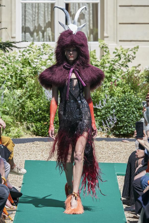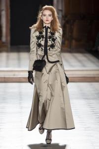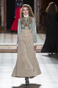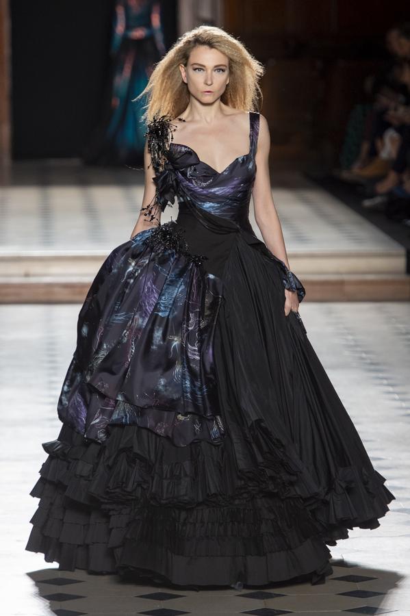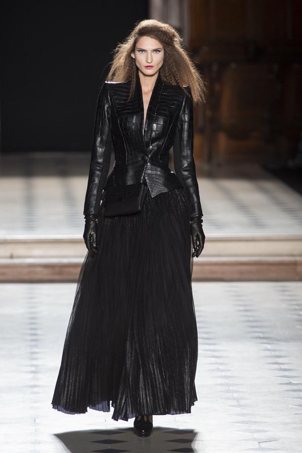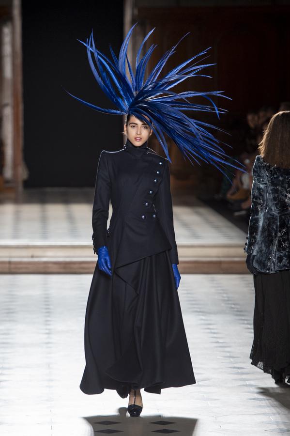 DEFILE JULIEN FOURNIE A L’ORATOIRE DU LOUVRE: Pour cette nouvelle collection intitulée « Premier Sortilège » et célébrant le dixième anniversaire de sa Maison, le jeune couturier français a trouvé son inspiration chez les magiciennes, les sorcières, les héroïnes de romans gothiques et autres stars de films noirs et entend rendre un hommage particulier à toutes les femmes transgressant les codes qui leur sont imposés par les sociétés patriarcales. Leurs silhouettes mythiques sont mises au goût du jour et deviennent de diaboliques beautés. Cols montants, plastrons brodés sur chemisiers en mousseline plissée s’associent à de longues jupes amples. La coupe des vestes, des manteaux et des robes trompe-l’oeil de manteau, les carrures renforcées et les boutonnages apparents dégagent une rigueur toute militaire. Les cuirs précieux (python, alligator) sculptent les bustes et les tailles tout en souplesse. Corbeaux et autres oiseaux de malheur s’invitent sur les coiffes, bonnet, capeline, au travers de plumes brodées qui subliment les looks.