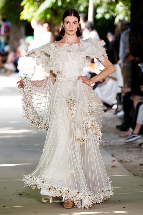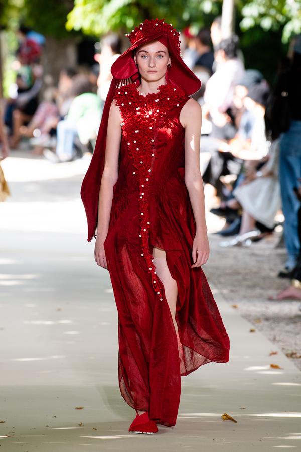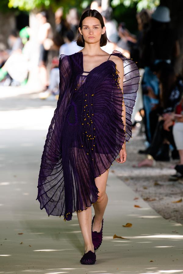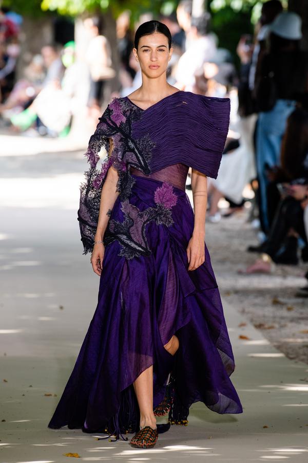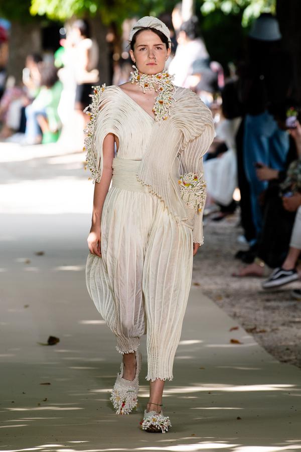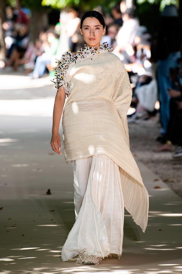 DEFILE VAISHALI S DANS LES JARDINS DU LYCEE VICTOR DURUY: Pour son premier défilé à Paris, la créatrice indienne Vaishali Shadangule, à la tête de la marque Vaishali S, a présenté une collection intitulée « Breathe » inspirée par la nécessité de respirer et l’idée de reconnexion avec la nature suite à la pandémie. Elle utilise des toiles tissées manuellement de façon artisanale, comme le « khand », pour dessiner des silhouettes asymétriques et créer des volumes plissés. L’hommage à ses origines dépasse la représentation classique du sari, le vêtement traditionnel indien, pour explorer des tissages comme le macramé et donner forme à des détails frangés et des manches subtiles rappelant de petits jardins de fleurs. Les tenues les plus sophistiquées mêlent, quant à elles, corsets et robes structurées. Certaines silhouettes font penser à des ailes de papillon, des feuilles végétales ou des sirènes sortant de l’eau, émergeant d’une brassée d’algues. Le blanc et le noir se combinent à des tonalités violettes, dorées, grenat ou bleu-vert. La mariée qui clôt le défilé porte une robe asymétrique jouant sur les superpositions et les transparences dans un esprit contemporain.