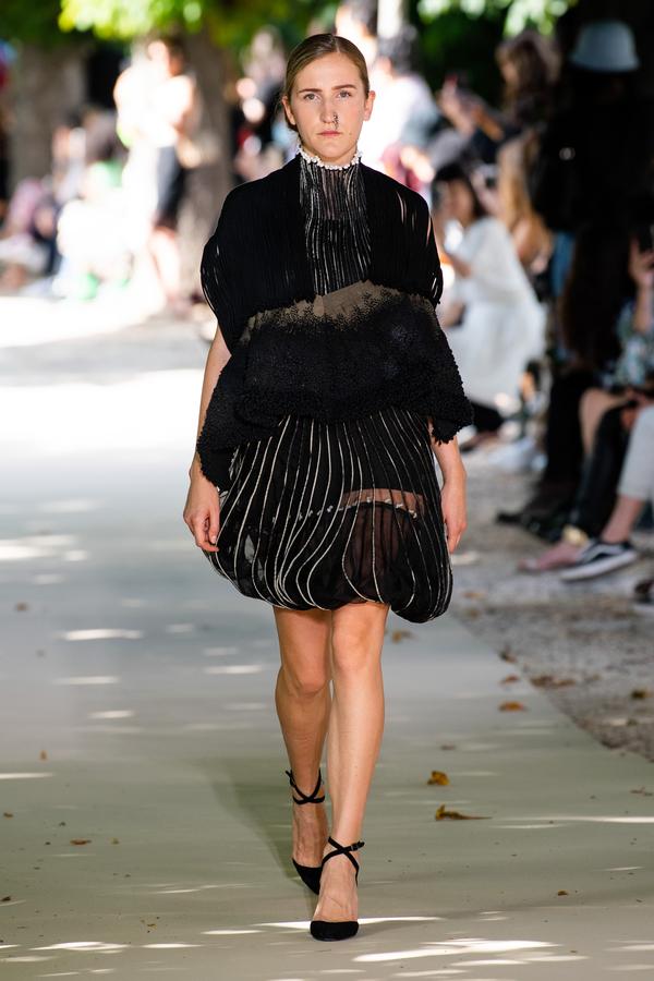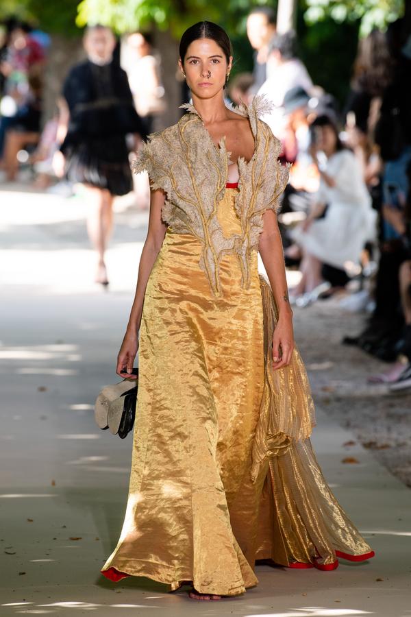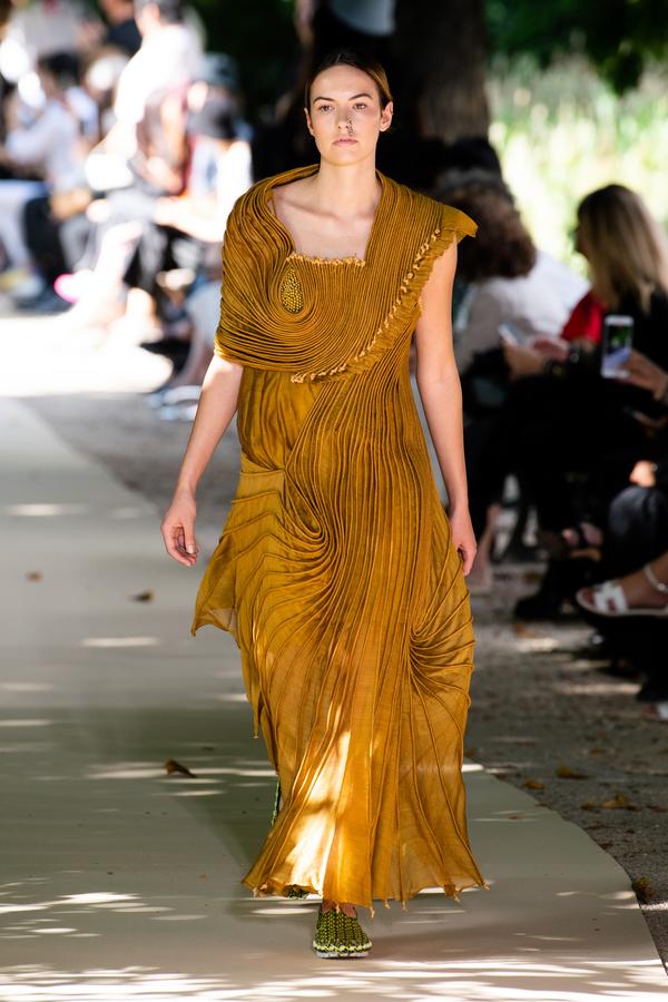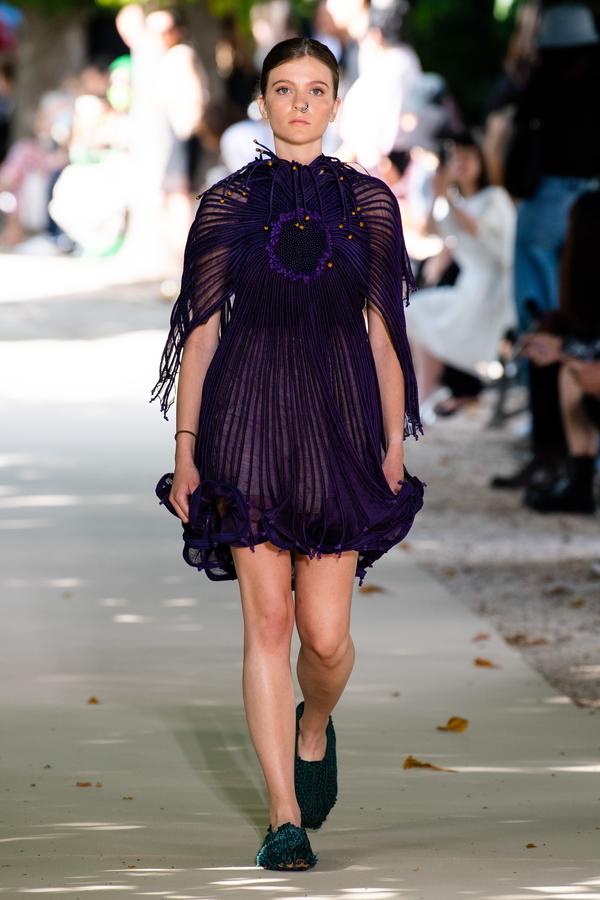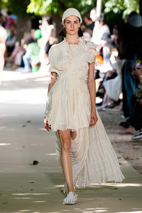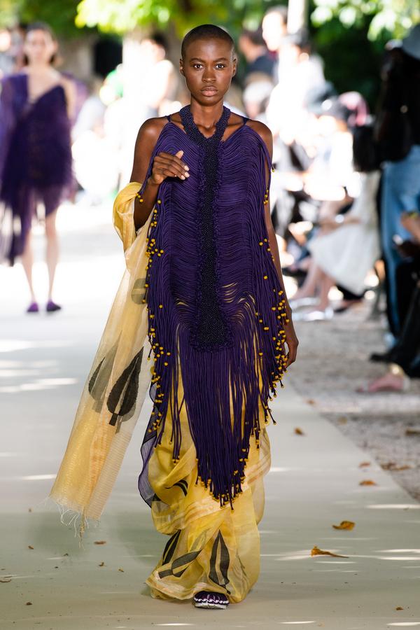 DEFILE VAISHALI S DANS LES JARDINS DU LYCEE VICTOR DURUY: Pour son premier défilé à Paris, la créatrice indienne Vaishali Shadangule, à la tête de la marque Vaishali S, a présenté une collection intitulée « Breathe » inspirée par la nécessité de respirer et l’idée de reconnexion avec la nature suite à la pandémie. Elle utilise des toiles tissées manuellement de façon artisanale, comme le « khand », pour dessiner des silhouettes asymétriques et créer des volumes plissés. L’hommage à ses origines dépasse la représentation classique du sari, le vêtement traditionnel indien, pour explorer des tissages comme le macramé et donner forme à des détails frangés et des manches subtiles rappelant de petits jardins de fleurs. Les tenues les plus sophistiquées mêlent, quant à elles, corsets et robes structurées. Certaines silhouettes font penser à des ailes de papillon, des feuilles végétales ou des sirènes sortant de l’eau, émergeant d’une brassée d’algues. Le blanc et le noir se combinent à des tonalités violettes, dorées, grenat ou bleu-vert. La mariée qui clôt le défilé porte une robe asymétrique jouant sur les superpositions et les transparences dans un esprit contemporain.