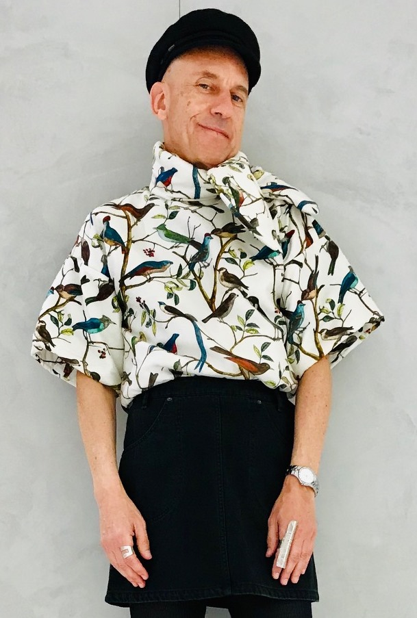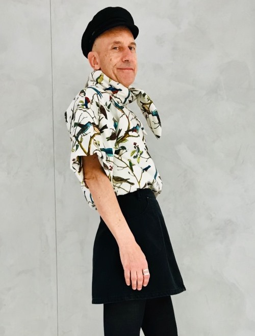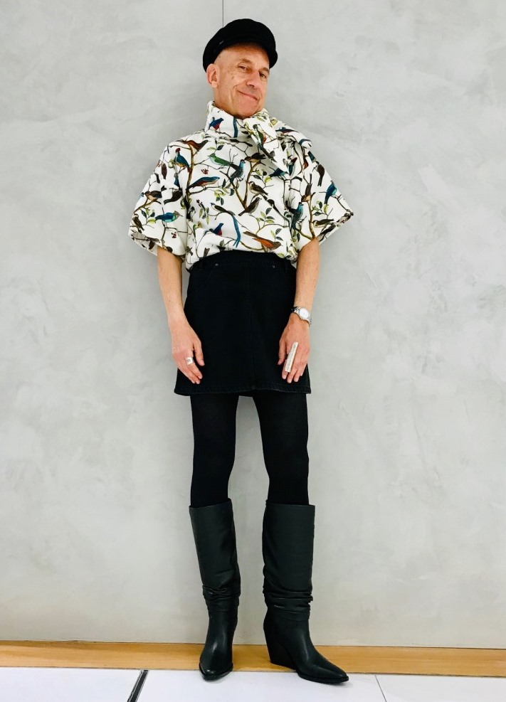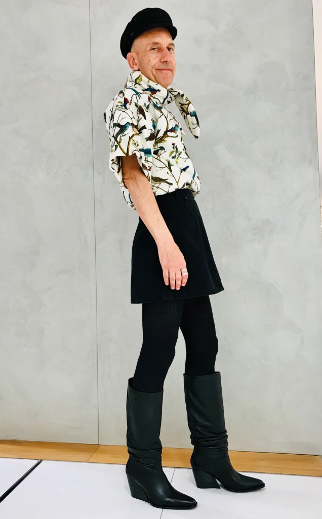 Parfois, un look tient à une seule pièce, comme avec ce superbe top en soie de Kenzo. Cette pièce très fashion se démarque par son splendide imprimé « Tapestry of Birds » qui célèbre la nature dans un joyeux festival de couleurs mettant en scène les oiseaux. Sont tout aussi remarquables le col avec noeud détachable et la coupe boxy (ample) qui lui donnent un style fort. Pour compléter le look: jupe courte en jean et bottes à talon en cuir avec effet drapé au-dessus de la cheville (ces trois pièces sont issues de la collection Kenzo automne-hiver 2021/2022), casquette Galeries Lafayette, collant en laine Falke, bagues en métal argenté Clara Jasmine.