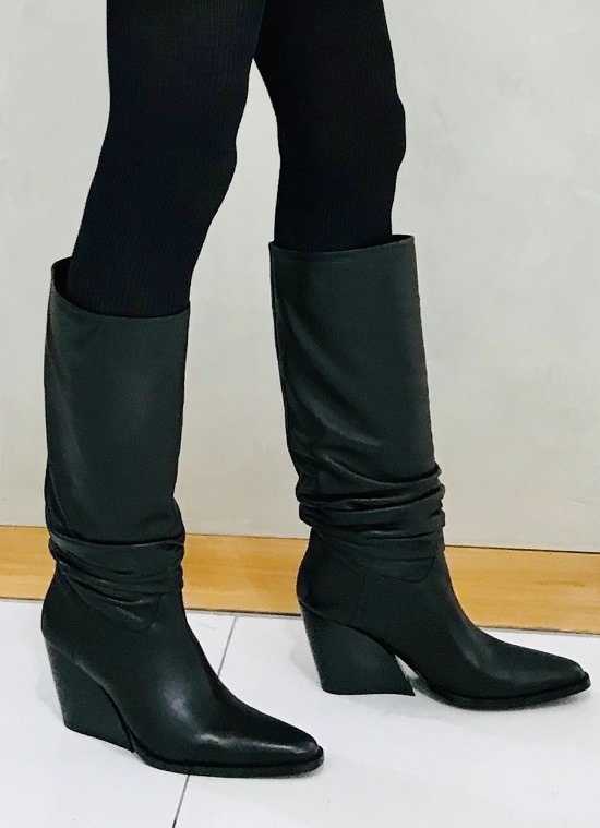 Un très joli look pour les fêtes, particulièrement original, avec cette magnifique robe Kenzo très stylée grâce à son col montant zippé qui se ferme par un bouton-pression et ses rayures sublimées par cette superbe tonalité vert absinthe très flashy. Un vent de fraîcheur et de liberté pour cet hiver! Le look se complète à merveille avec ces bottes en cuir plissé souple dont l’effet drapé au-dessus de la cheville est remarquable; talon à la forme originale très confortable pour marcher; bout pointu (également collection Kenzo automne-hiver 2021/2022). Accessoires: casquette Galeries Lafayette, bagues en métal argenté Clara Jasmine.