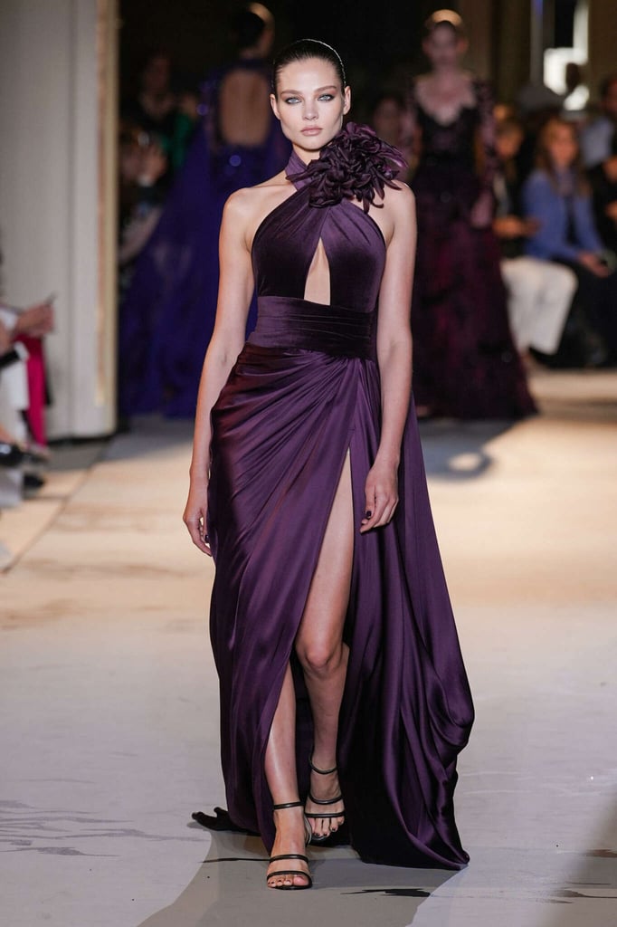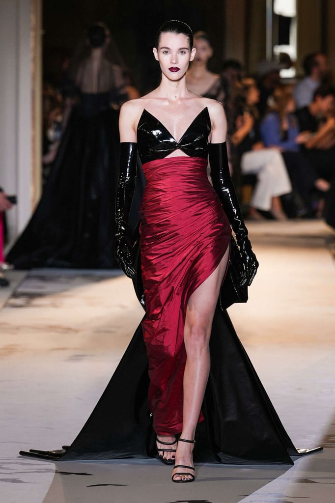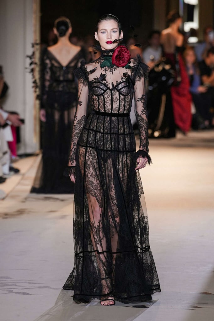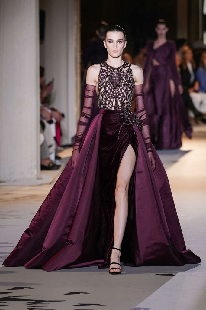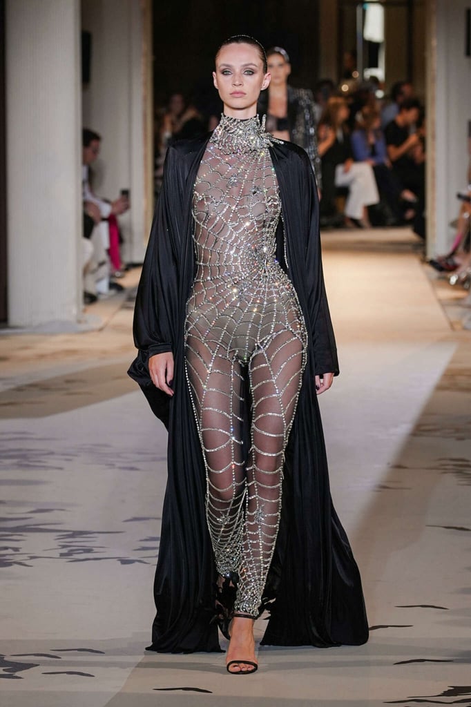 DEFILE ZUHAIR MURAD A L’HÔTEL POTOCKI: Comme plusieurs autres designers cette saison, le couturier libanais a exprimé son savoir-faire à travers des volumes plus sobres et des créations moins chargées de broderies et de pierreries qu’à son habitude. Des silhouettes en dentelle accompagnent des looks plissés et drapés. Intitulée « Midnight scent » (Parfum de minuit), la collection habille de mystérieuses femmes fatales, de séduisantes vampires et des princesses gothiques. Les robes brodées semi-transparentes osent des empiècements en dentelle, portées avec des blazers en velours ajourés à la taille, des voiles en gaze et des décorations en plumes d’autruche. Les jeux de proportions sont présents avec de longues traînes fluides, des jupes longues construites avec des fleurs en organza, des cascades de volants aux épaules et des vestes courtes d’inspiration florale. Les silhouettes les plus classiques, associant un bustier avec une jupe fendue sur le côté, côtoient des looks spécialement conçus pour les tapis rouges, comme une combinaison semi-transparente brodée de cristaux reproduisant une toile d’araignée ou des mini-robes brodées de forme tulipe. Certains vêtements sont plus informels, mais confectionnés avec un savoir-faire couture, comme un long manteau noir décoré de tarentules brillantes ou des jupes drapées, portées avec de longs gants et des tops lacés.