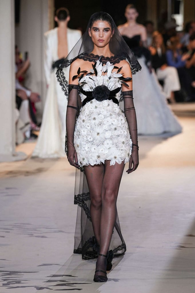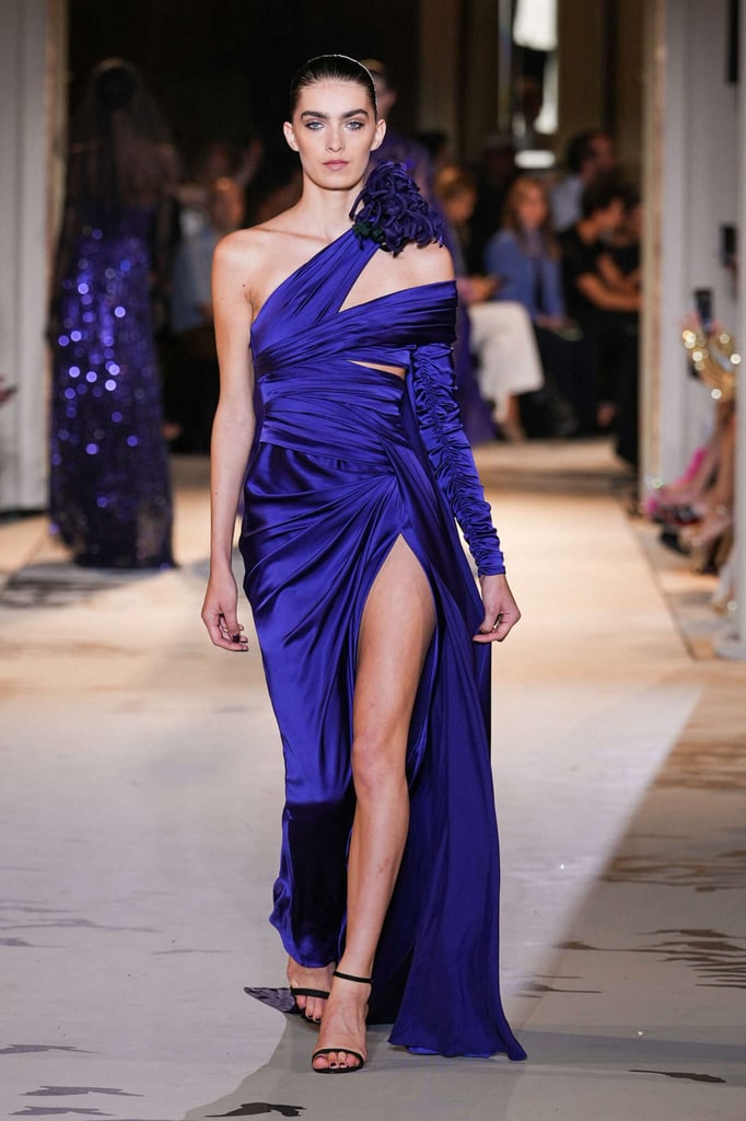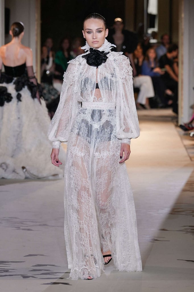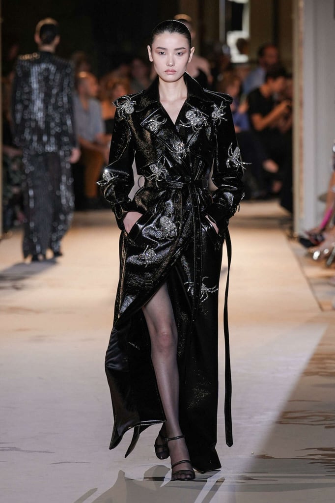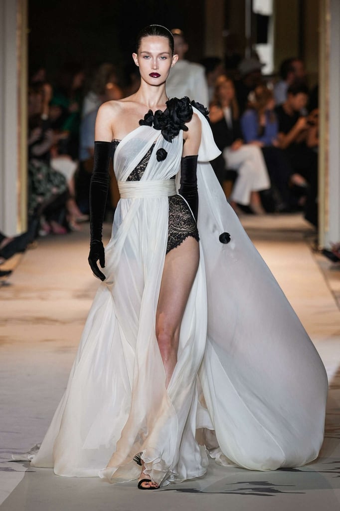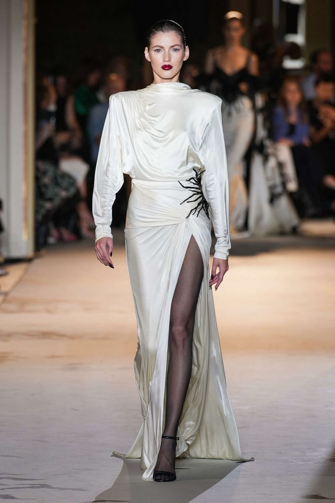 DEFILE ZUHAIR MURAD A L’HÔTEL POTOCKI: Comme plusieurs autres designers cette saison, le couturier libanais a exprimé son savoir-faire à travers des volumes plus sobres et des créations moins chargées de broderies et de pierreries qu’à son habitude. Des silhouettes en dentelle accompagnent des looks plissés et drapés. Intitulée « Midnight scent » (Parfum de minuit), la collection habille de mystérieuses femmes fatales, de séduisantes vampires et des princesses gothiques. Les robes brodées semi-transparentes osent des empiècements en dentelle, portées avec des blazers en velours ajourés à la taille, des voiles en gaze et des décorations en plumes d’autruche. Les jeux de proportions sont présents avec de longues traînes fluides, des jupes longues construites avec des fleurs en organza, des cascades de volants aux épaules et des vestes courtes d’inspiration florale. Les silhouettes les plus classiques, associant un bustier avec une jupe fendue sur le côté, côtoient des looks spécialement conçus pour les tapis rouges, comme une combinaison semi-transparente brodée de cristaux reproduisant une toile d’araignée ou des mini-robes brodées de forme tulipe. Certains vêtements sont plus informels, mais confectionnés avec un savoir-faire couture, comme un long manteau noir décoré de tarentules brillantes ou des jupes drapées, portées avec de longs gants et des tops lacés.