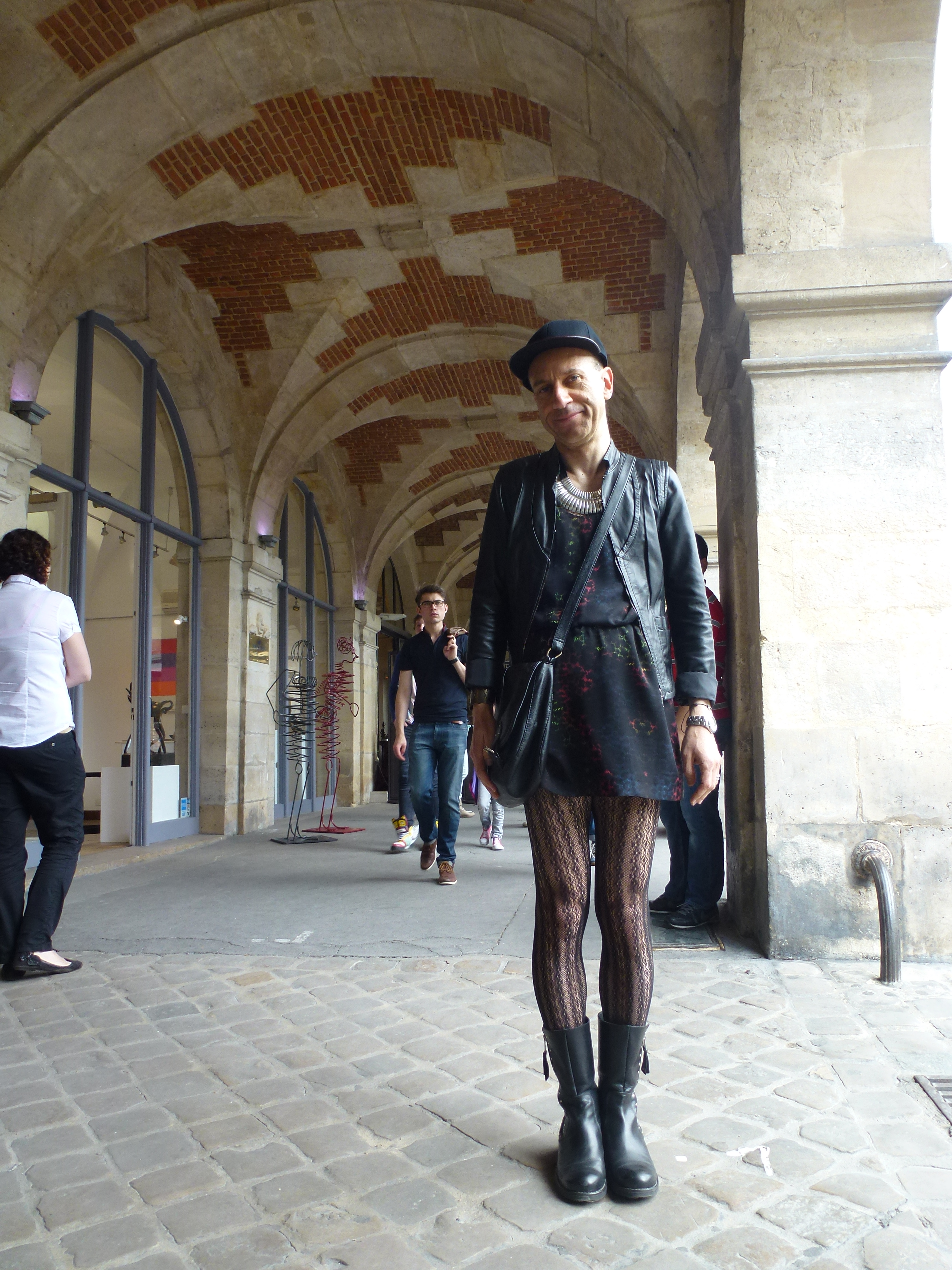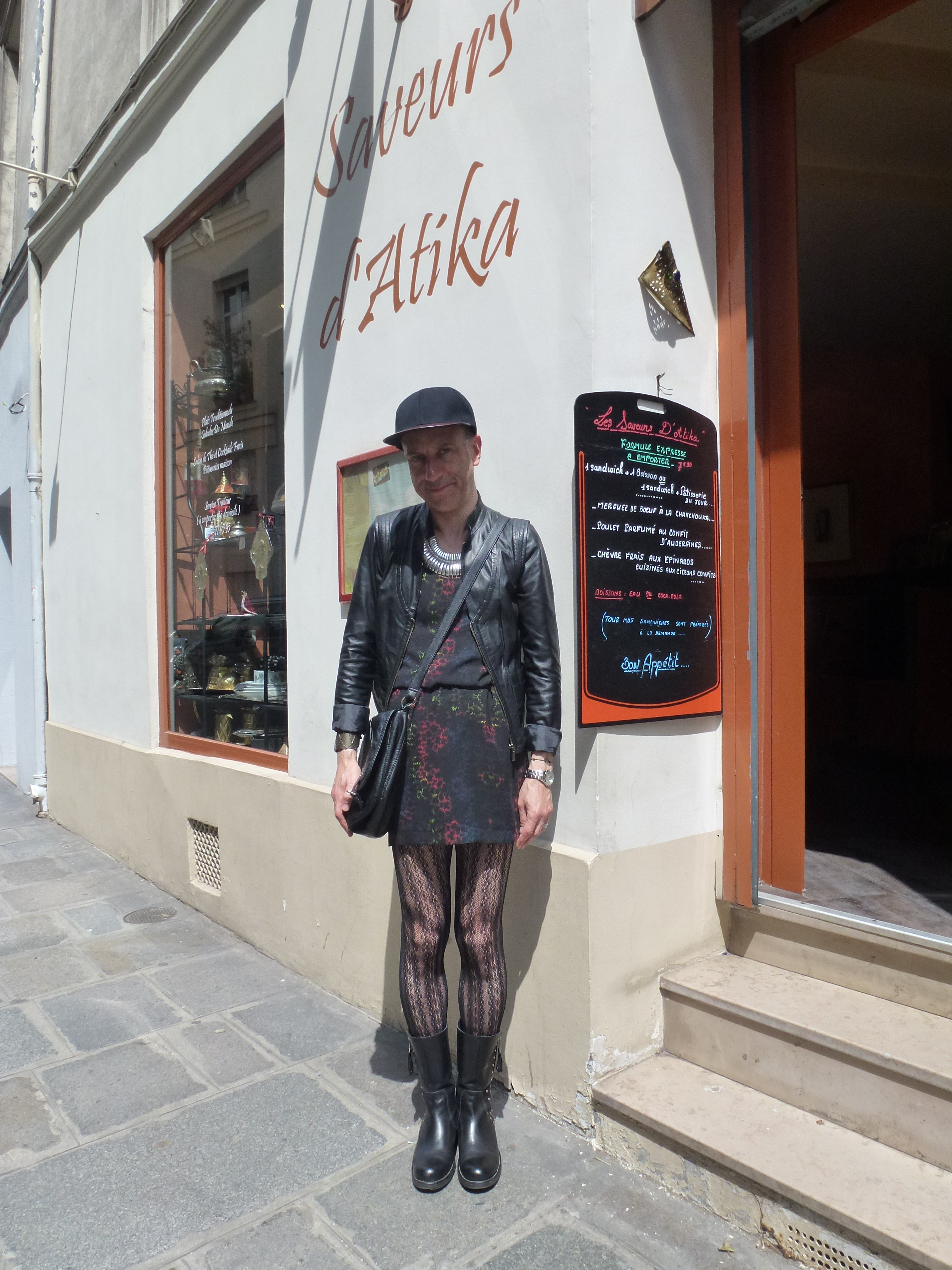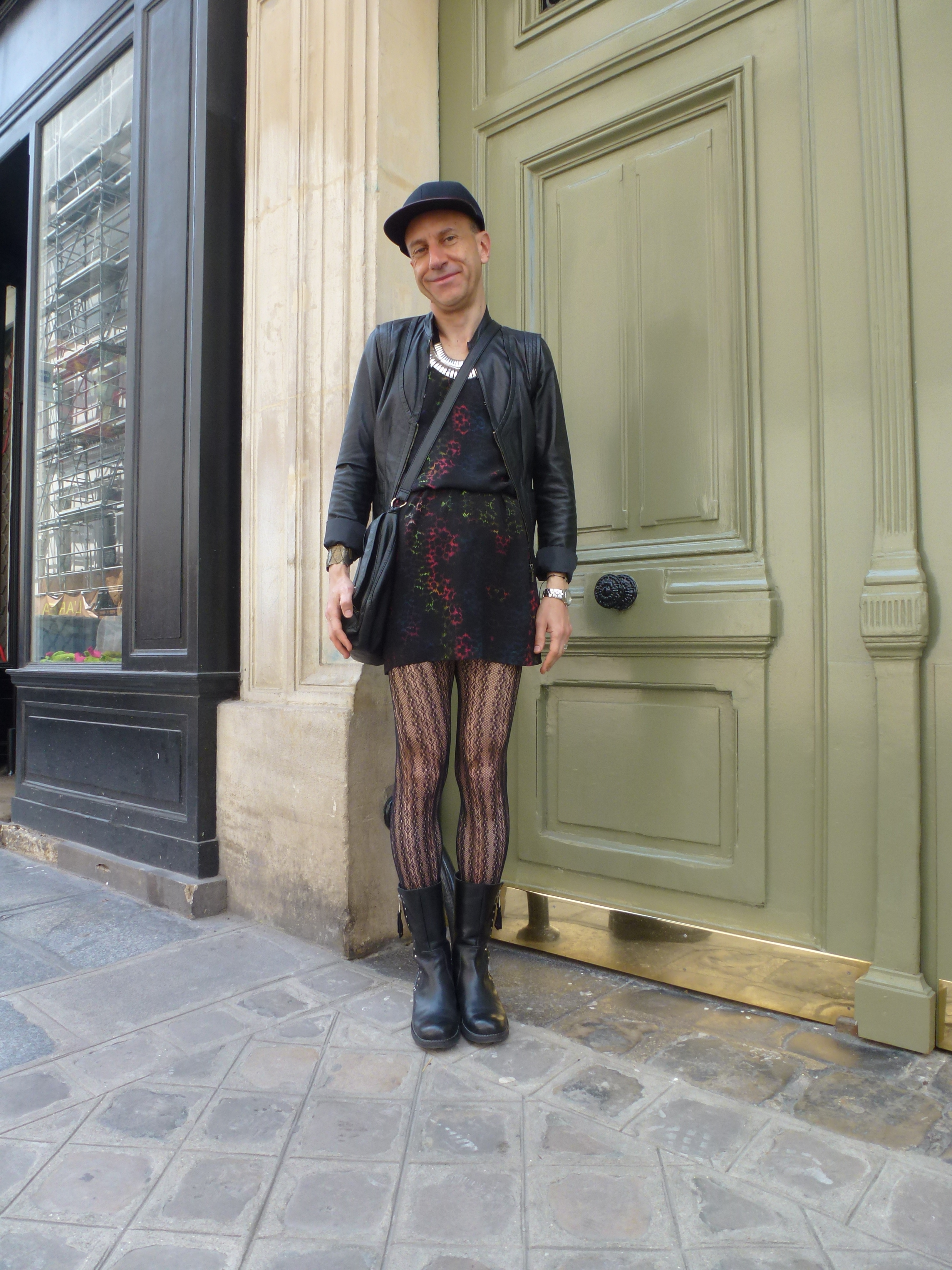 Robe bi-matière soie/modal: Les Petites; blouson en cuir: Les Petites; chapeau: Super Duper (chez Baron Y), avec broche-tête de cheval couleur or rajoutée; collier et manchette: Satellite; sautoirs et bagues: Satellite et Clara Jasmine; collant résille: Tabio; chaussettes: Falke; chaussures: Minelli (couleur chocolat, à mon avis une des plus belles paires de la collection actuelle); sac: Lafayette Collection.
