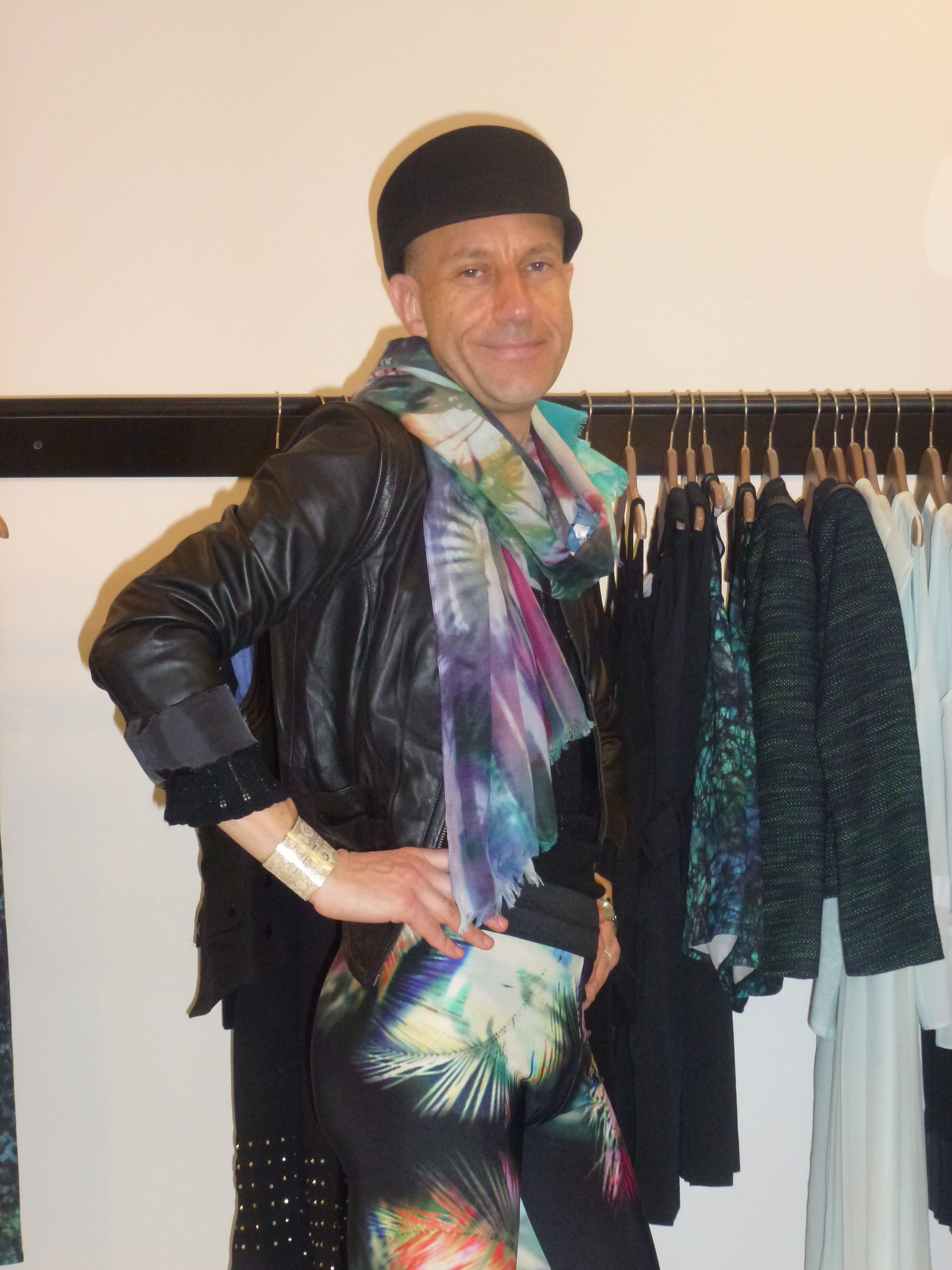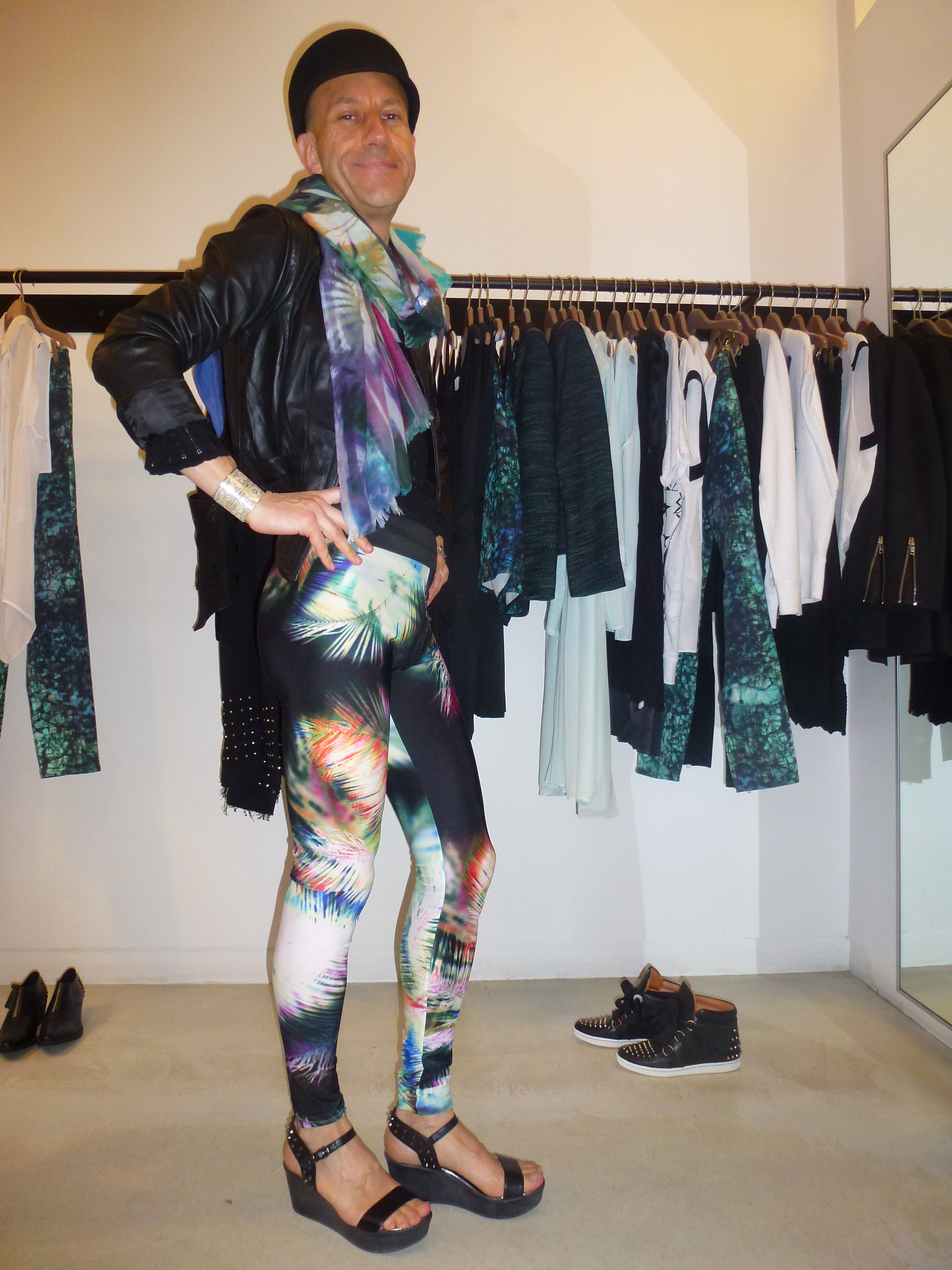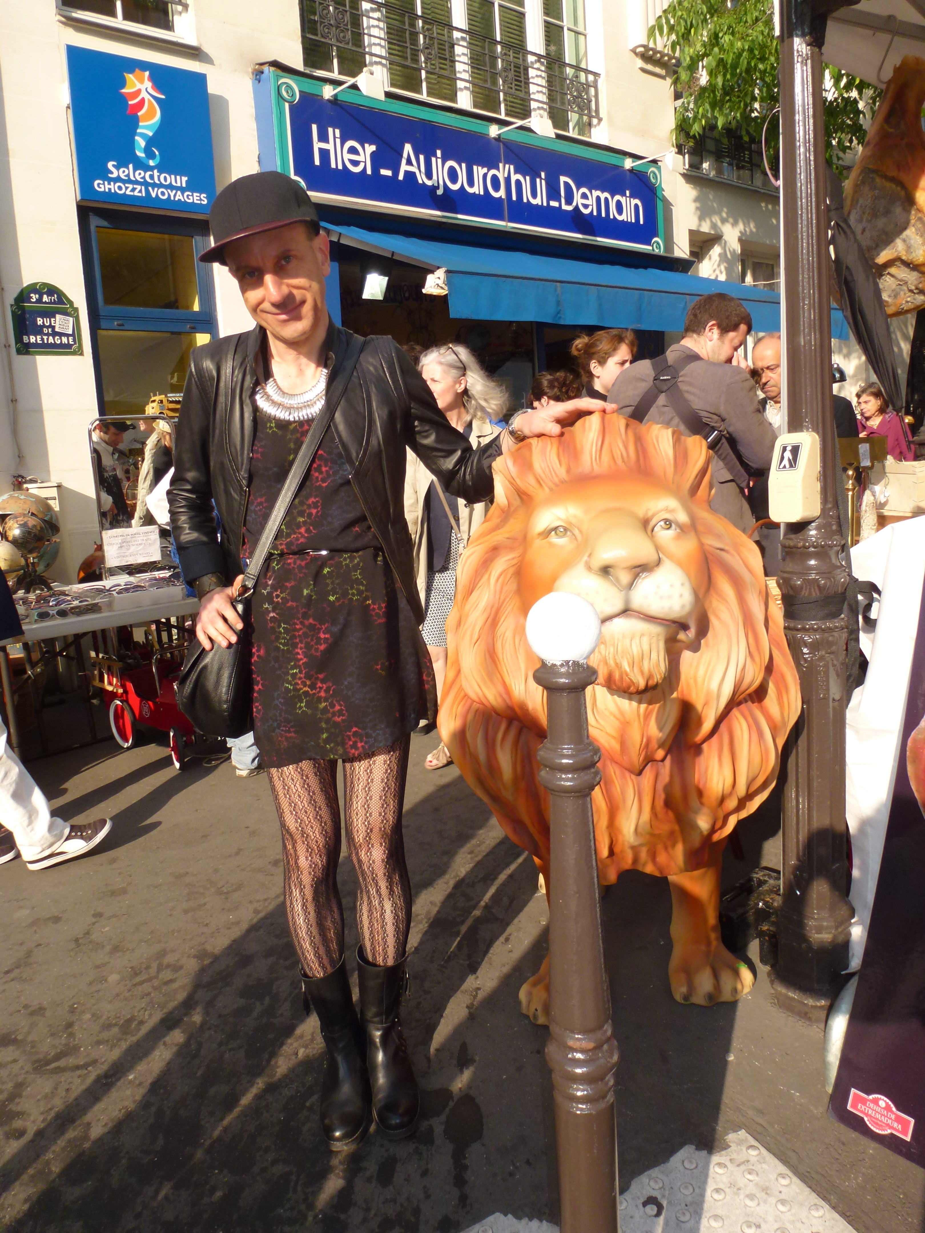 Robe bi-matière soie/modal: Les Petites; blouson en cuir: Les Petites; chapeau: Super Duper (chez Baron Y), avec broche-tête de cheval couleur or rajoutée; collier et manchette: Satellite; sautoirs et bagues: Satellite et Clara Jasmine; collant résille: Tabio; chaussettes: Falke; chaussures: Minelli (couleur chocolat, à mon avis une des plus belles paires de la collection actuelle); sac: Lafayette Collection.