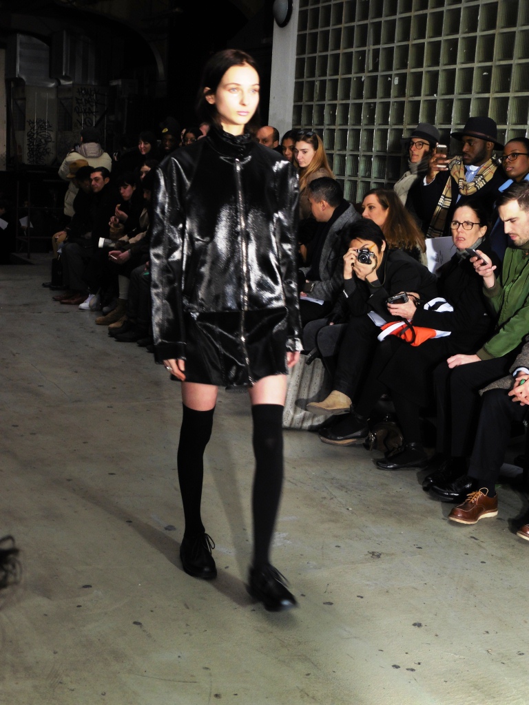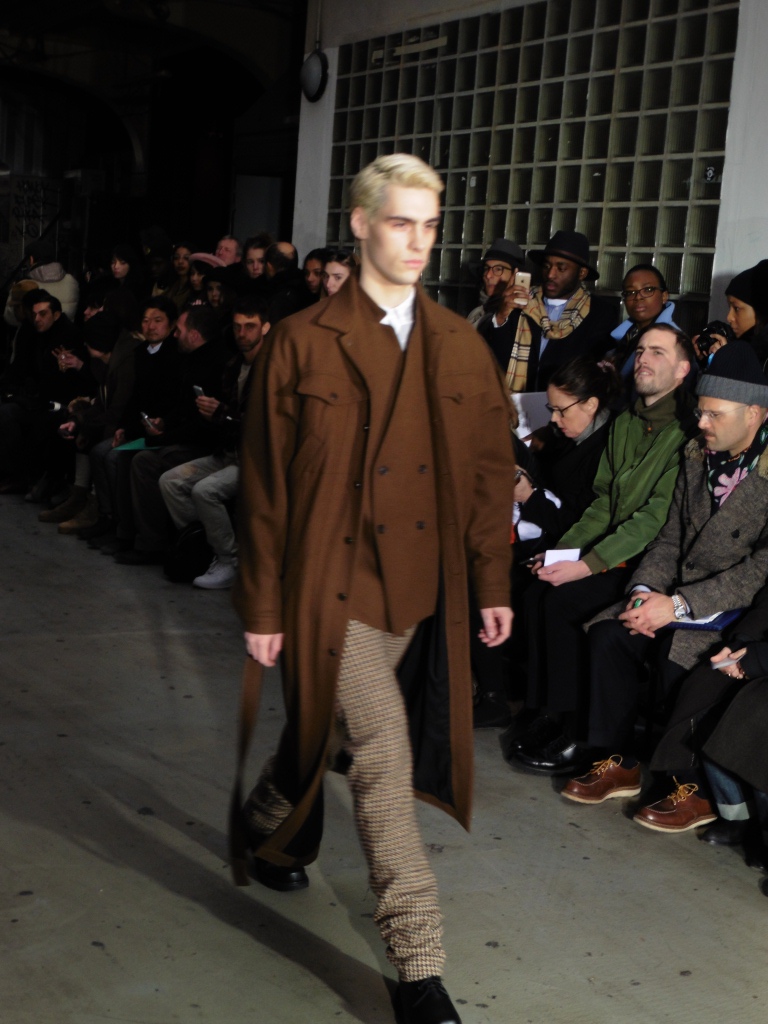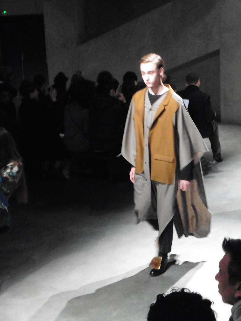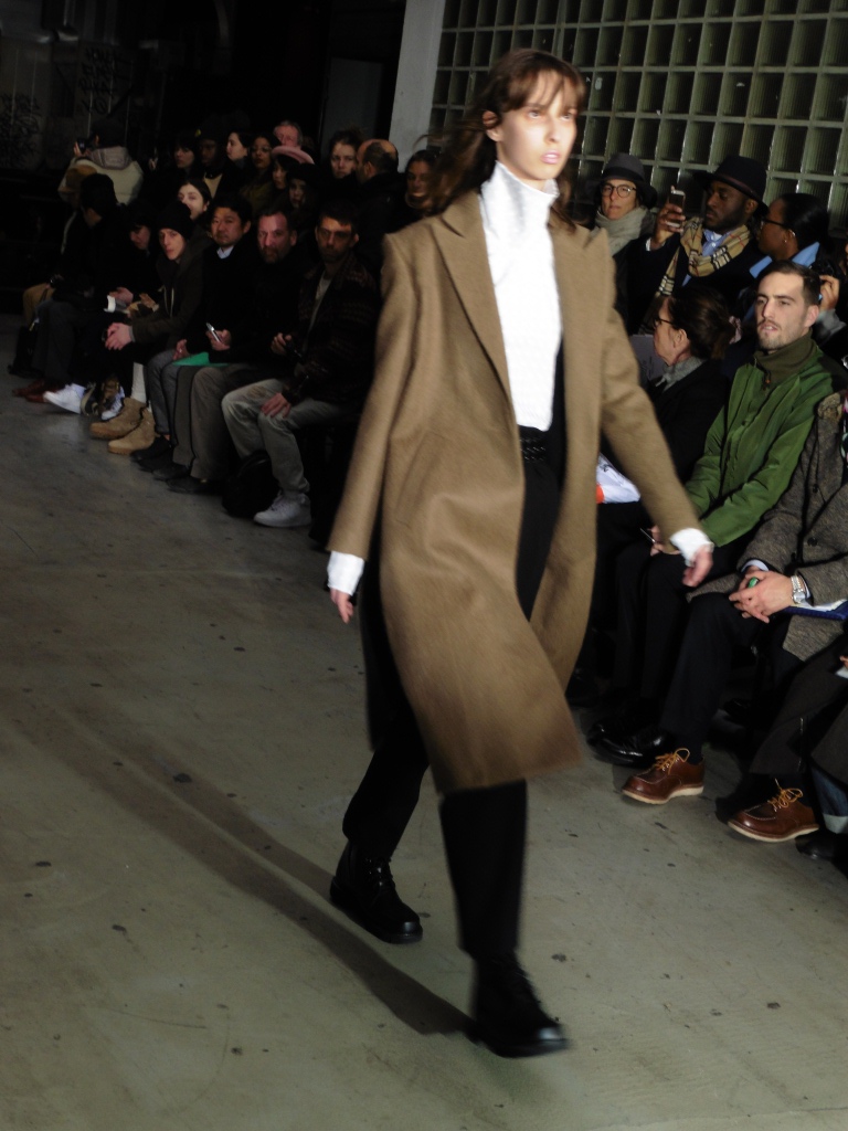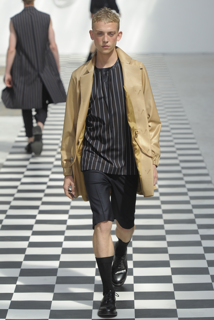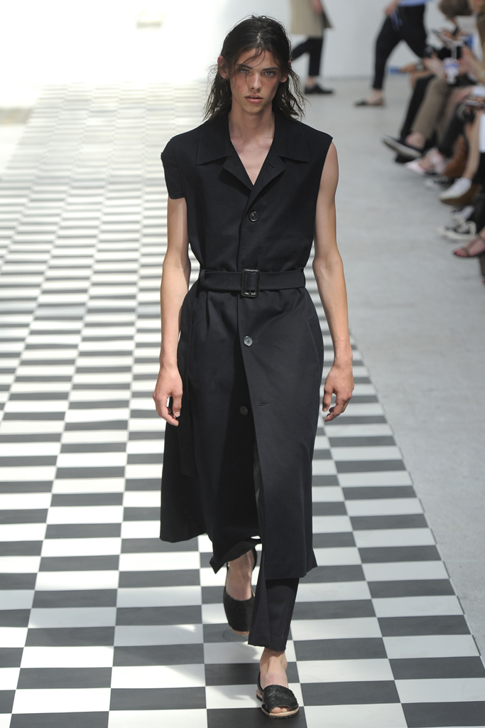Défilé 22/4_Hommes au Garage Turenne: la marque allemande, qui pose les bases d’une garde-robe unisexe, nous a présenté une collection centrée sur le trench comme pièce phare: celui-ci apparaît avec ou sans manches, ceinturé ou non, et sa gabardine imperméable se retrouve aussi en pantalons et pardessus. Shorts, pantalons étroits ou extra-larges. Des silhouettes d’une grande légèreté; le contraste avec des cols plus stricts donne une touche de modernité. On aperçoit aussi les rayures fines, une des tendances fortes de cette saison. Une collection d’un grand chic et très engageante!