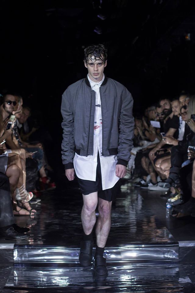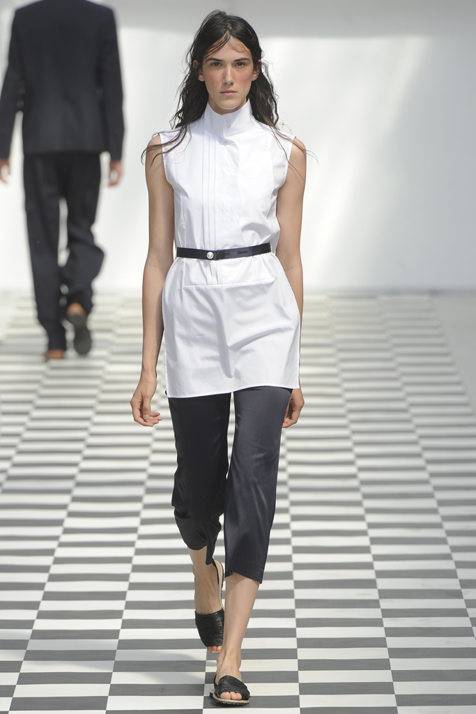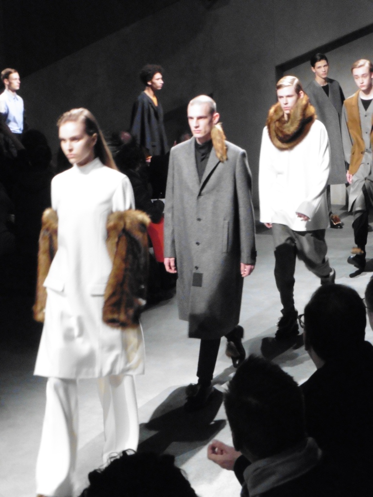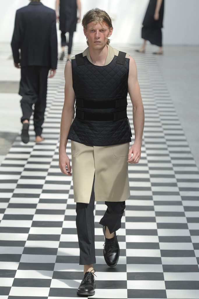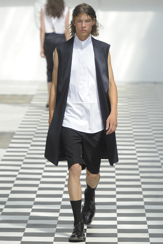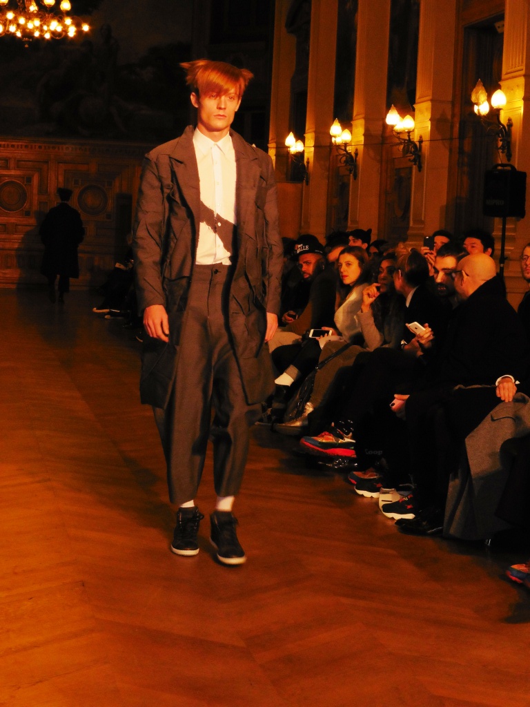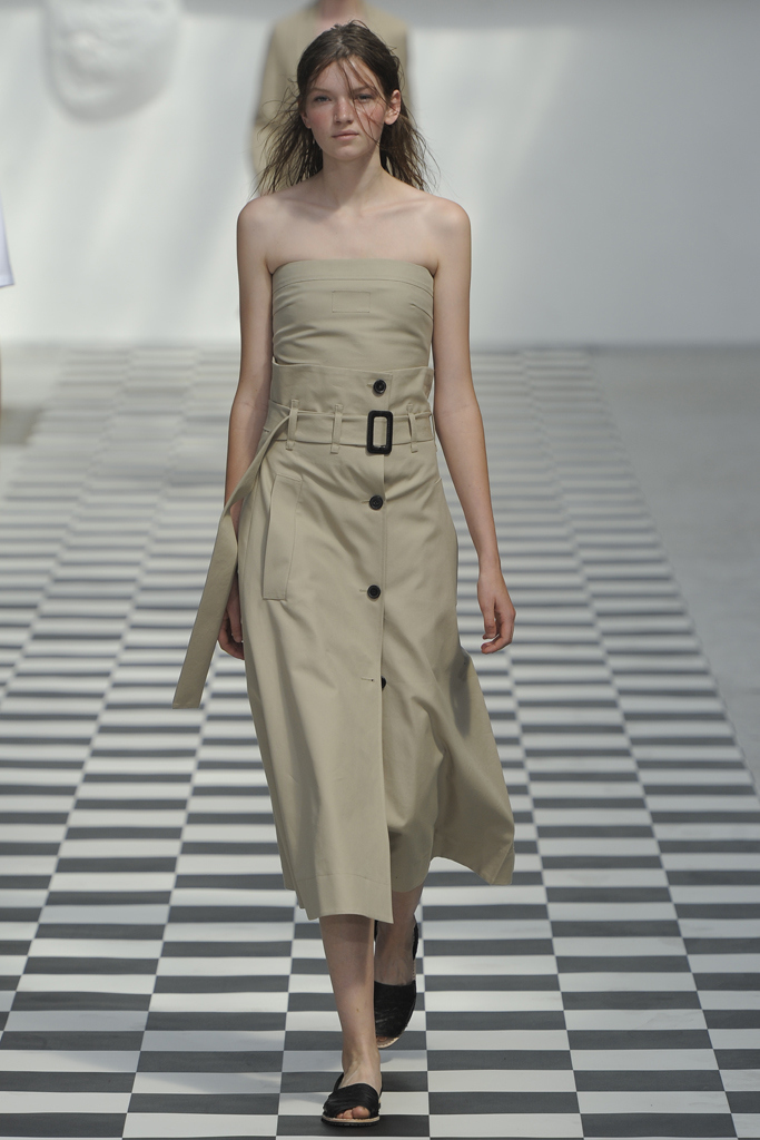 Défilé 22/4_Hommes au Garage Turenne: la marque allemande, qui pose les bases d’une garde-robe unisexe, nous a présenté une collection centrée sur le trench comme pièce phare: celui-ci apparaît avec ou sans manches, ceinturé ou non, et sa gabardine imperméable se retrouve aussi en pantalons et pardessus. Shorts, pantalons étroits ou extra-larges. Des silhouettes d’une grande légèreté; le contraste avec des cols plus stricts donne une touche de modernité. On aperçoit aussi les rayures fines, une des tendances fortes de cette saison. Une collection d’un grand chic et très engageante!
