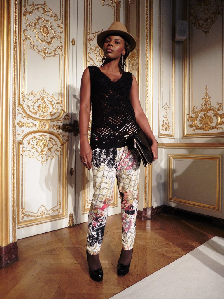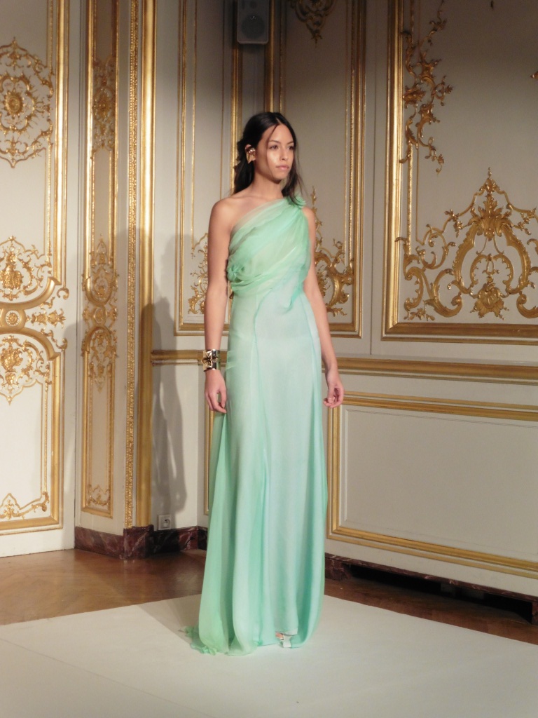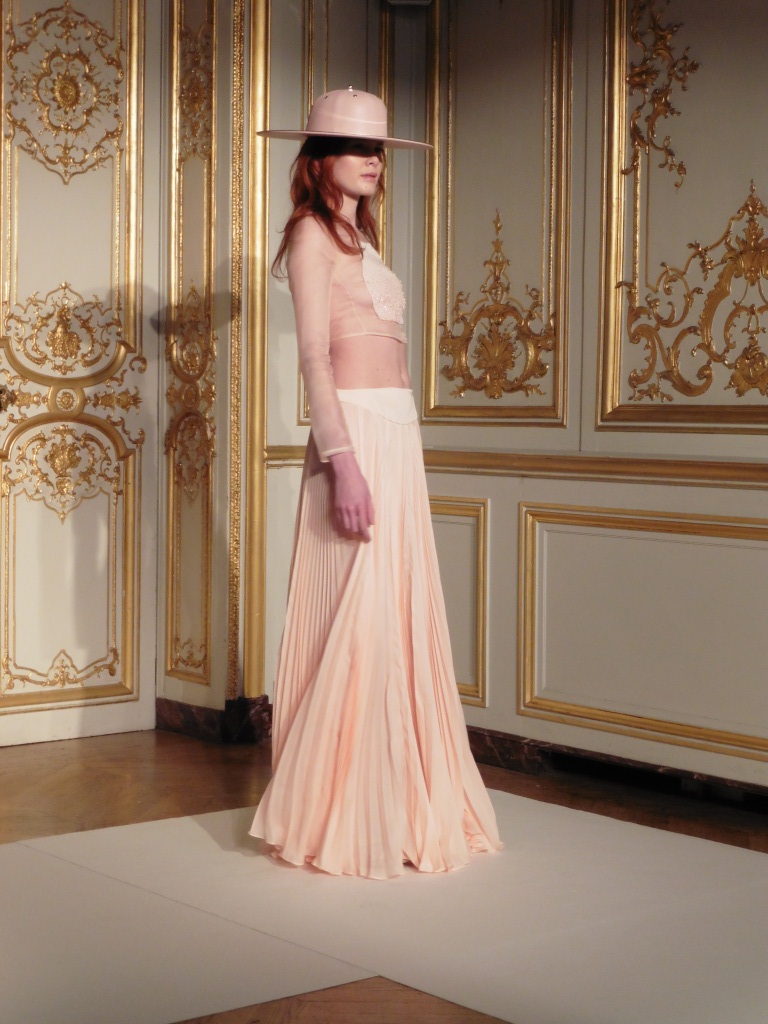 Défilé Alexandre Delima aux Salons France-Amériques: une collection qui bouscule certains codes de la haute couture. Robes longues ou non, mais aussi smoking, combinaison pantalon et short. Palette de couleurs tendre; opposition des ivoires à un noir profond. Transparence et opacité. Noblesse des tissus: crêpe-drap, gazar, organza, soie, chèvre velours. Capeline inspirée d’une casquette de basketteur portée sur une robe très féminine. On apprécie l’audace et cette élégance désinvolte toute en sensualité.