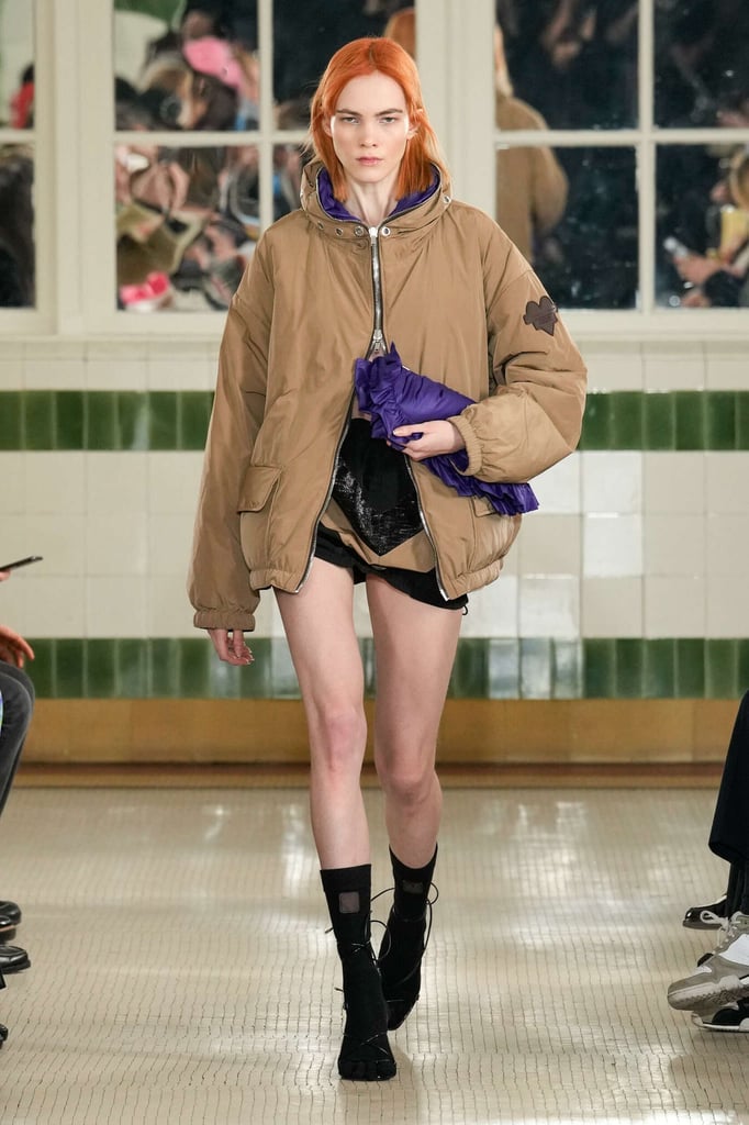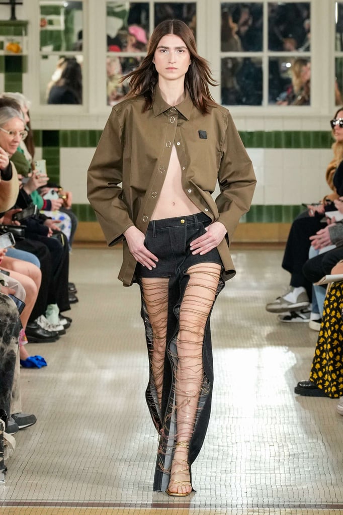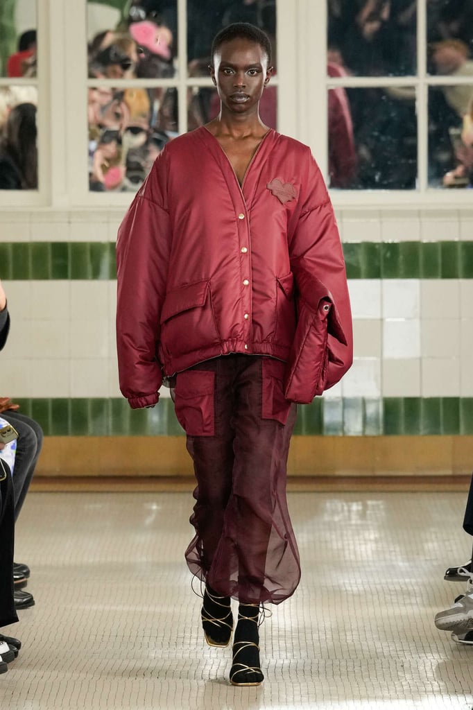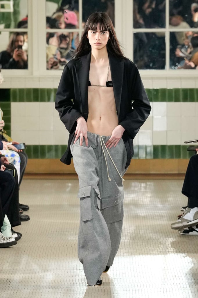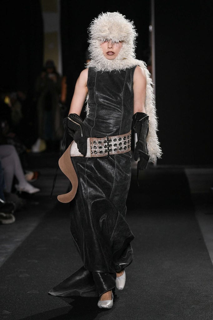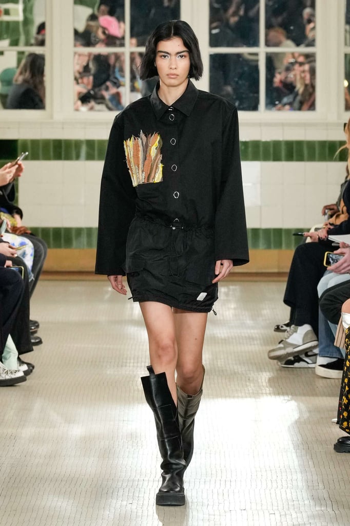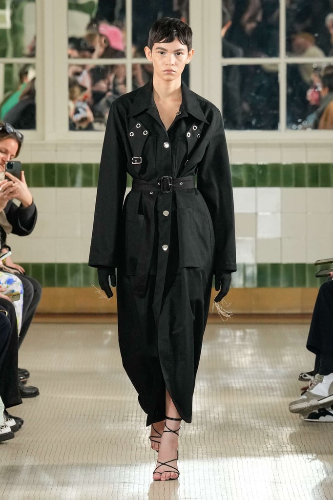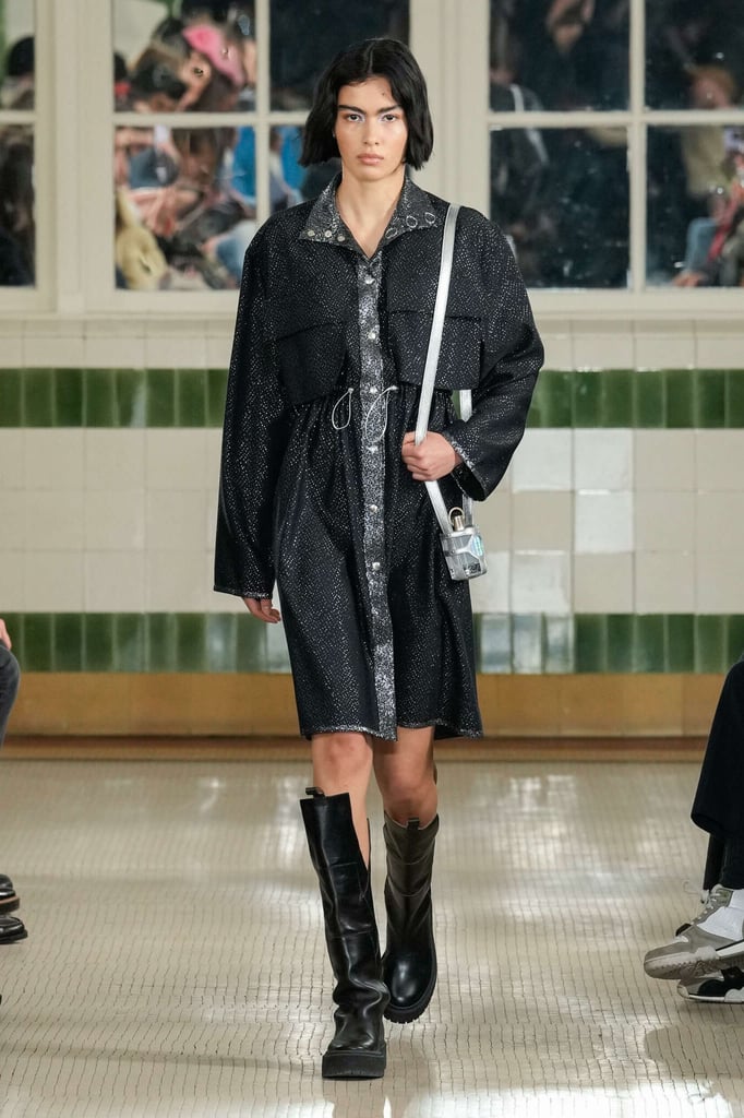 DEFILE COURREGES DANS UNE ECOLE D’ARCHITECTURE DU 5EME: Sous l’impulsion de son directeur artistique Nicolas di Felice la marque française connaît un retour en scène fulgurant. Le défilé s’ouvre avec des mannequins qui semblent surgir du brouillard urbain, vêtus de manteaux cocons, sweats à capuche, vestes en cuir, latex, laine à carreaux et plastique verni emblématique de Courrèges. Le tout est coupé de fentes verticales laissant sortir les bras pour tenir les téléphones incontournables de nos vies modernes. Ces looks sont pour la plupart associés à des cuissardes en cuir stretch montant jusqu’à l’aine. Des tissus plus décontractés viennent se substituer au plastique matelassé: laine fraîche, cuirs légers. Des cercles géométriques sont découpés dans des robes cocktail, tops et fourreaux épurés en cuir. La collection évolue ensuite vers des drapés et de remarquables tops semi-transparents, ajoutés à de longues jupes fendues à traîne. Puis une série de mini-robes du soir aux magnifiques drapés, dont certaines affichent avec fierté le nom de la marque en gros caractères.
