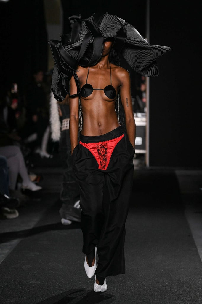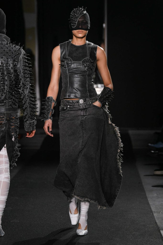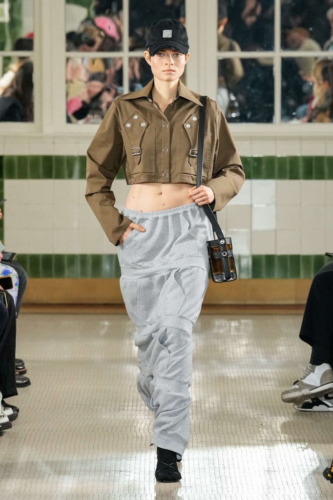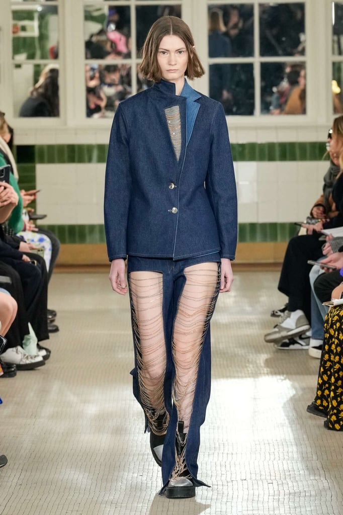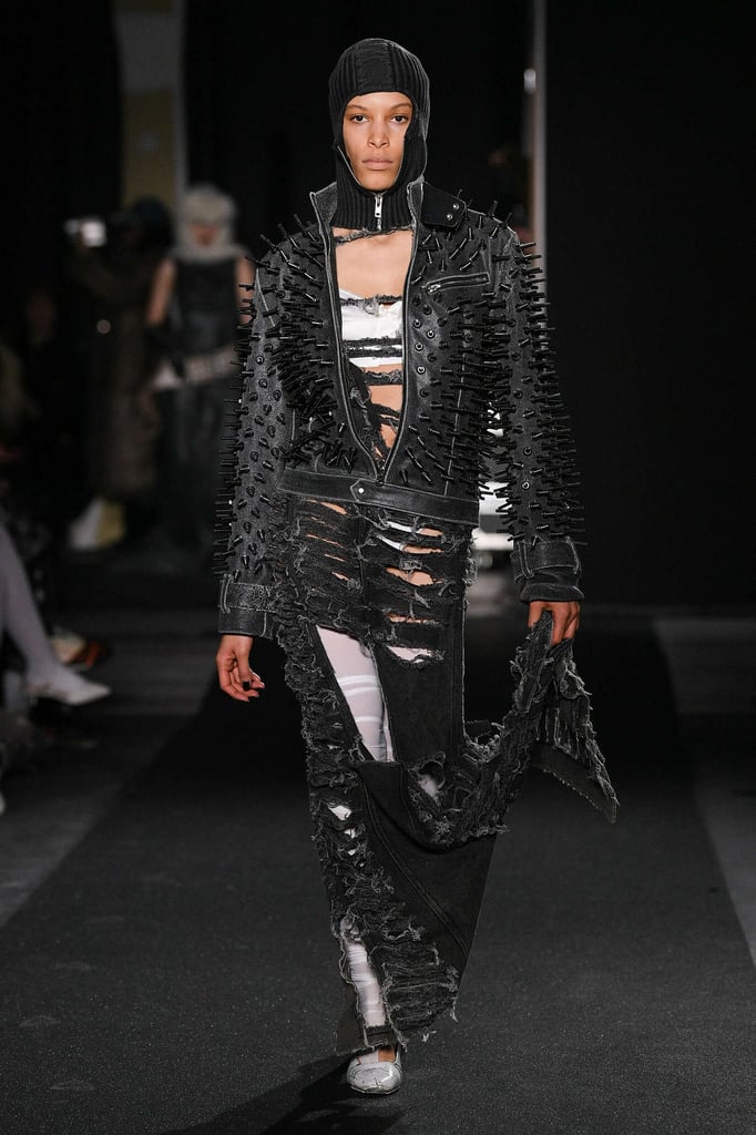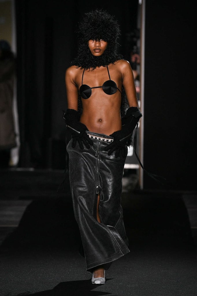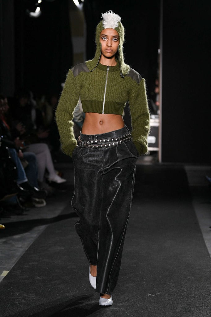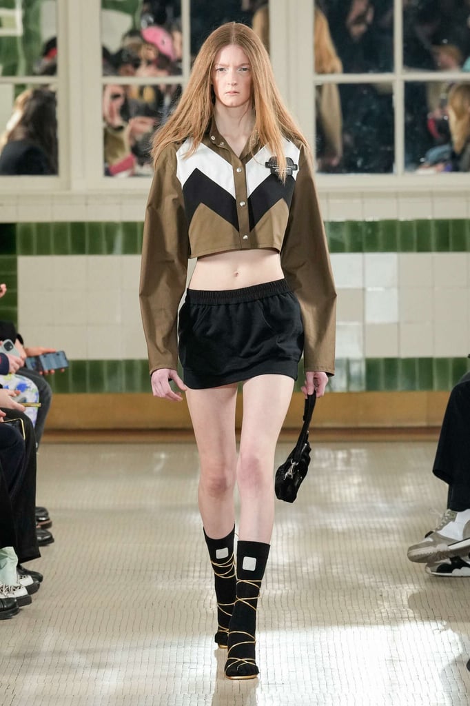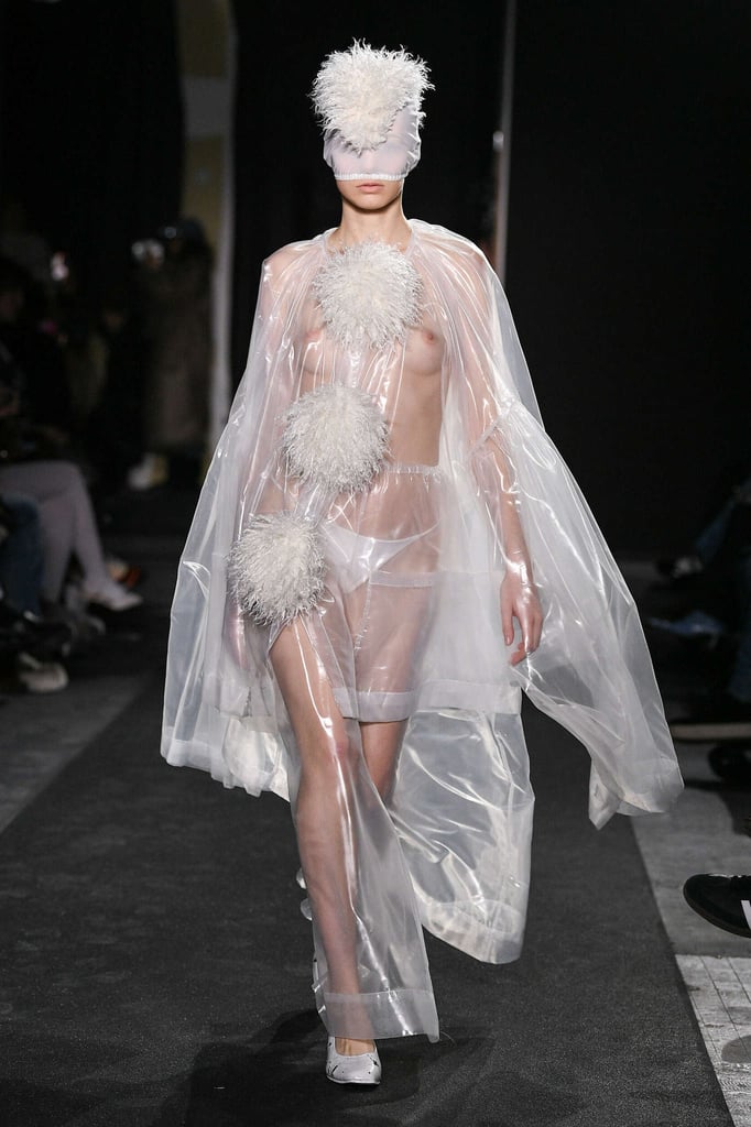 DEFILE COURREGES DANS UNE ECOLE D’ARCHITECTURE DU 5EME: Sous l’impulsion de son directeur artistique Nicolas di Felice la marque française connaît un retour en scène fulgurant. Le défilé s’ouvre avec des mannequins qui semblent surgir du brouillard urbain, vêtus de manteaux cocons, sweats à capuche, vestes en cuir, latex, laine à carreaux et plastique verni emblématique de Courrèges. Le tout est coupé de fentes verticales laissant sortir les bras pour tenir les téléphones incontournables de nos vies modernes. Ces looks sont pour la plupart associés à des cuissardes en cuir stretch montant jusqu’à l’aine. Des tissus plus décontractés viennent se substituer au plastique matelassé: laine fraîche, cuirs légers. Des cercles géométriques sont découpés dans des robes cocktail, tops et fourreaux épurés en cuir. La collection évolue ensuite vers des drapés et de remarquables tops semi-transparents, ajoutés à de longues jupes fendues à traîne. Puis une série de mini-robes du soir aux magnifiques drapés, dont certaines affichent avec fierté le nom de la marque en gros caractères.
