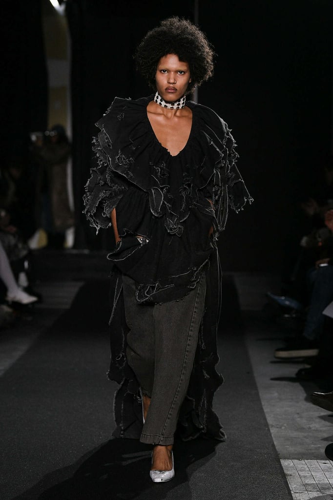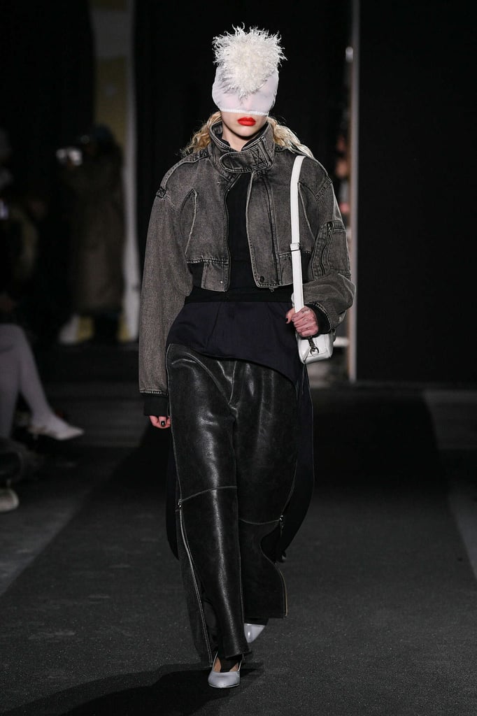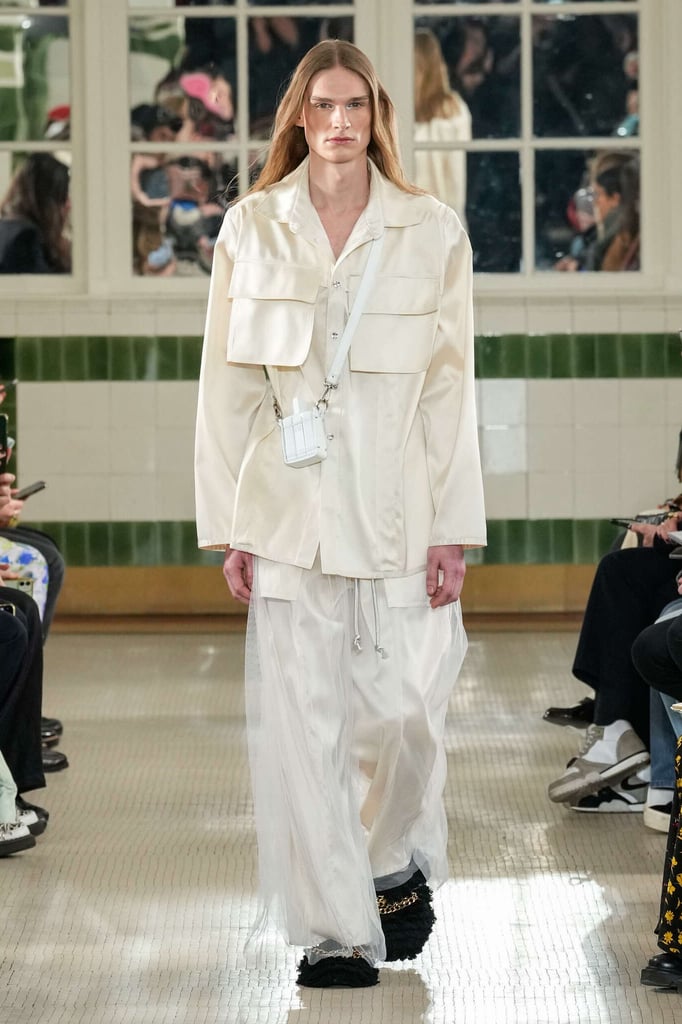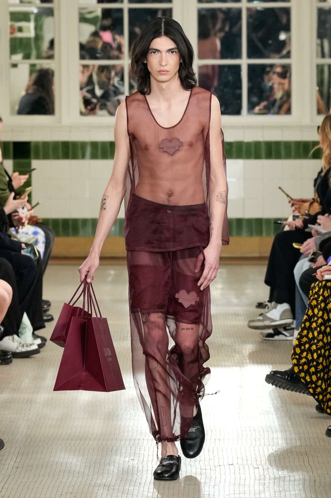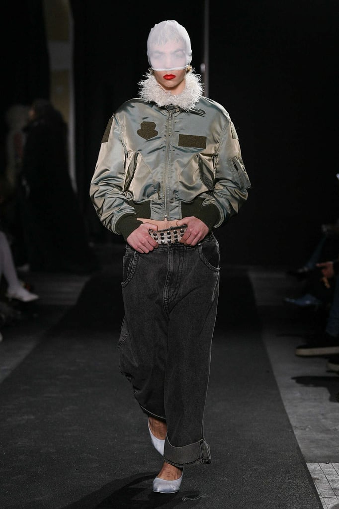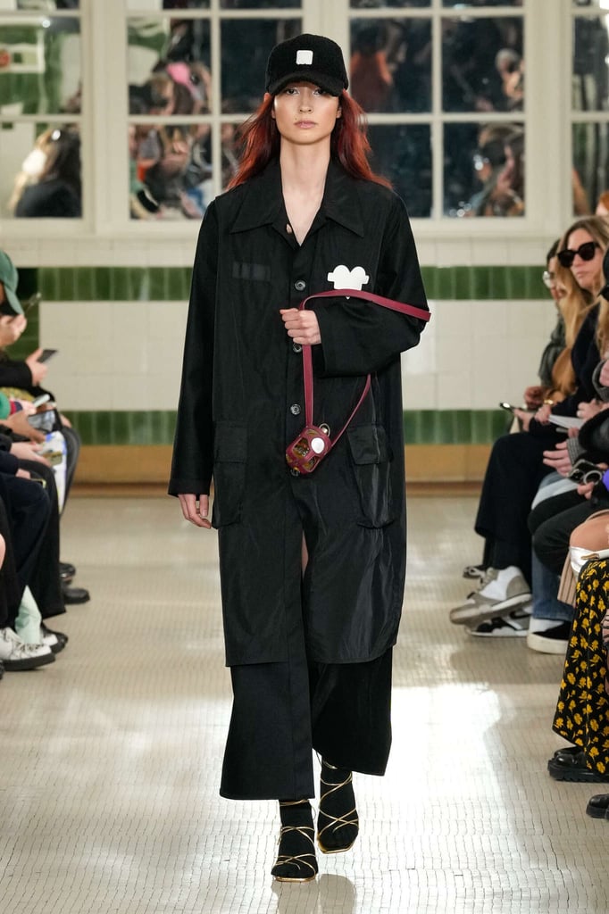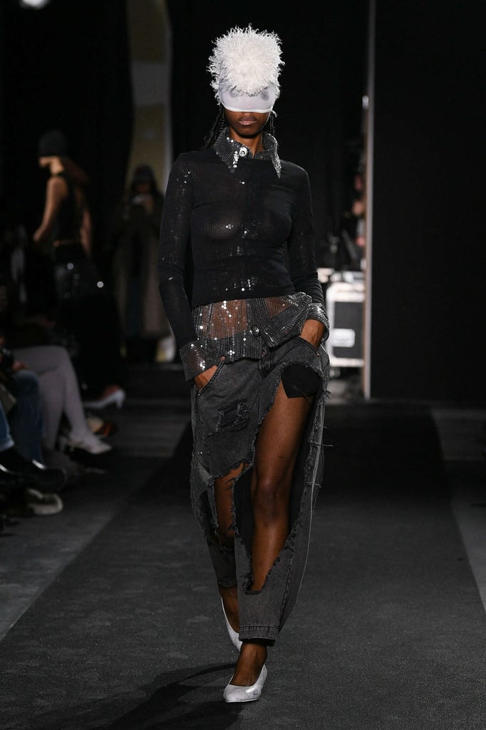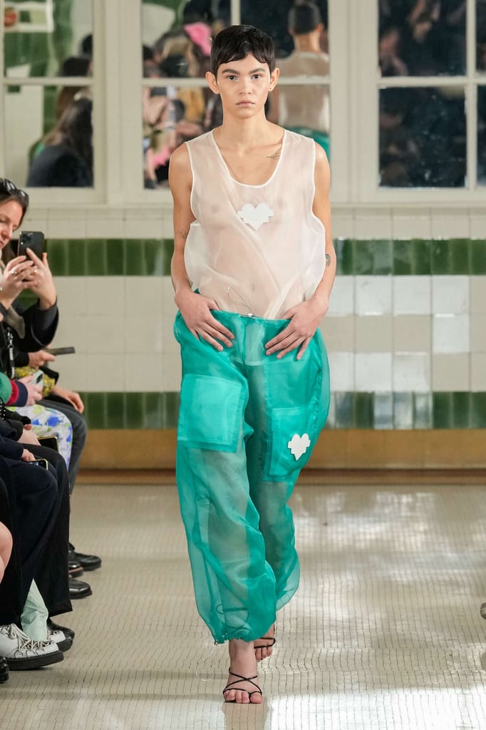 DEFILE COURREGES DANS UNE ECOLE D’ARCHITECTURE DU 5EME: Sous l’impulsion de son directeur artistique Nicolas di Felice la marque française connaît un retour en scène fulgurant. Le défilé s’ouvre avec des mannequins qui semblent surgir du brouillard urbain, vêtus de manteaux cocons, sweats à capuche, vestes en cuir, latex, laine à carreaux et plastique verni emblématique de Courrèges. Le tout est coupé de fentes verticales laissant sortir les bras pour tenir les téléphones incontournables de nos vies modernes. Ces looks sont pour la plupart associés à des cuissardes en cuir stretch montant jusqu’à l’aine. Des tissus plus décontractés viennent se substituer au plastique matelassé: laine fraîche, cuirs légers. Des cercles géométriques sont découpés dans des robes cocktail, tops et fourreaux épurés en cuir. La collection évolue ensuite vers des drapés et de remarquables tops semi-transparents, ajoutés à de longues jupes fendues à traîne. Puis une série de mini-robes du soir aux magnifiques drapés, dont certaines affichent avec fierté le nom de la marque en gros caractères.