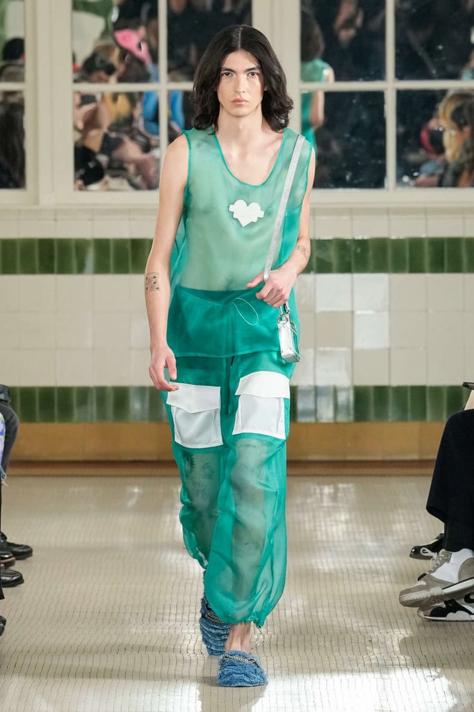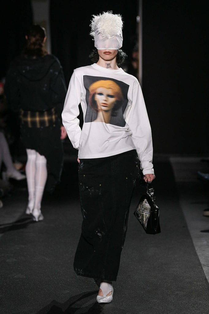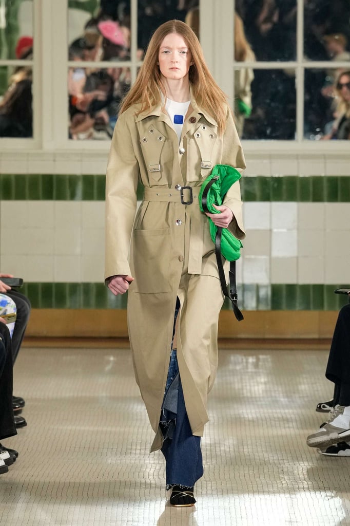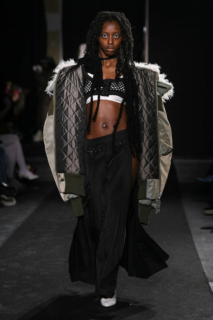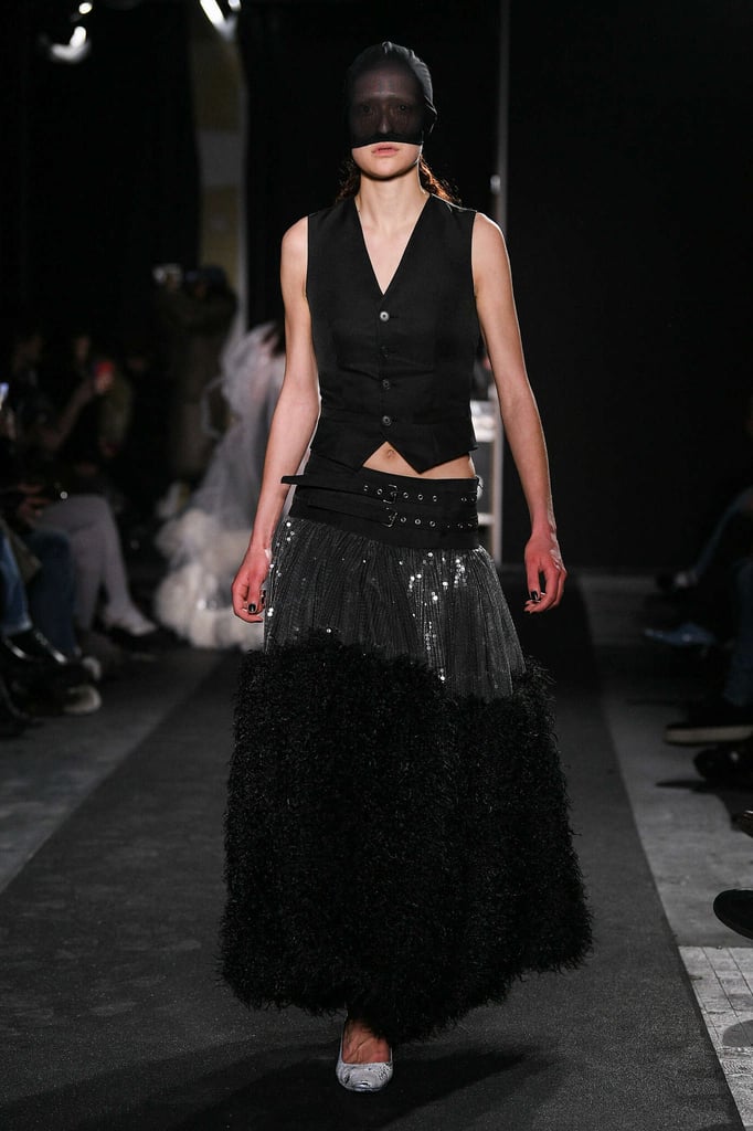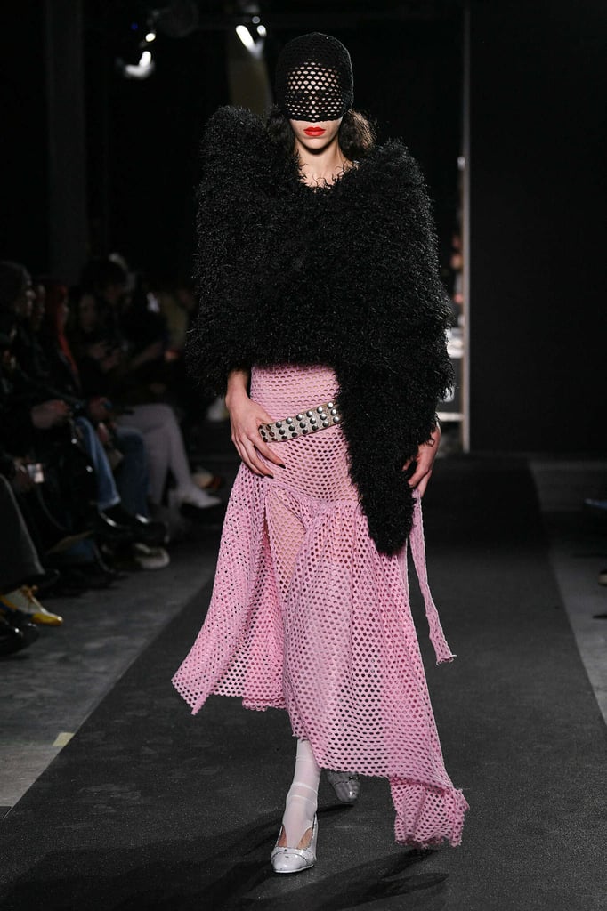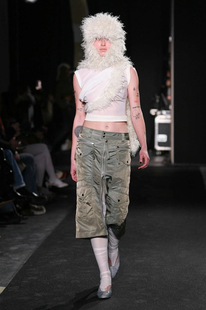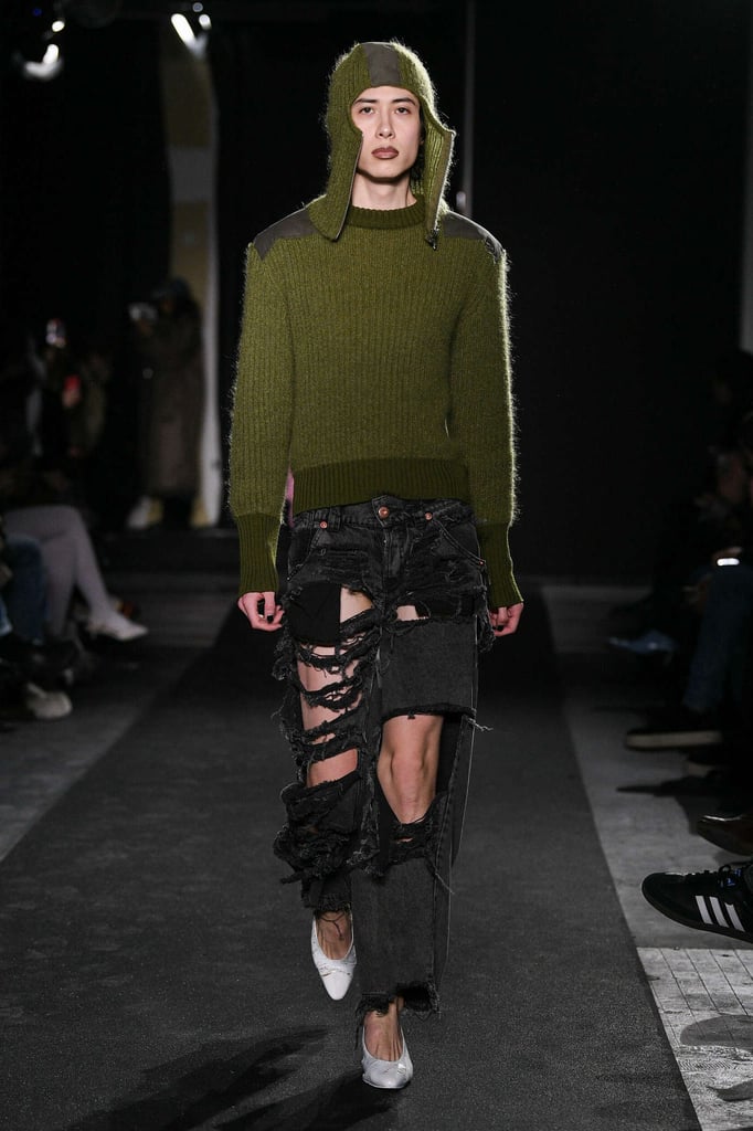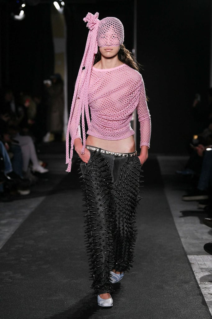 DEFILE COURREGES DANS UNE ECOLE D’ARCHITECTURE DU 5EME: Sous l’impulsion de son directeur artistique Nicolas di Felice la marque française connaît un retour en scène fulgurant. Le défilé s’ouvre avec des mannequins qui semblent surgir du brouillard urbain, vêtus de manteaux cocons, sweats à capuche, vestes en cuir, latex, laine à carreaux et plastique verni emblématique de Courrèges. Le tout est coupé de fentes verticales laissant sortir les bras pour tenir les téléphones incontournables de nos vies modernes. Ces looks sont pour la plupart associés à des cuissardes en cuir stretch montant jusqu’à l’aine. Des tissus plus décontractés viennent se substituer au plastique matelassé: laine fraîche, cuirs légers. Des cercles géométriques sont découpés dans des robes cocktail, tops et fourreaux épurés en cuir. La collection évolue ensuite vers des drapés et de remarquables tops semi-transparents, ajoutés à de longues jupes fendues à traîne. Puis une série de mini-robes du soir aux magnifiques drapés, dont certaines affichent avec fierté le nom de la marque en gros caractères.