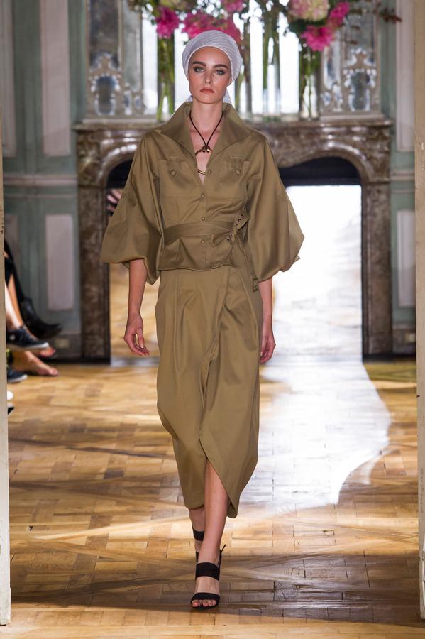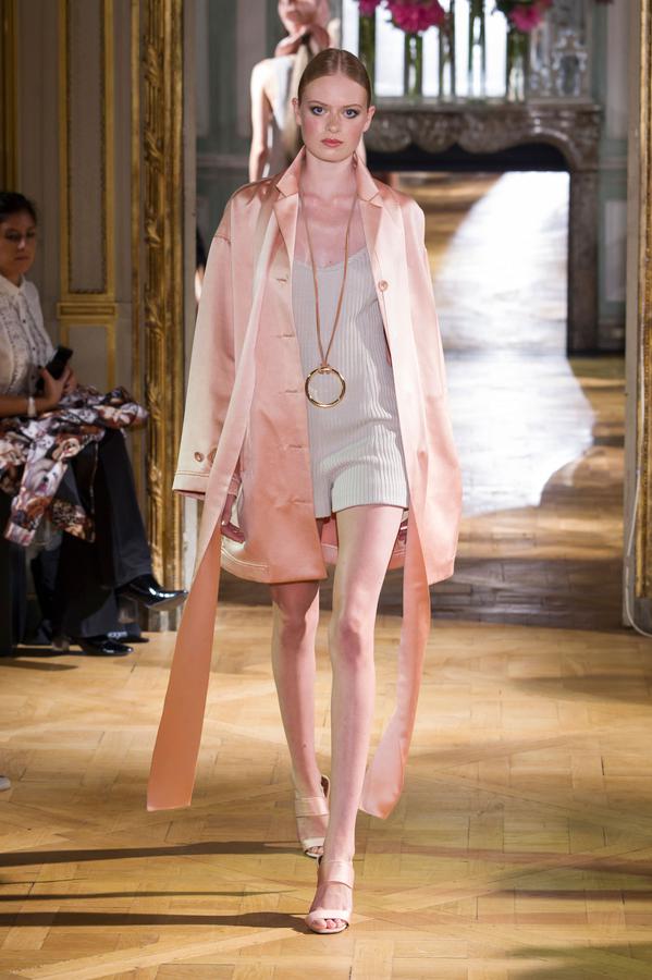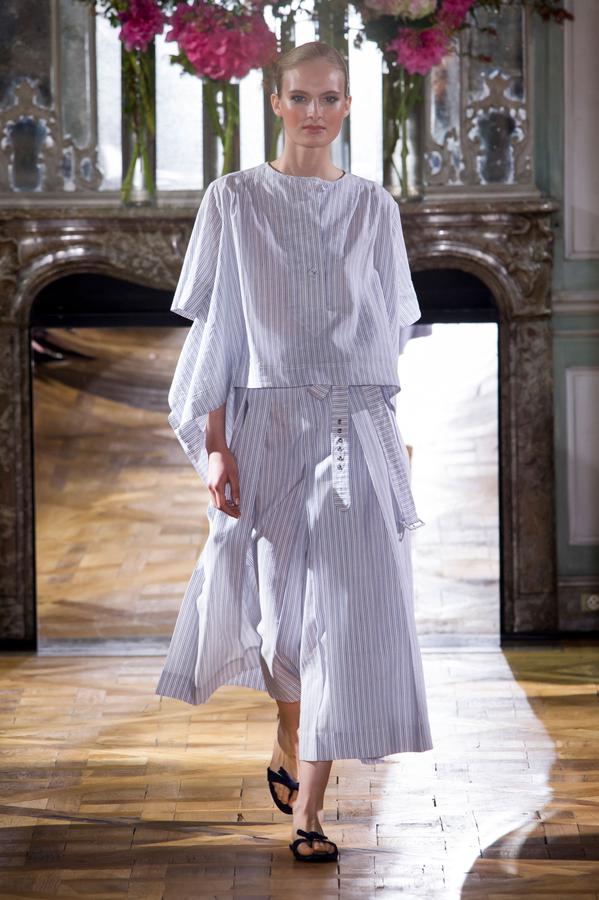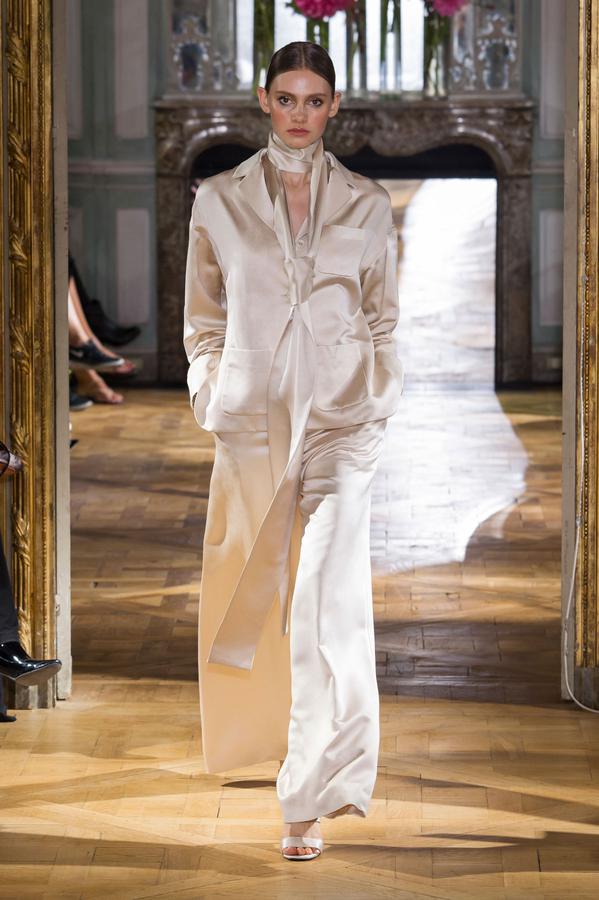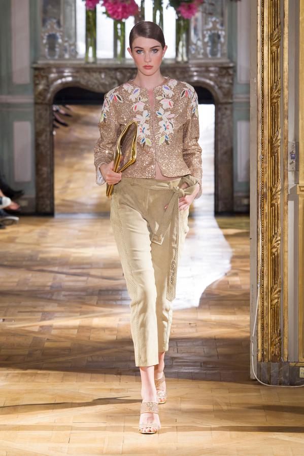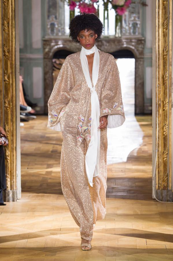 DEFILE PASCAL MILLET A LA FONDATION MONA BISMARCK: pour cette nouvelle collection le créateur français a déclaré s’être inspiré de photos et de films, comme la robe blanche en dentelle portée par la princesse Caroline de Monaco au bal de la Croix-Rouge en 1976, Meryl Streep dans Out of Africa, Bianca Jagger au Studio 54. Ceci conduit à des silhouettes et styles très variés: d’un chic intemporel très glamour à une aventureuse moderne empreinte d’une décontraction nonchalante toute coloniale. Les matières sont toutes aussi diverses: satin ,organza, mousseline plumetis, paillettes, coton, lin. Parmi une riche palette de couleurs raffinées, un kaki très seyant se fait remarquer. Les combinaisons/pantalons et combi-shorts apportent une touche de modernité à cette collection d’une grande élégance.