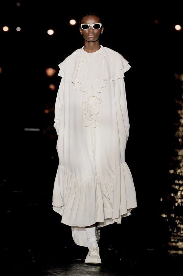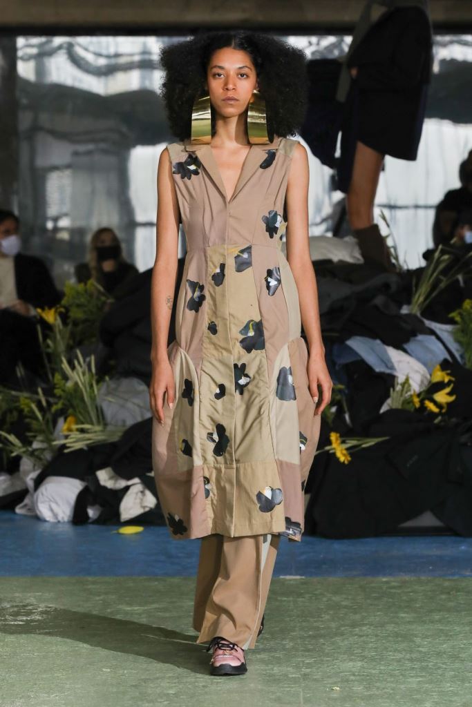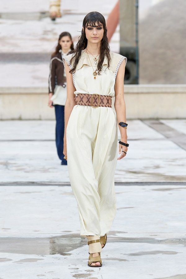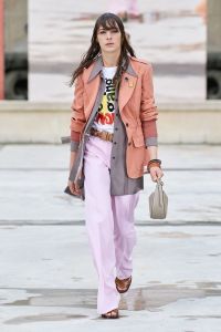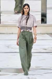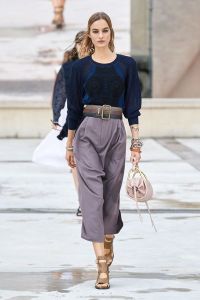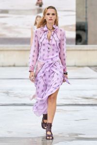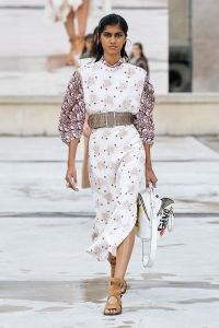 DEFILE CHLOE AU PALAIS DE TOKYO: Dans ce contexte de crise sanitaire, la directrice artistique Natacha Ramsay-Levi a proposé une présentation d’un nouveau genre, en extérieur, combinant physique et digital, puisque parallèlement au défilé classique des mannequins trois écrans géants retransmettaient des images les montrant arriver sur le podium, marcher dans le quartier et discuter entre elles. La collection intitulée « A Season In Hope » met en scène un romantisme version minimaliste, intemporel, avec des robes, caracos et jupes aux lignes droites et en soie pastel, composées de patchworks géométriques liés par des rubans de dentelle ton sur ton, des robes et chemises à imprimés fleuris épurés et sculptés par des ganses, des pantalons fluides et des robes et tops aux lignes structurées. Un hommage est rendu à l’artiste et activiste américaine Corita Kent au travers de cinq sérigraphies reproduites sur différentes pièces de la collection.
